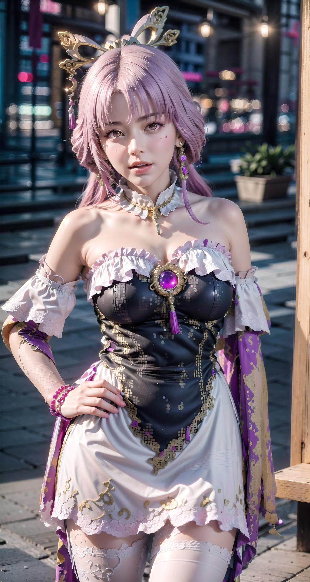 全身:long hair, bangs, hair ornament, bare shoulders, pink hair, dress, parted bangs, purple hair, hair rings, facial mark, detached sleeves, breasts, pantyhose, white pantyhose, jewelry, yellow eyes, white thighhighs, pink eyes, very long hair, earrings, white dress