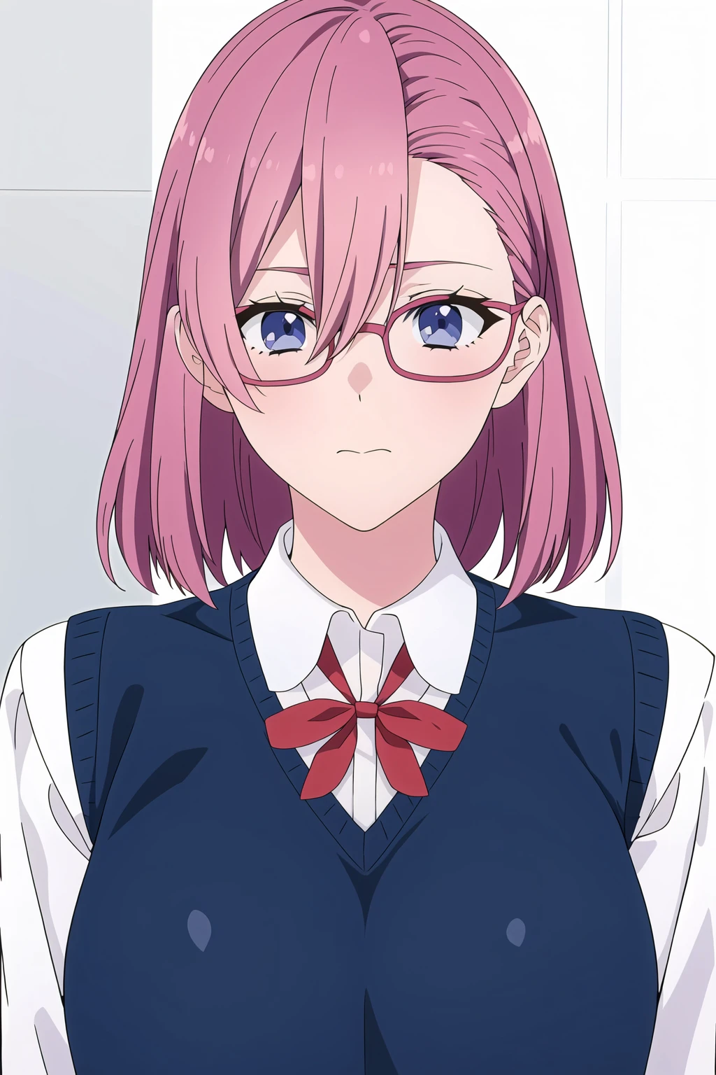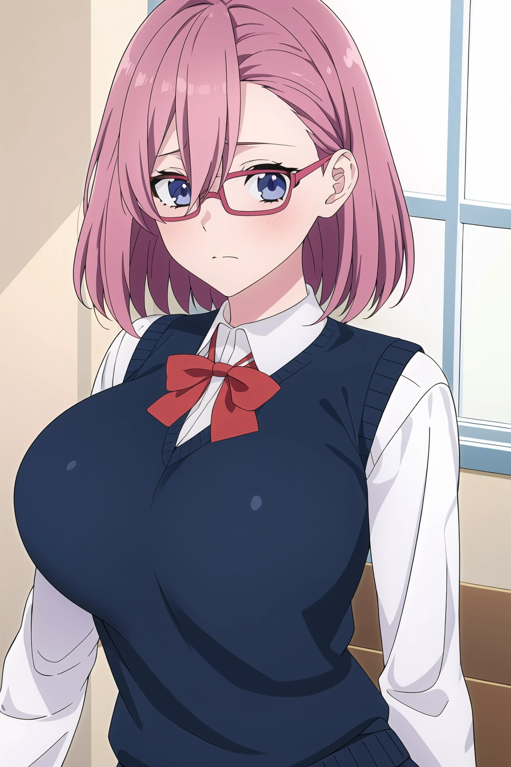 school uniform, long sleeves, white shirt, Blue sweater vest,red ribbon,