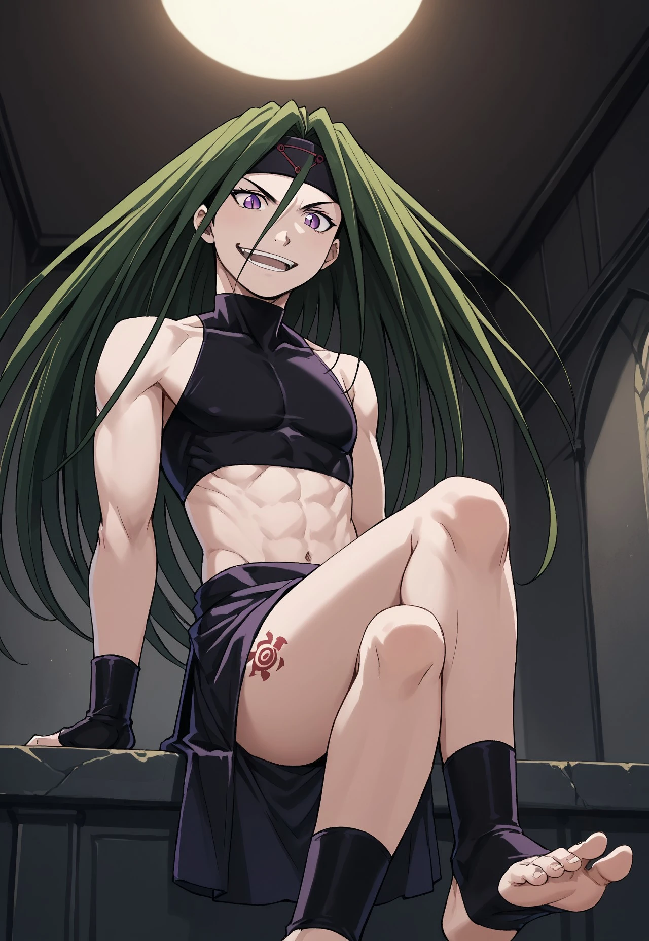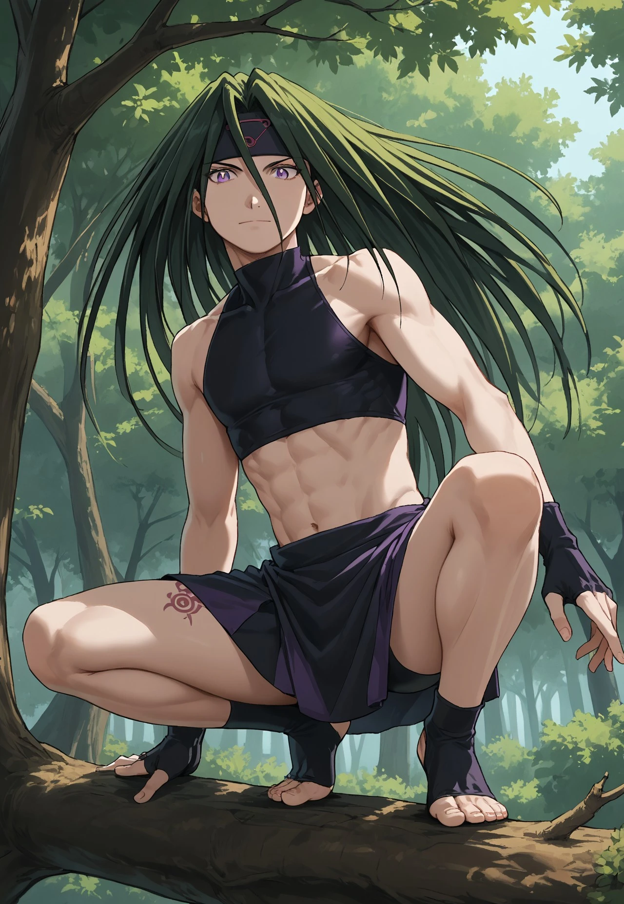1boy, male, solo, skinny, slim body type, long hair, green hair, purple eyes, (((slit pupils))), headband, crop top, bare shoulders, midriff, gloves, fingerless gloves, skirt, side slit, bike shorts under skirt, bike shorts, toeless legwear, leg tattoo