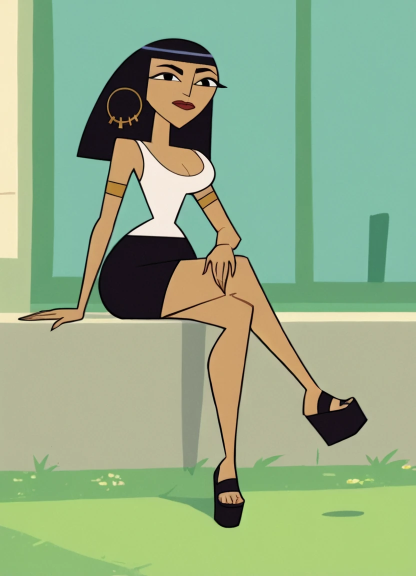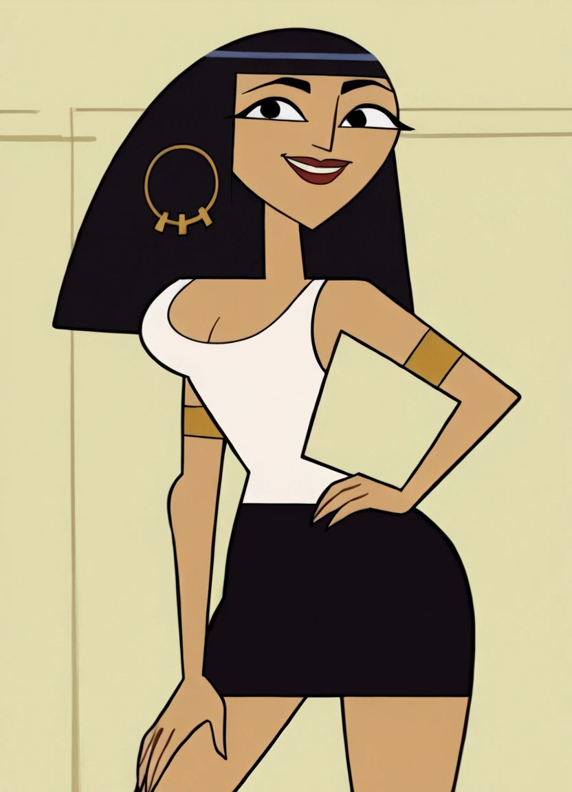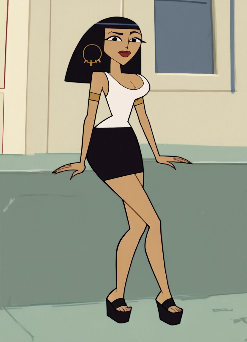 cleo, 1girl, solo, hoop earrings, cleavage, long hair, white tank top, black eyes, black skirt, lipstick, platform footwear, armlet, bangs