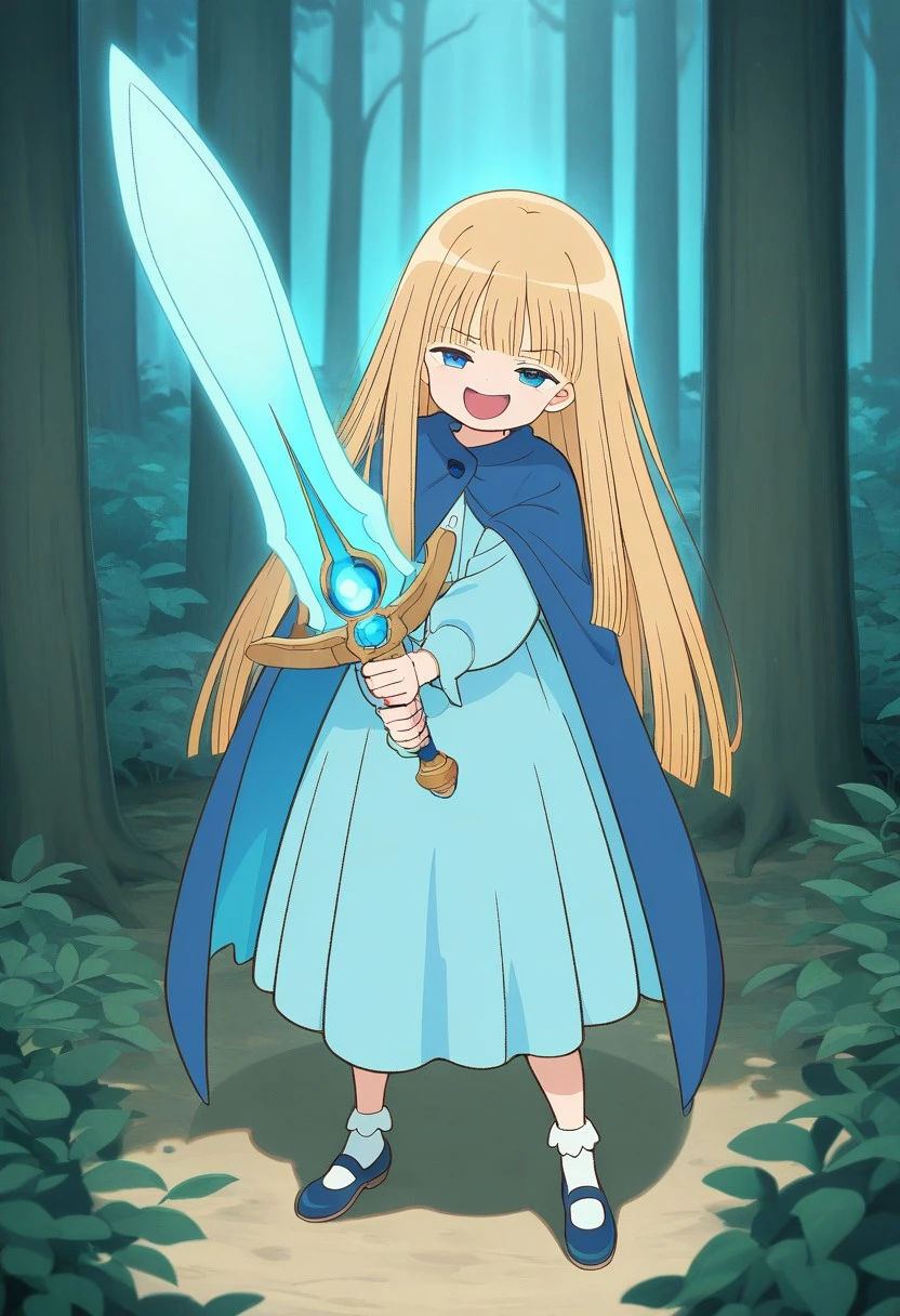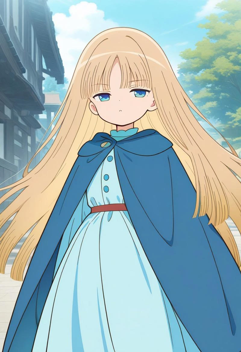 gjuju,long blonde hair,blue eyes,light-blue dress,socks,Mary Jane shoes,blue cape