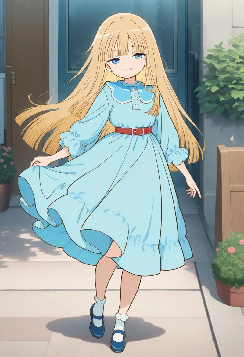 gjuju,long blonde hair,blue eyes,light-blue dress,socks,Mary Jane shoes