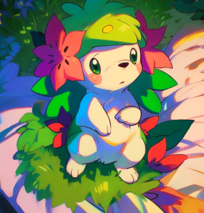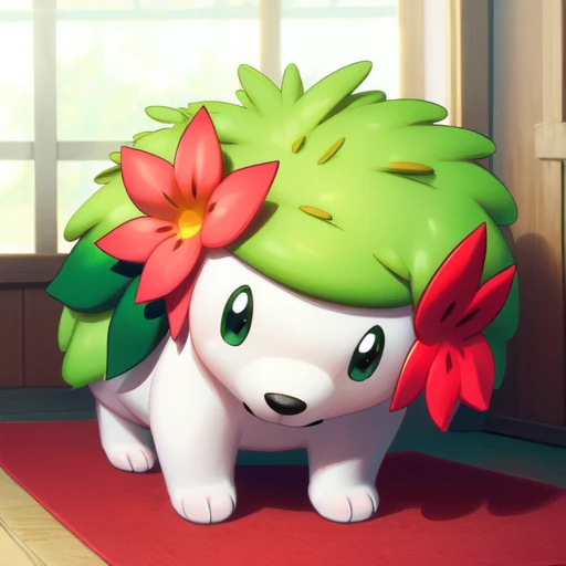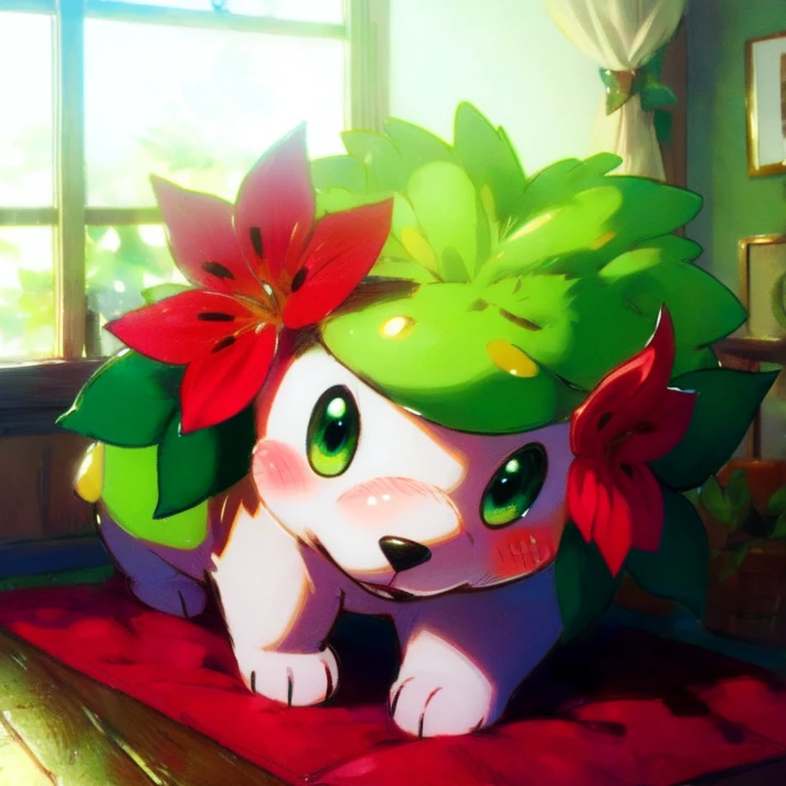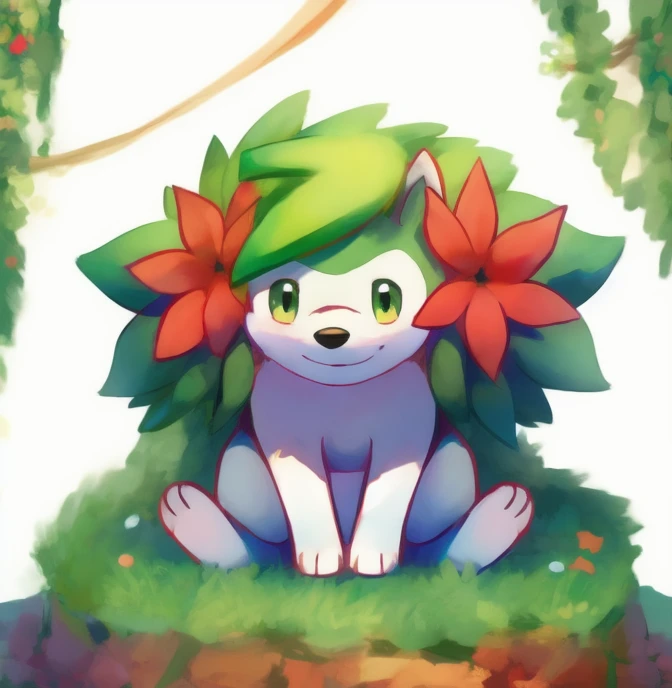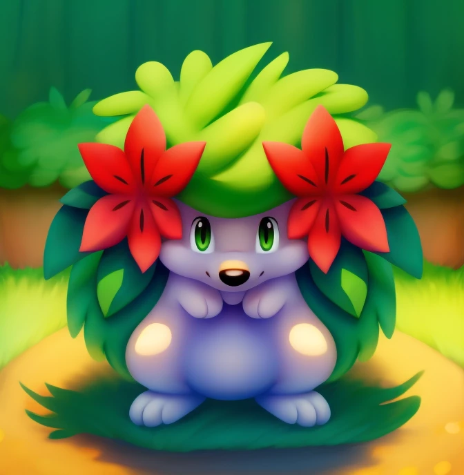 建议prompt:shaymin,Hedgehog like creatures,green fur,There are two red flowers on both sides of the head,Quadruped,