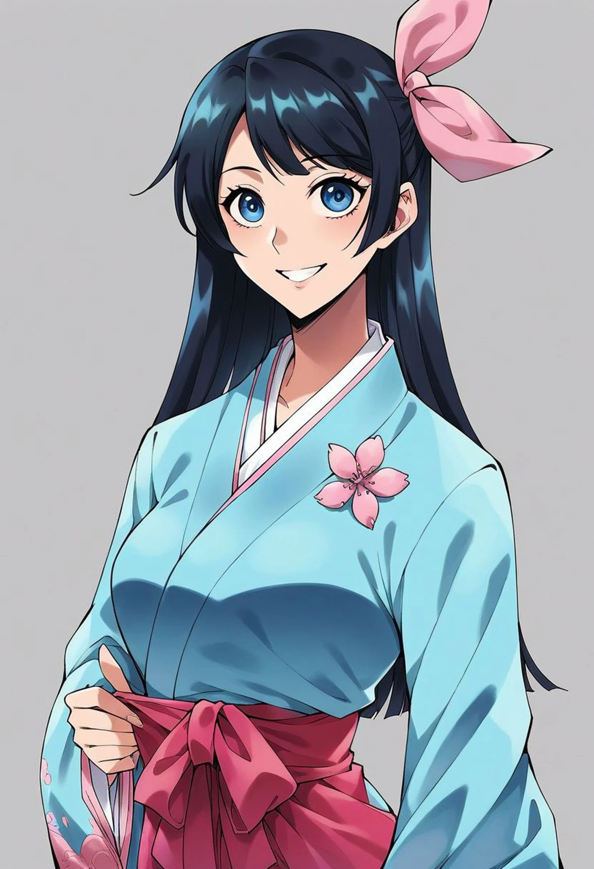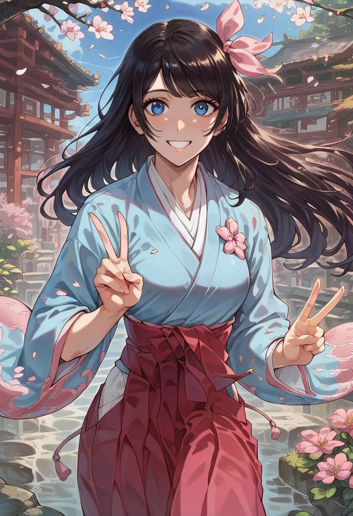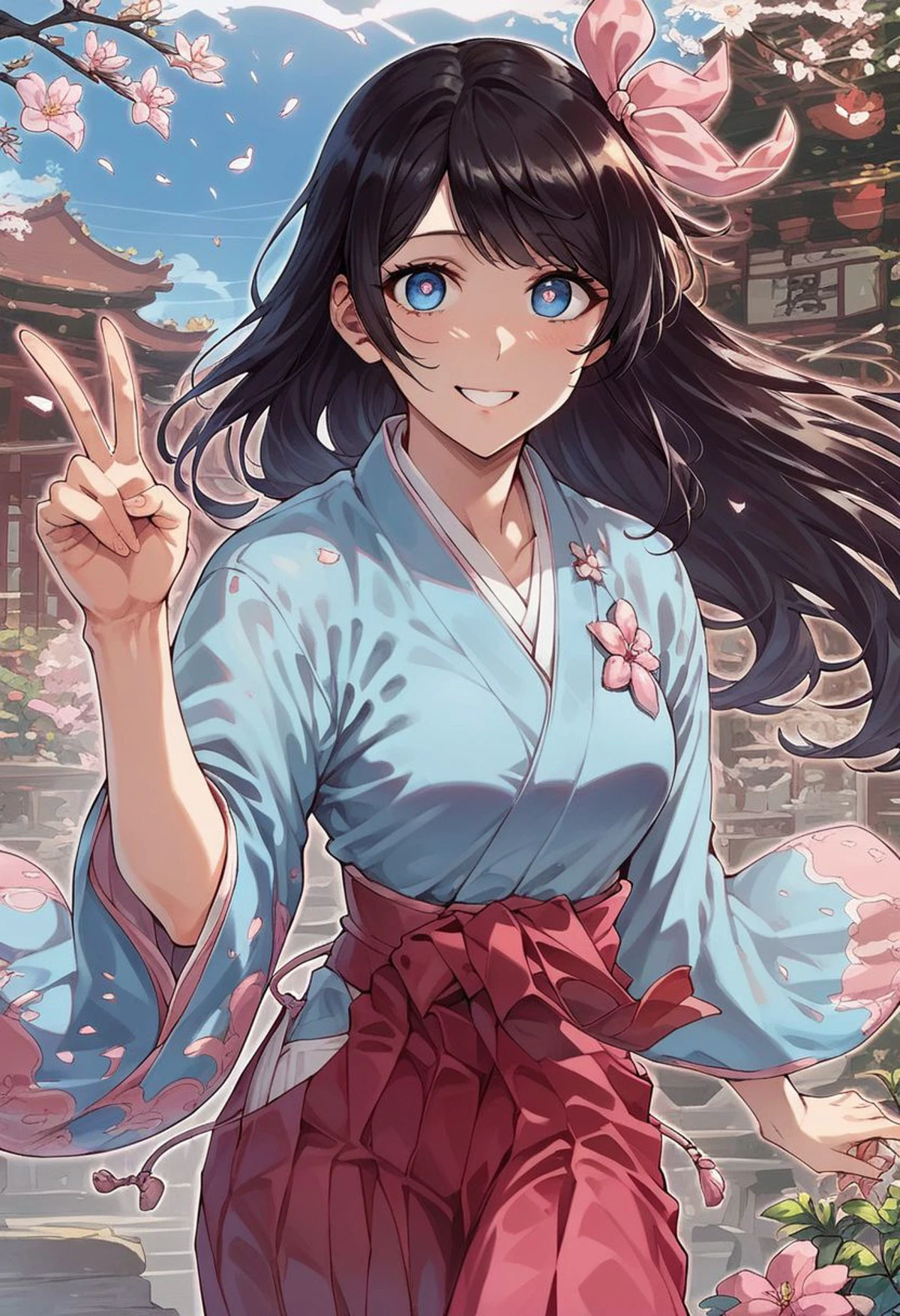 Sakura_Amamiya,black_hair,Blue_eyes,blue_kimono,hair_ribbon,pink_hakama,japanese_clothes,