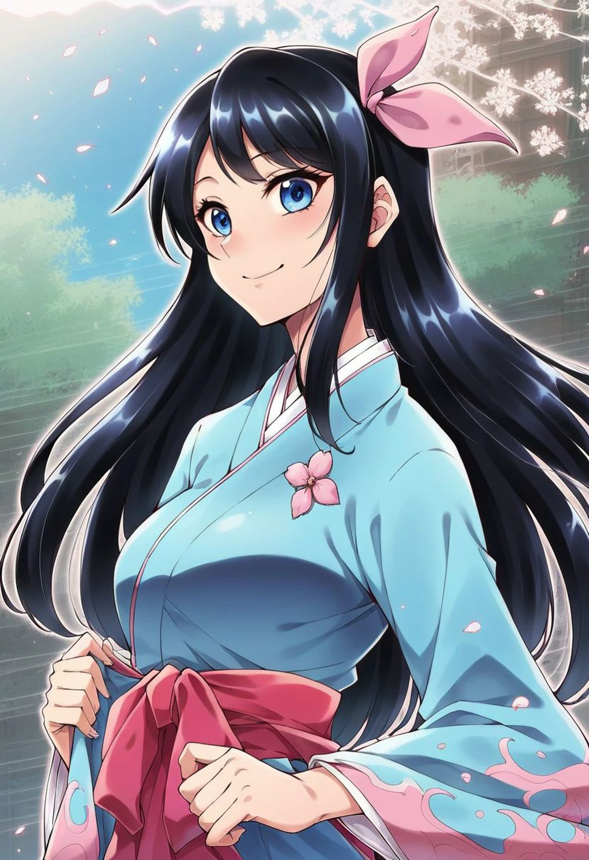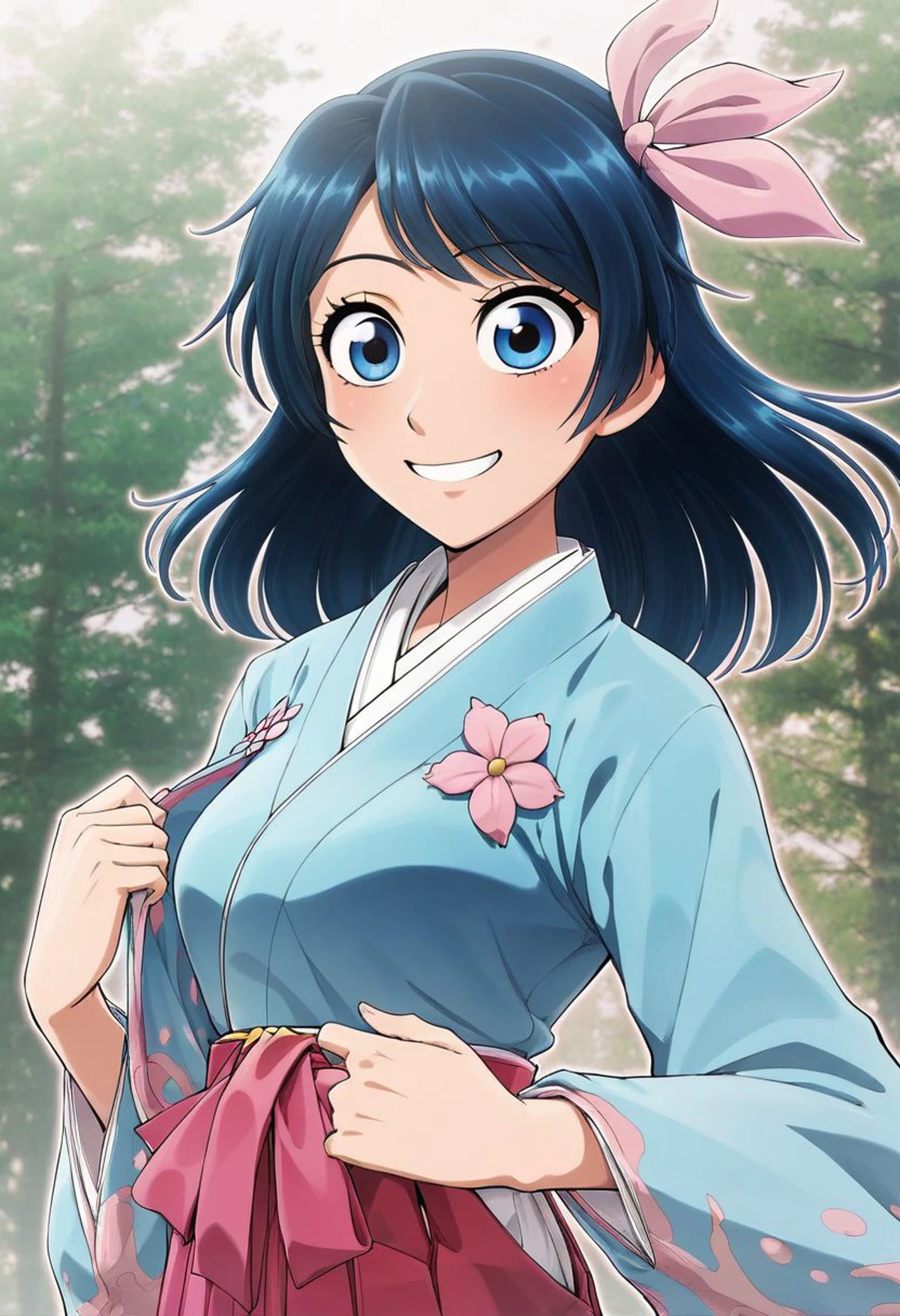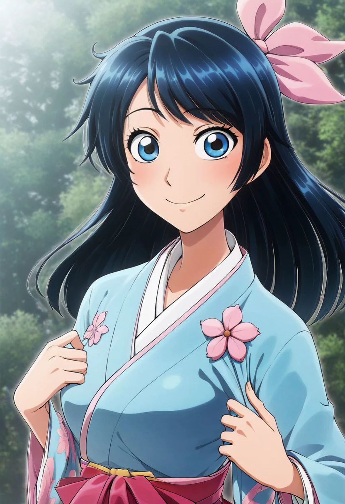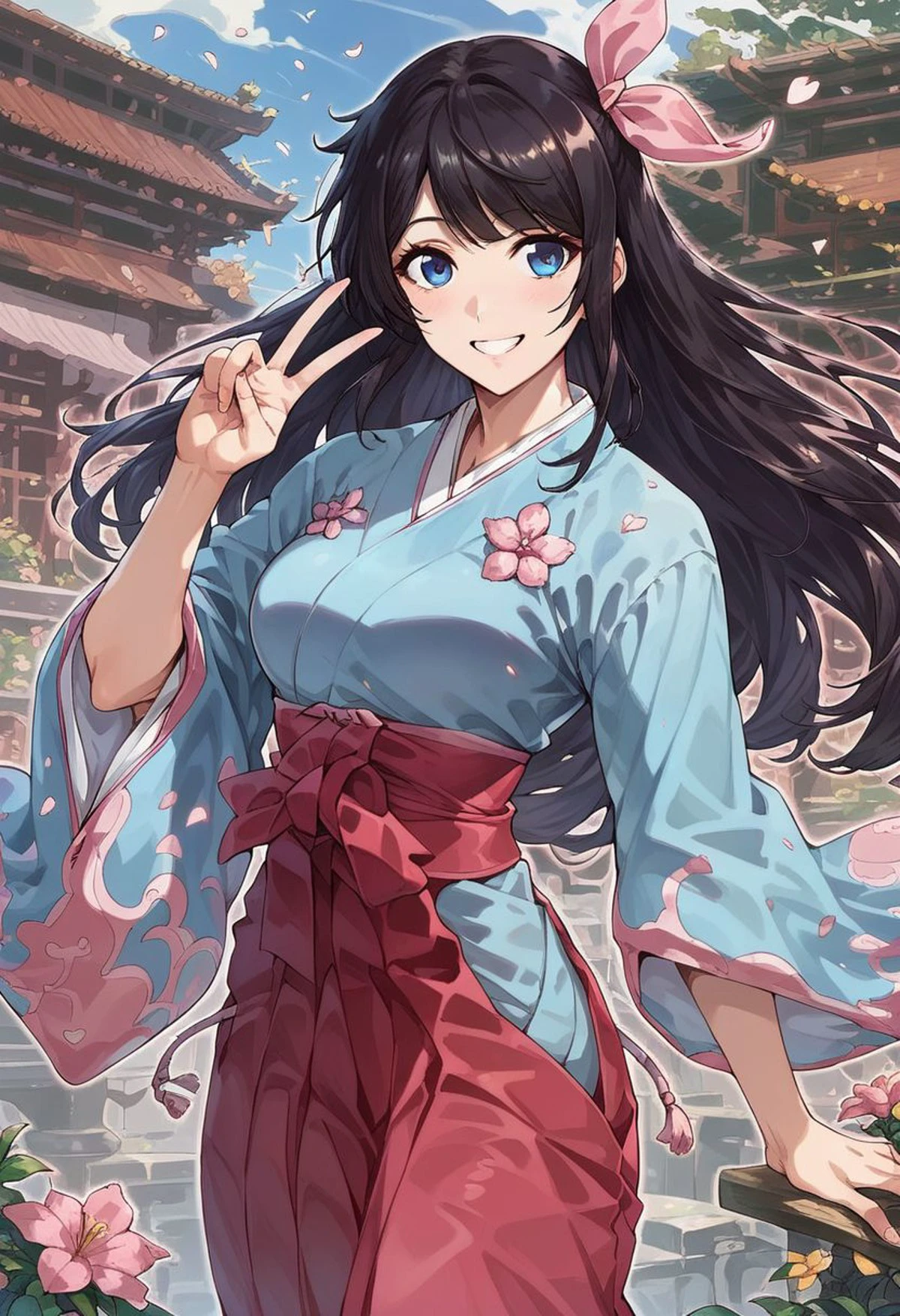 Sakura_Amamiya,black_hair,Blue_eyes,blue_kimono,hair_ribbon,pink_hakama,japanese_clothes,