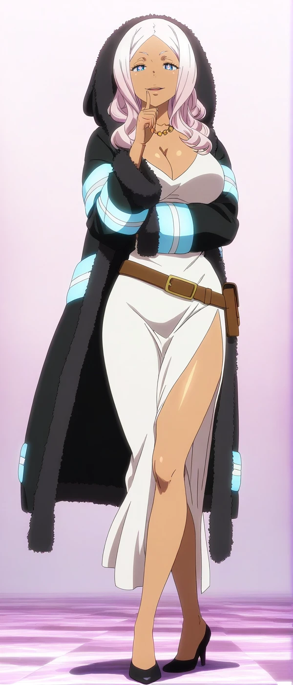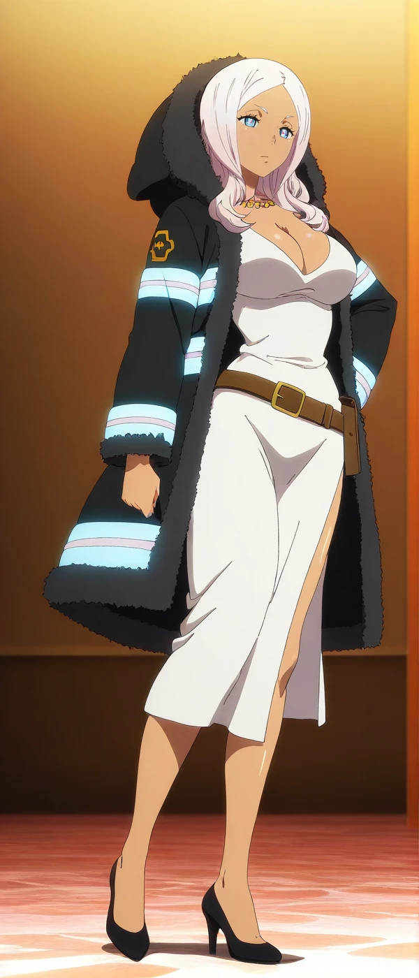 high heels, cleavage, hood, fur trim, dress, belt, jewelry, large breasts, coat, necklace