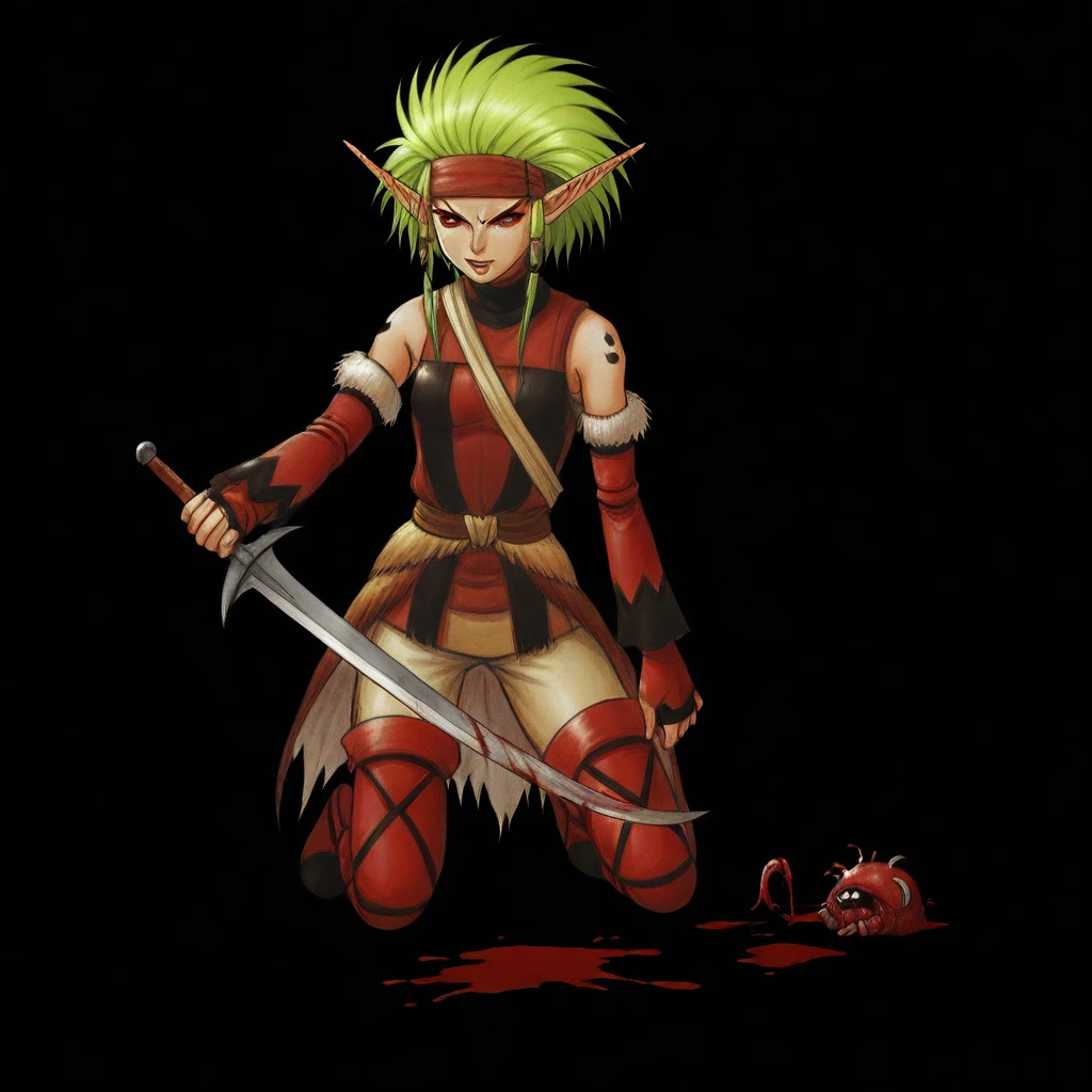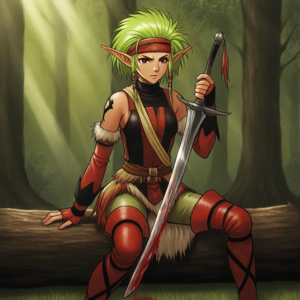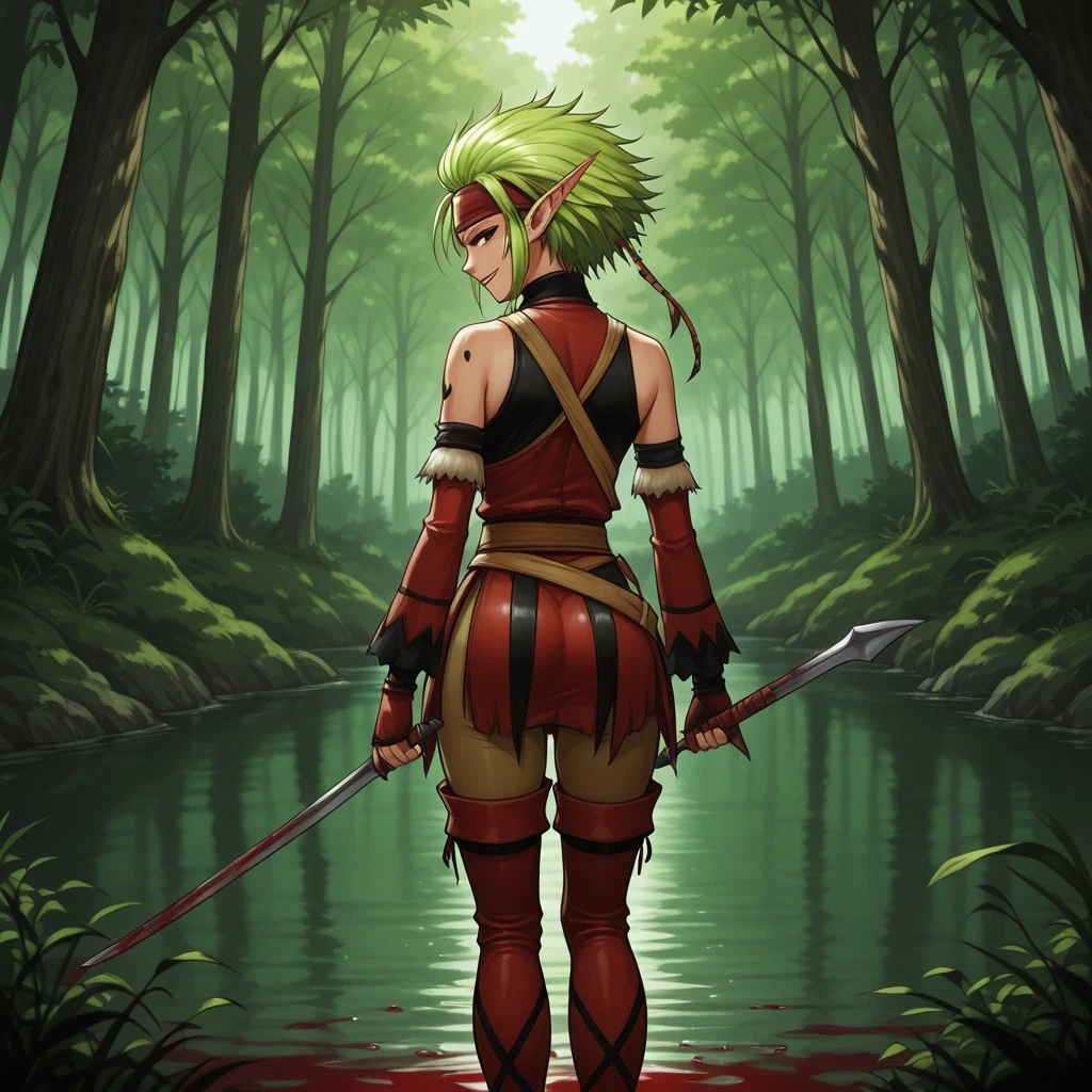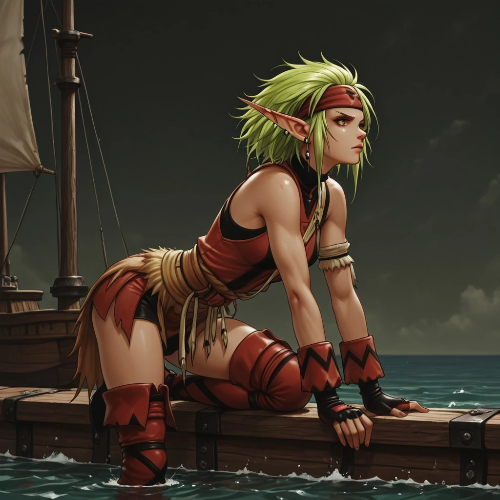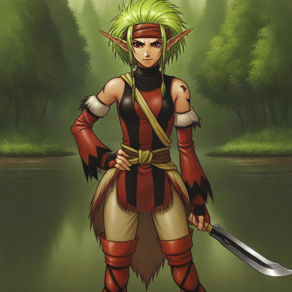 masterwork, masterpiece, best quality, highres, very aesthetic, Selma (Suikoden), 1girl, elf, pointed ears, green hair, red outfit, leather armor, sleeveless top, brown belt, gloves, thigh-high boots