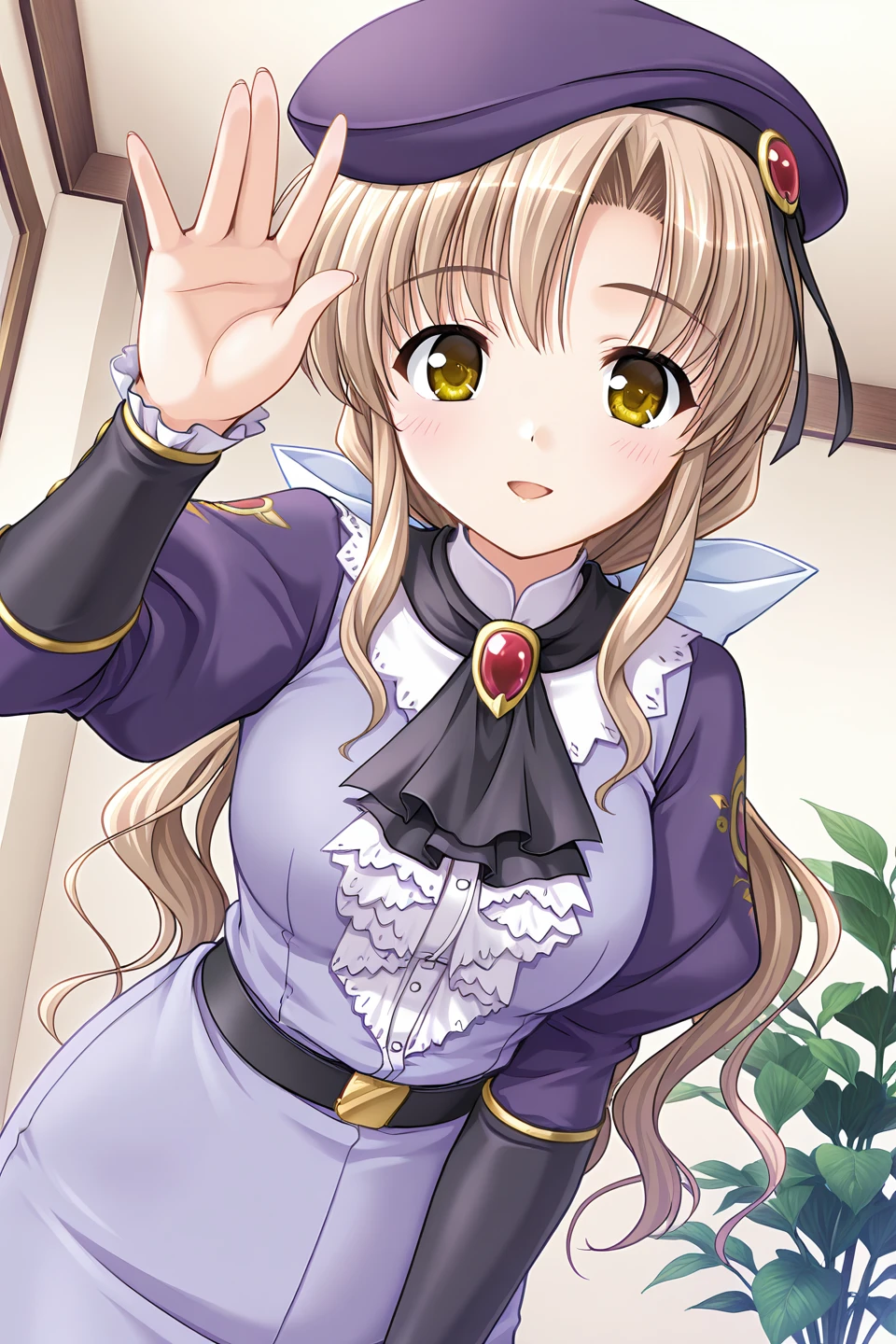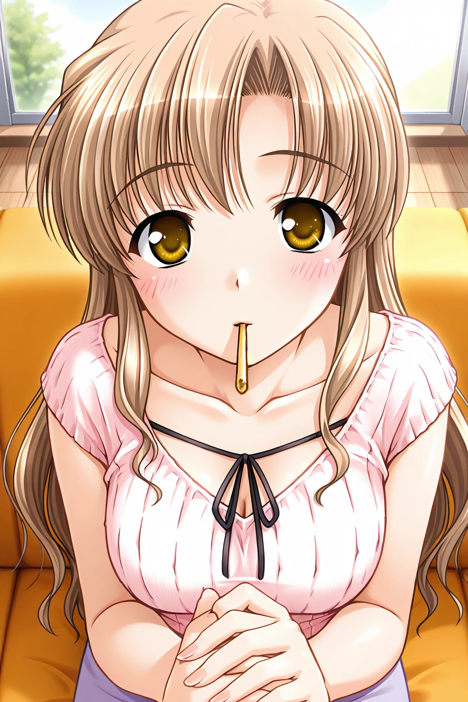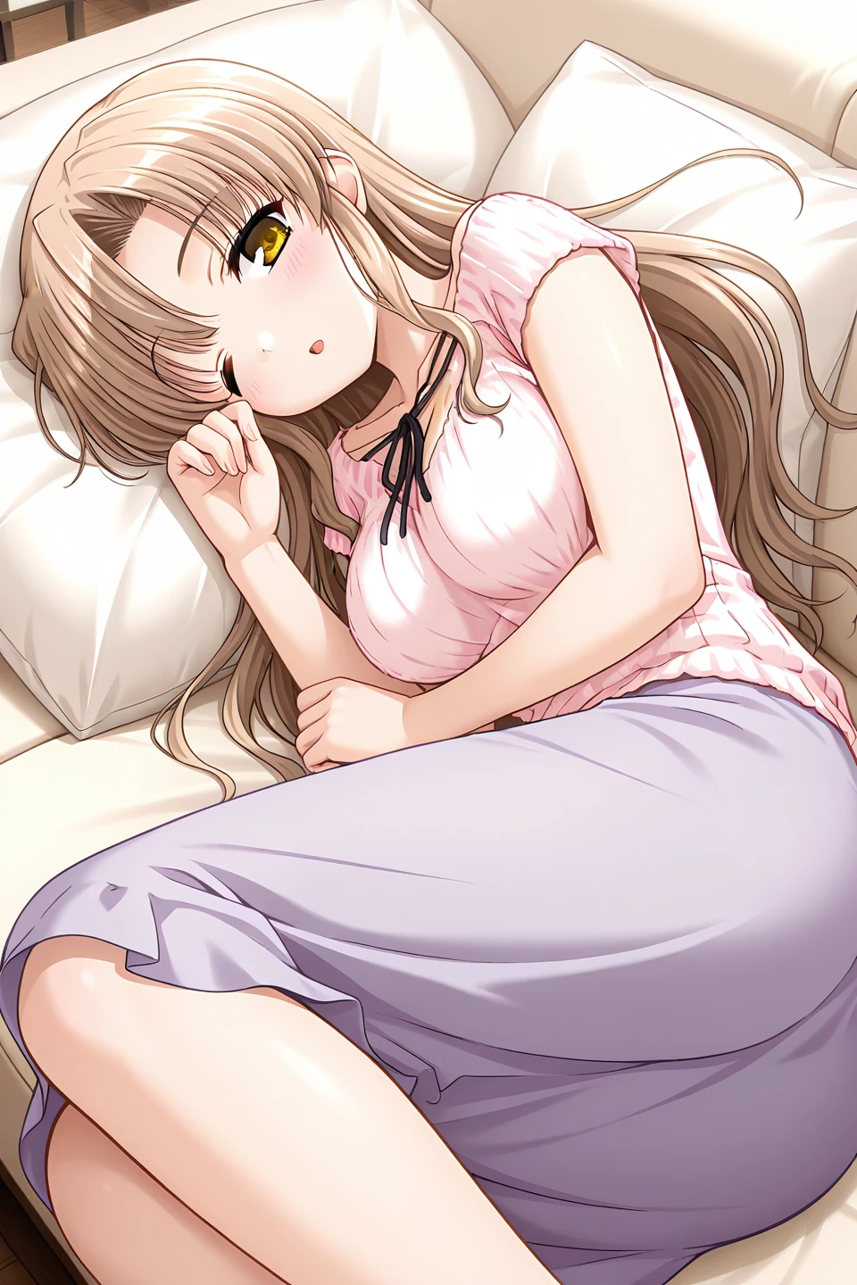 hozumi sayaka,yellow eyes,light brown hair,very long hair,wavy hair,hair intakes,sidelocks,parted bangs,hair down,