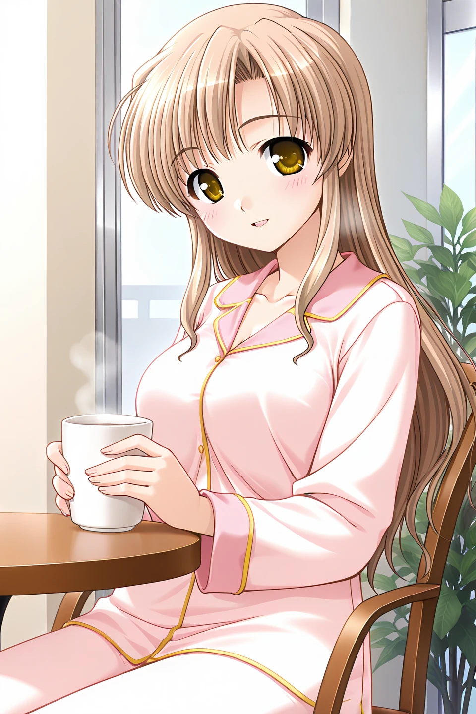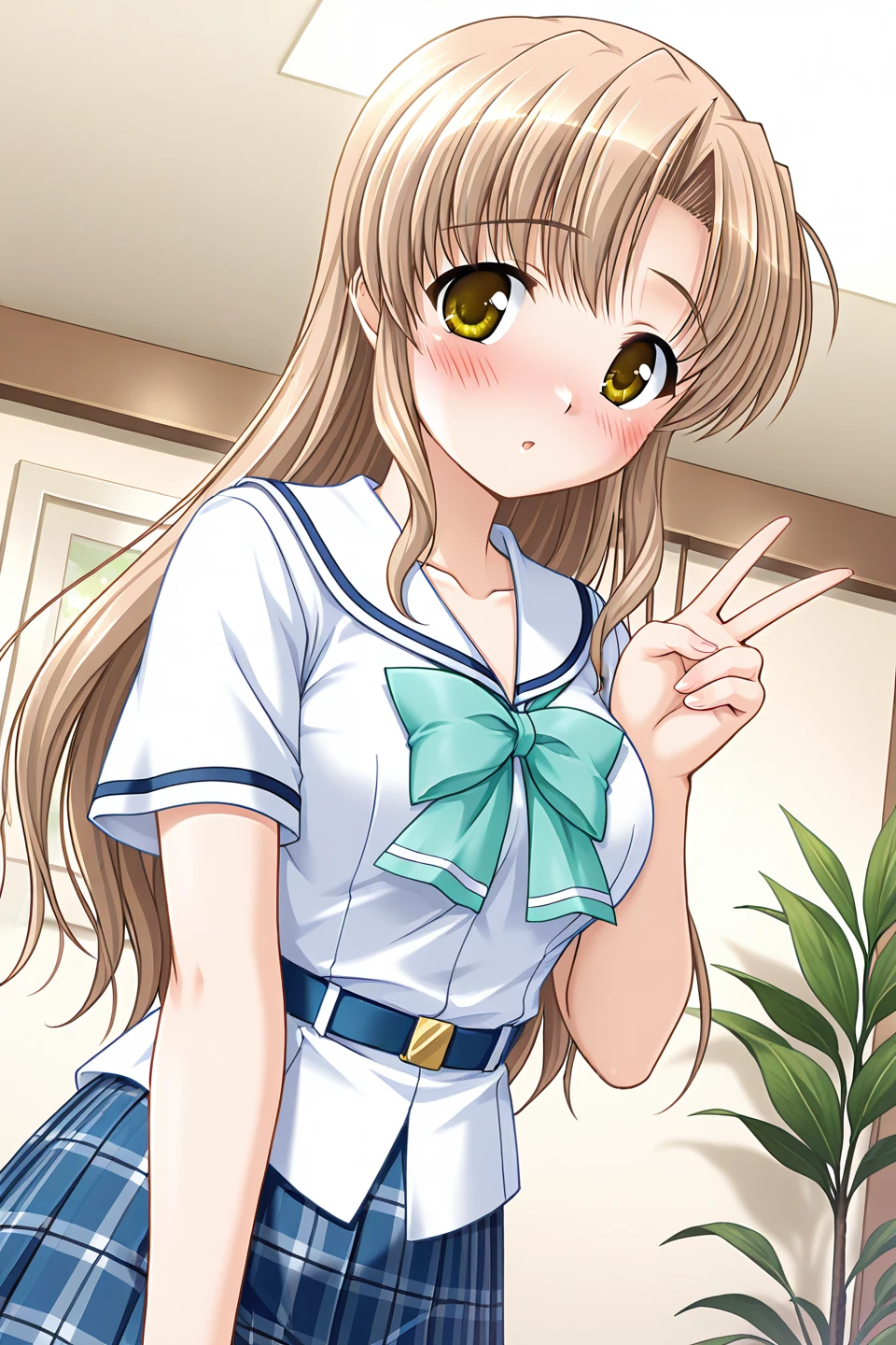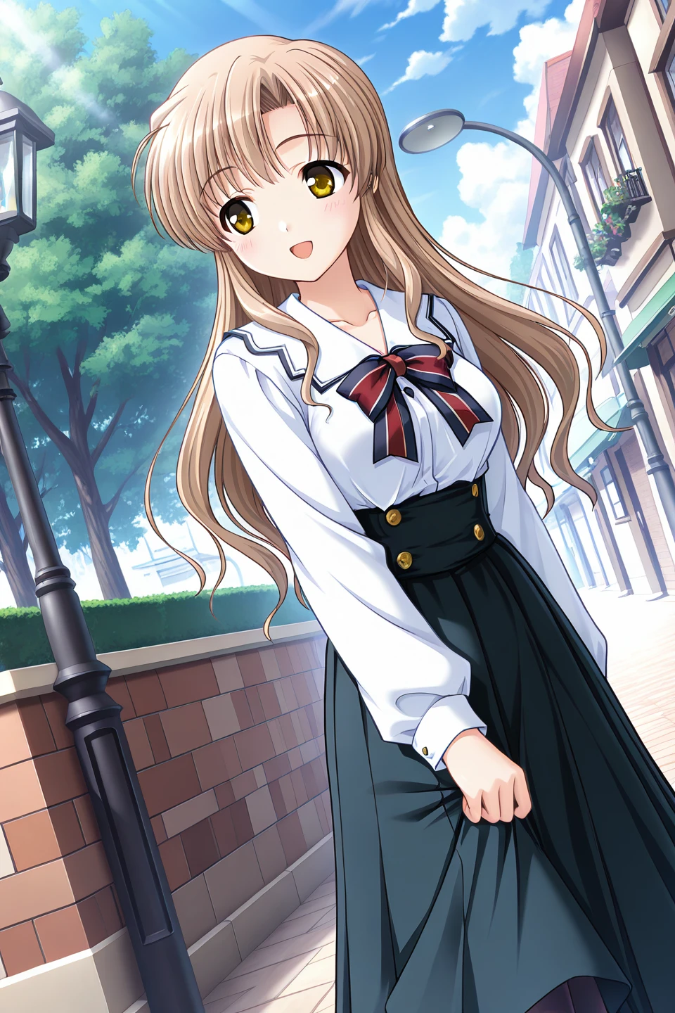 hozumi sayaka,yellow eyes,light brown hair,very long hair,wavy hair,hair intakes,sidelocks,parted bangs,hair down,