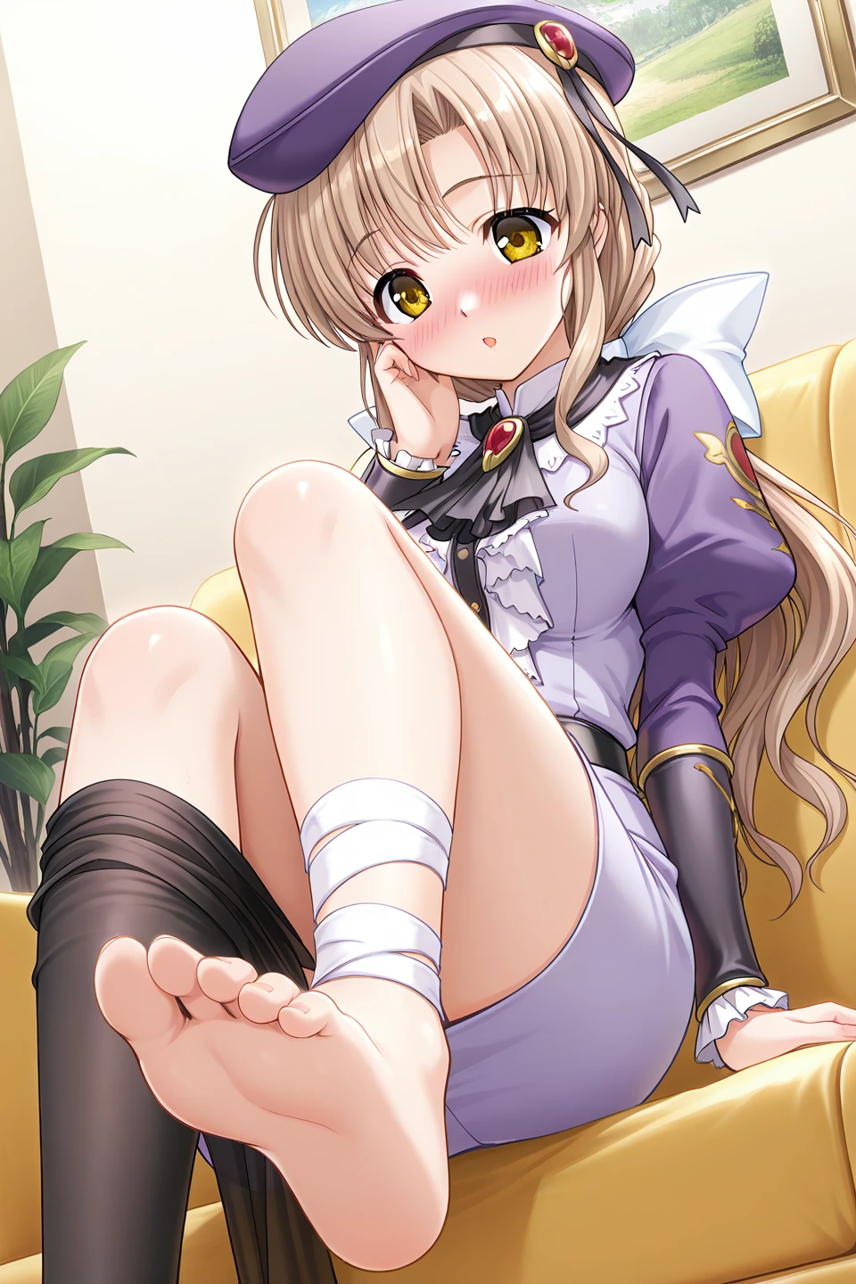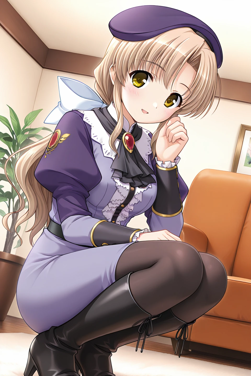 office lady,beret,purple headwear,hat ribbon,black ribbon,light purple dress,brooch,black neckerchief,white collar,lace collar,center frills,buttons,juliet sleeves,purple sleeves,frilled sleeves,arm guards,emblem,black belt,pencil skirt,tight skirt,black pantyhose,long boots,high heels,black footwear,