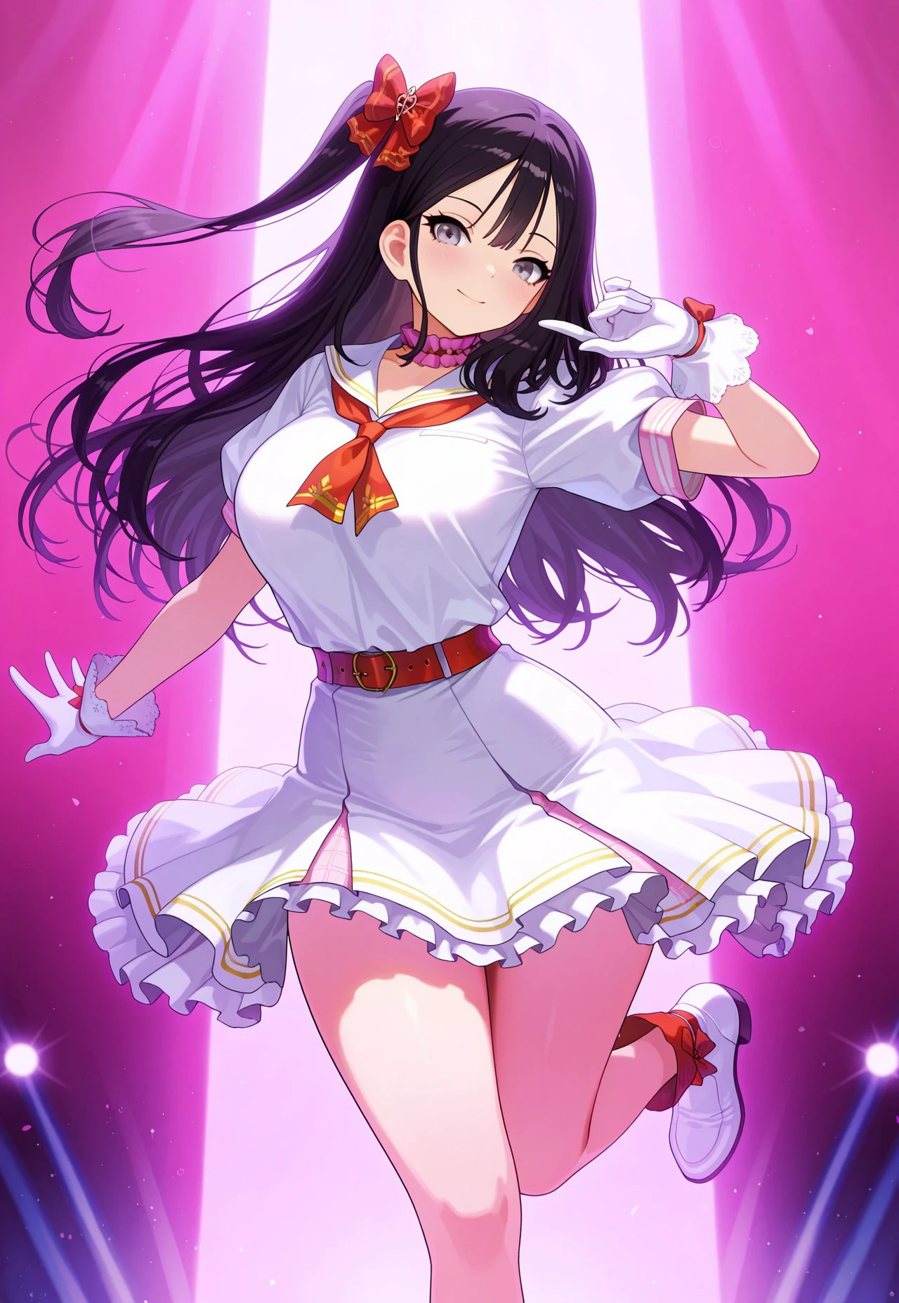 ventana-CID, large breasts, grey eyes, black hair, long hair, idol concept, single_hair_ornament, pink_frill_choker, sailor collar, red_neckerchief, white_puffy_short_dress, frills, white_ruffle_gloves, red_waist_bow_belt, frill_skirt, red_single_thigh_bow_string, red_ankle_strap, white_footwear,