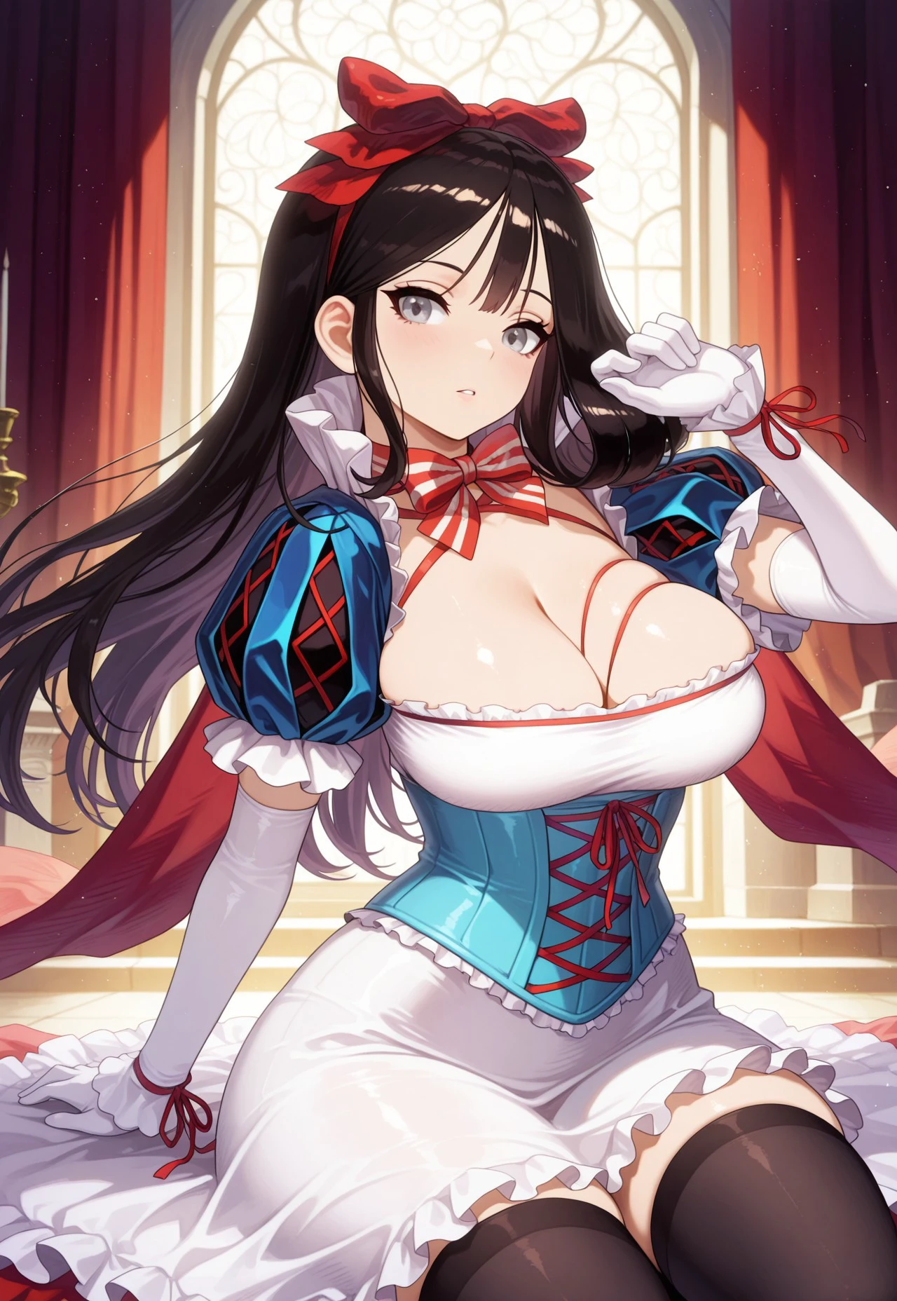 ventana-SW, large breasts, grey eyes, black hair, long hair, snow white concept, red_hair_bow, striped bowtie, white_dress, cleavage, blue_corset, red_ribbon, red string, blue_puffy_short_sleeves, white_elbow_gloves, white_gloves, white frills, black_thighhighs, red_high_heels,