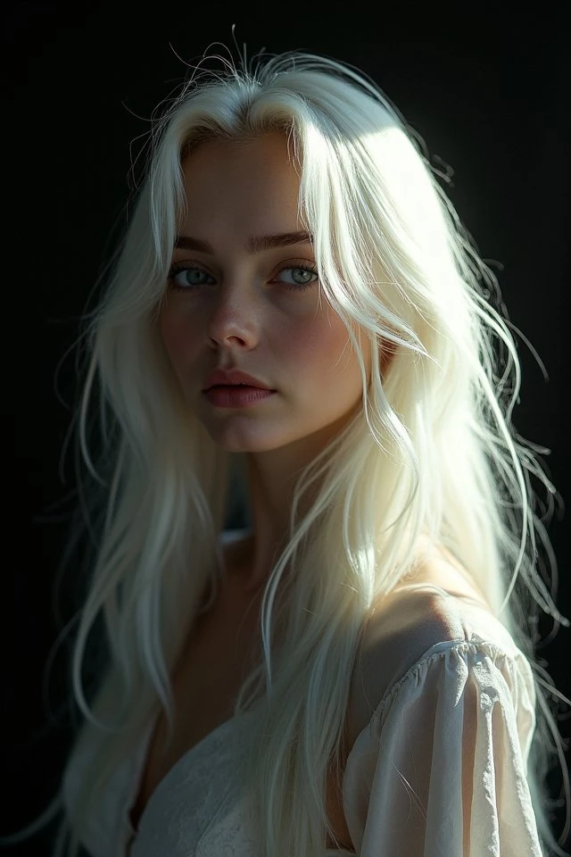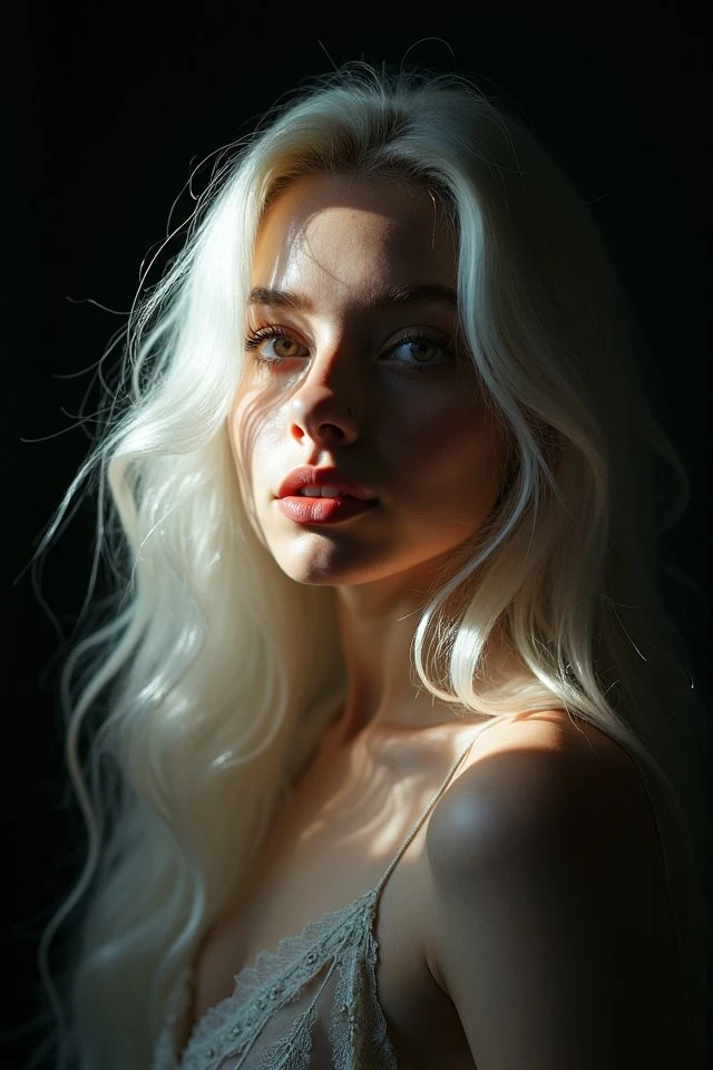 mdlnmornc, portrait, woman, chiaroscuro lighting, single light source, deep shadows, dramatic contrast, light falling across face from left side, right side of face in deep shadow, strong rim light on cheekbone, subsurface scattering on nose tip and ear, dark background, black void background, bare shoulders, 35mm lens, 8k, photo raw, realistic