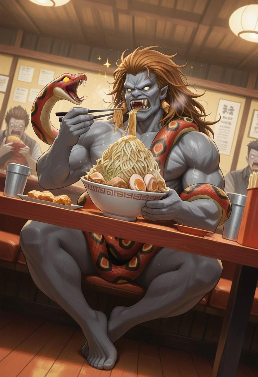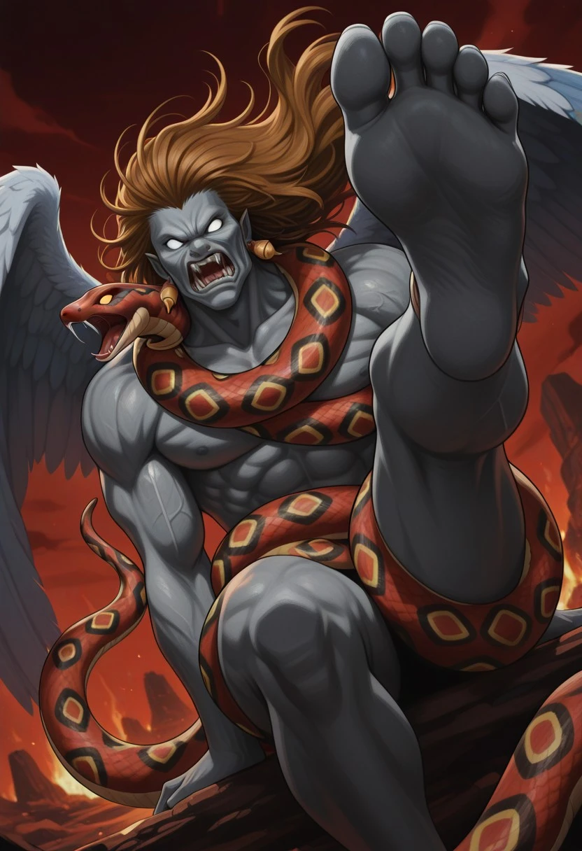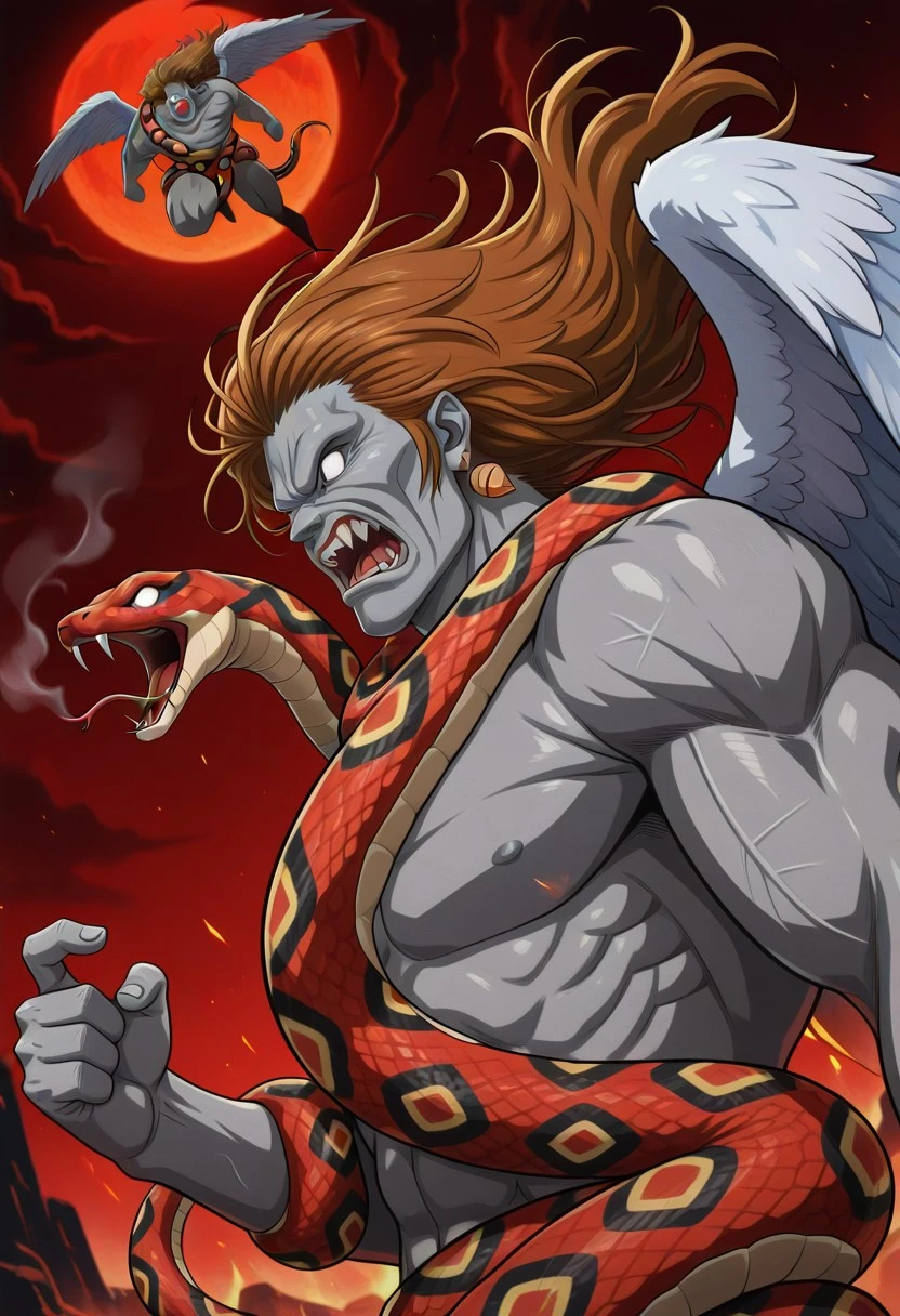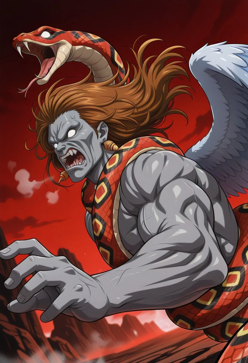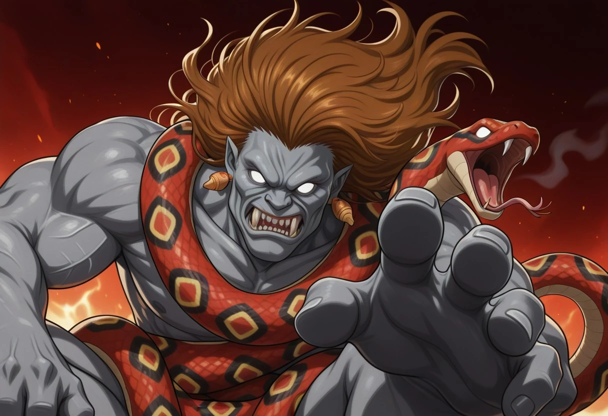 brown hair, long hair, gray skin, teeth, snake, white eyes, no pupils, ogre face,