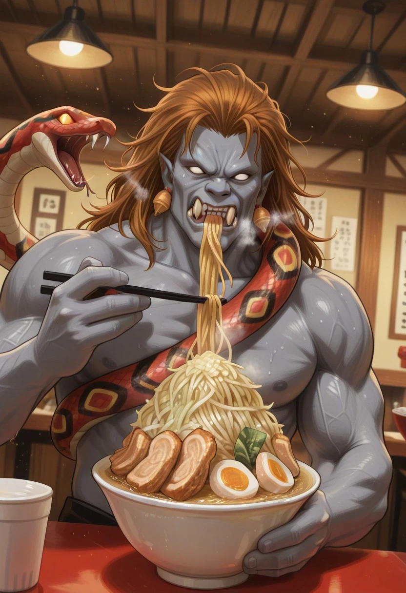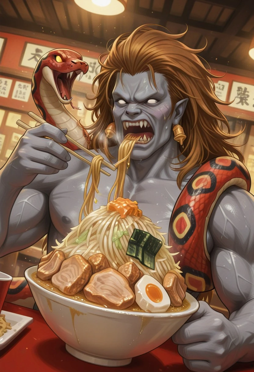 brown hair, long hair, gray skin, teeth, snake, white eyes, no pupils, ogre face, snake, jewelry,earrings,