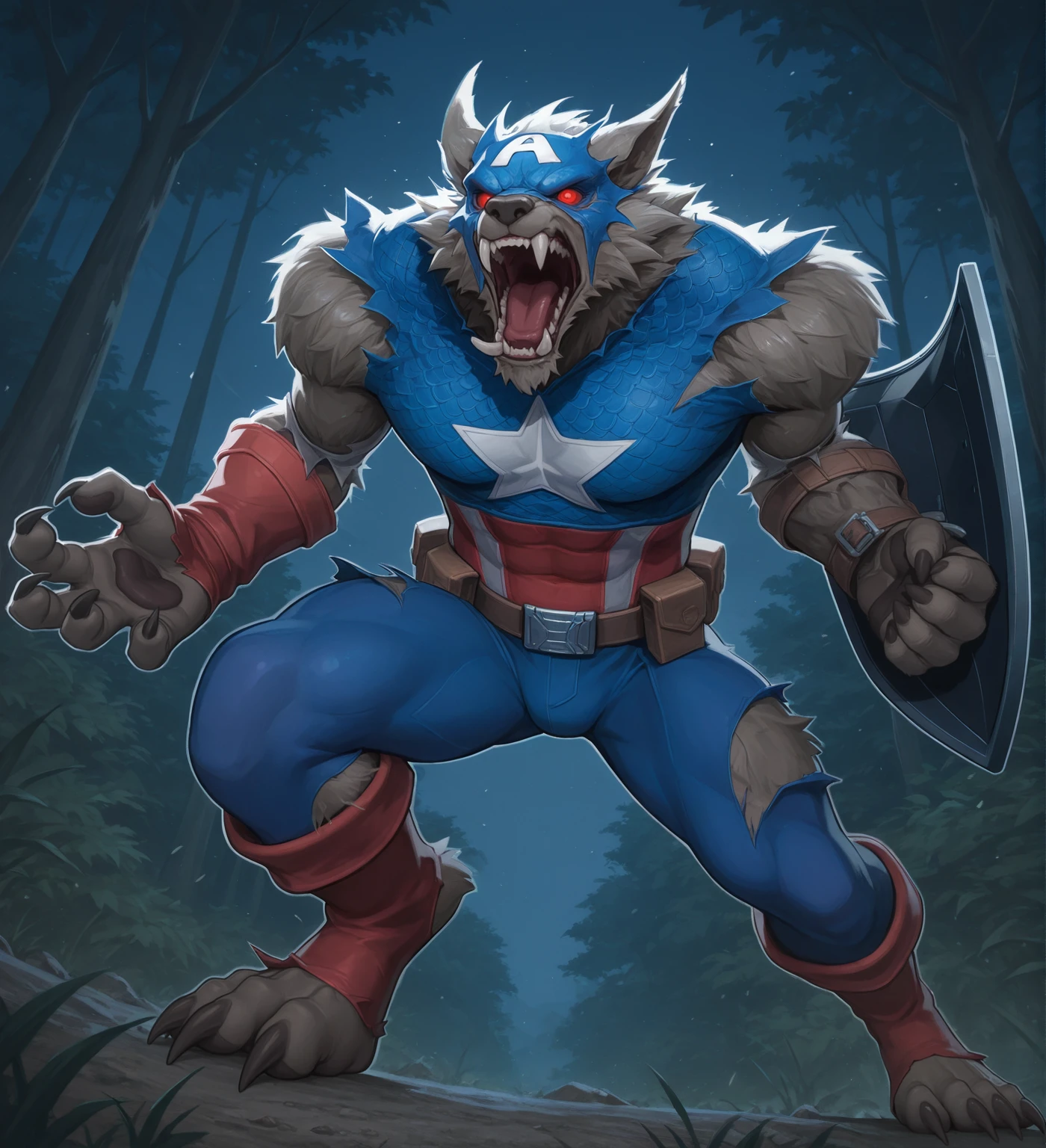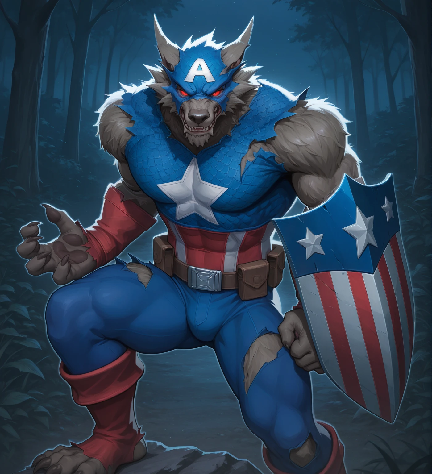 1boy,solo, furry, male focus, bara, captain america shield, holding shield, belt, red footwear, captain america mask, captain america uniform, red gloves, 建议权重/Recommend weight:0.6~0.8