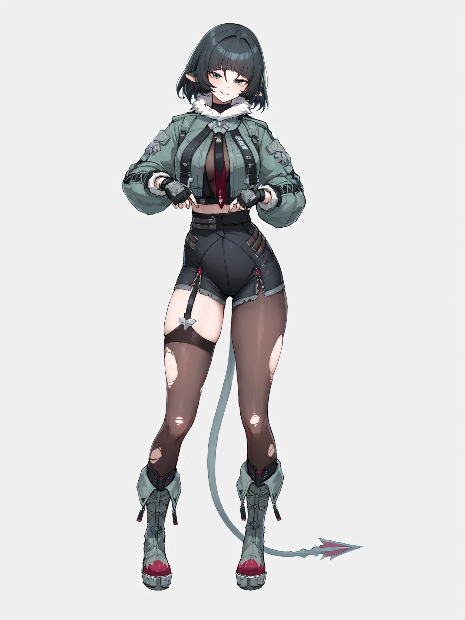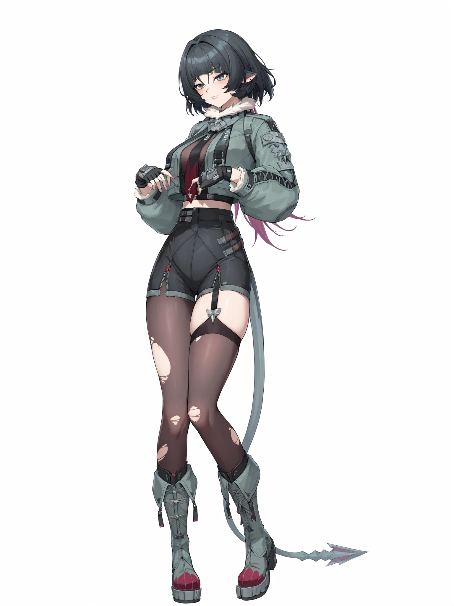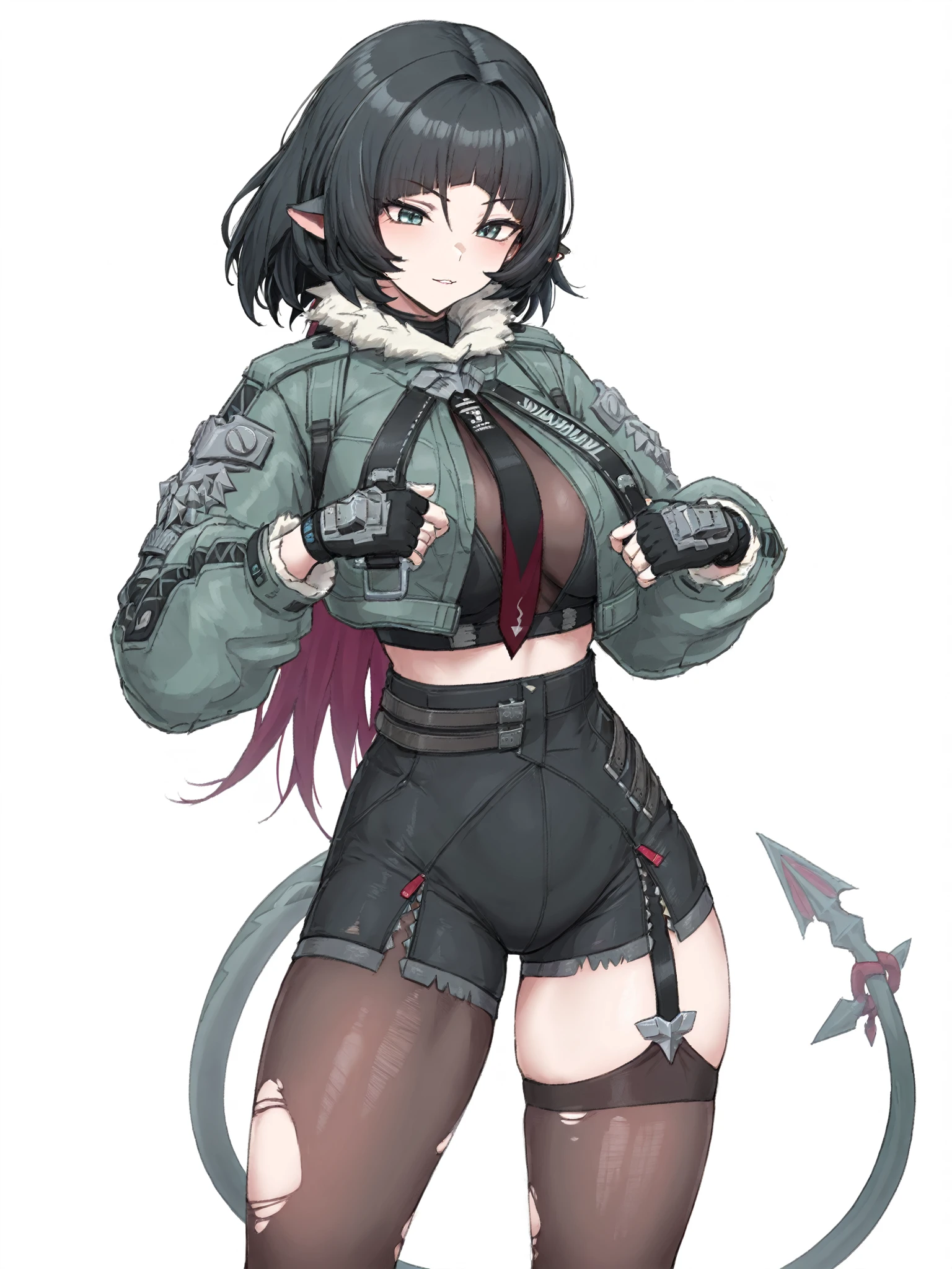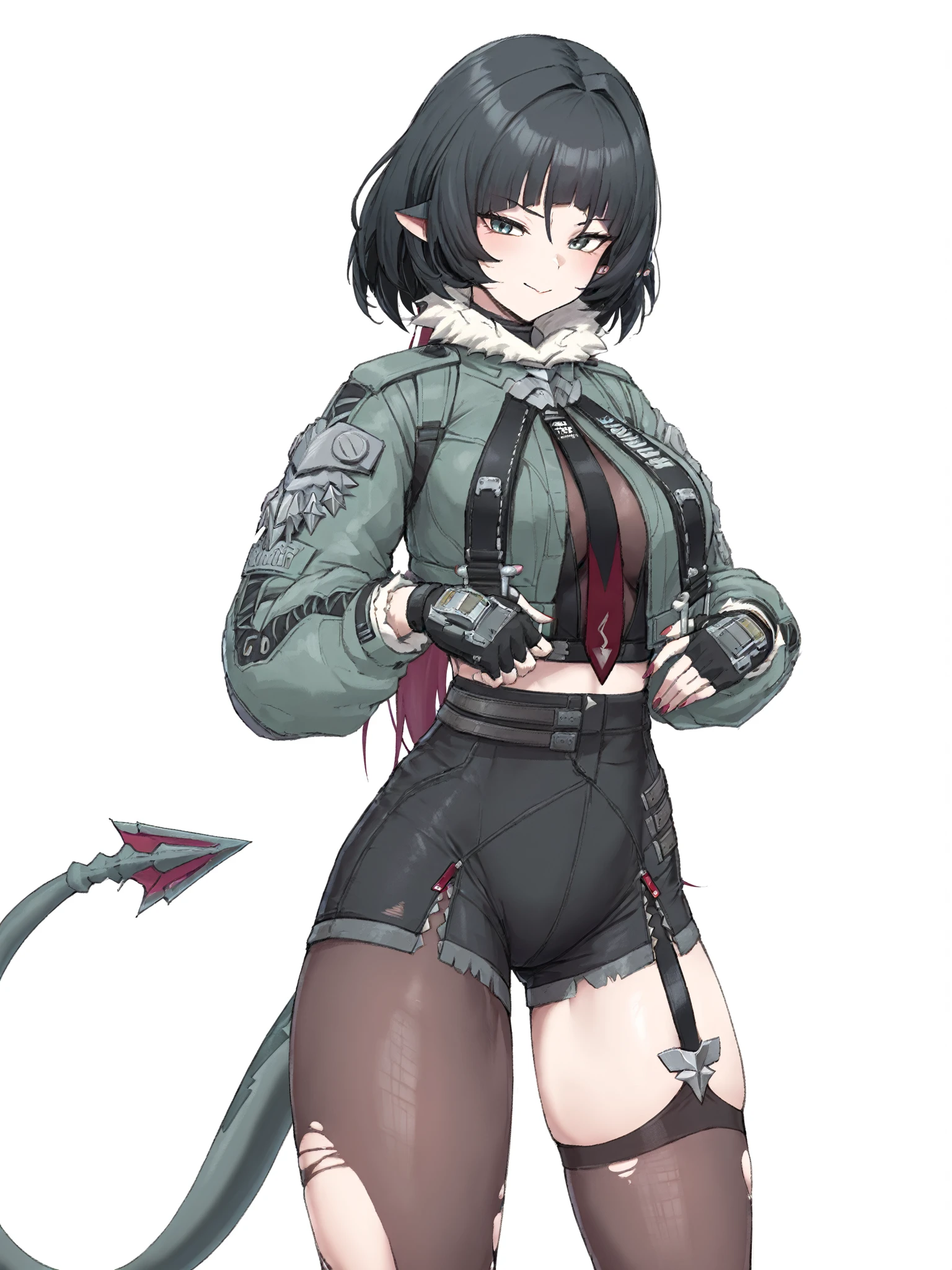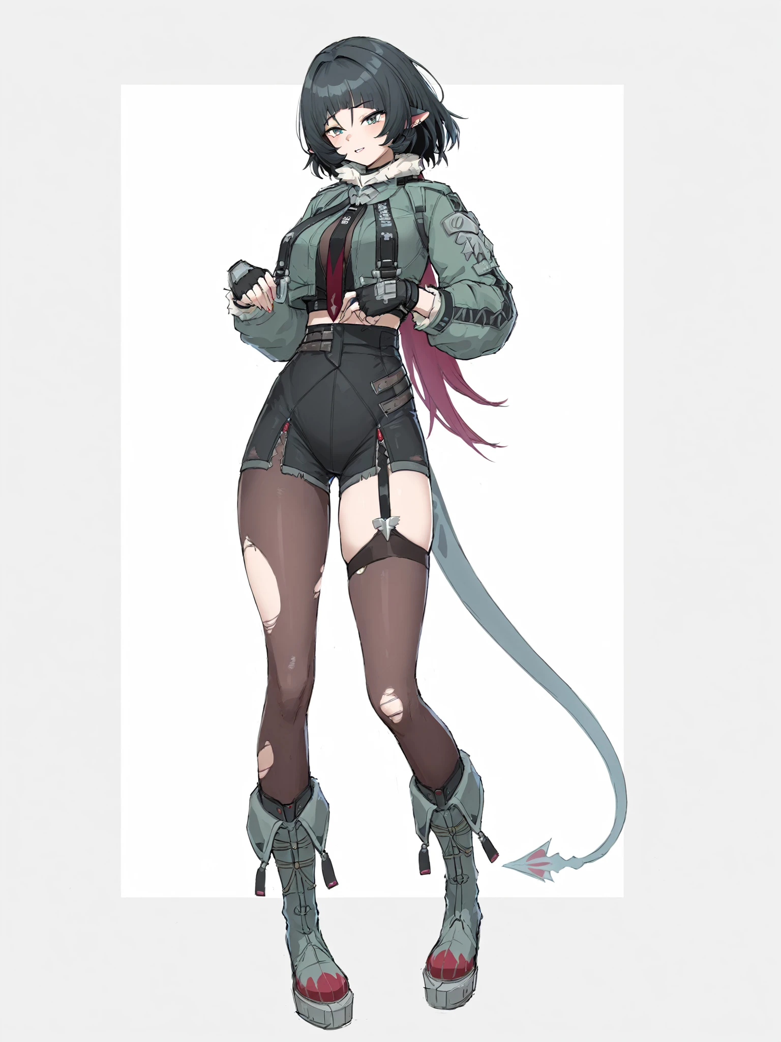 jiandoe, tail, pointy ears, default clothes, green jacket, 1girl, black hair, torn clothes, gloves, fingerless gloves, shorts, torn pantyhose, suspenders, necktie, sling,