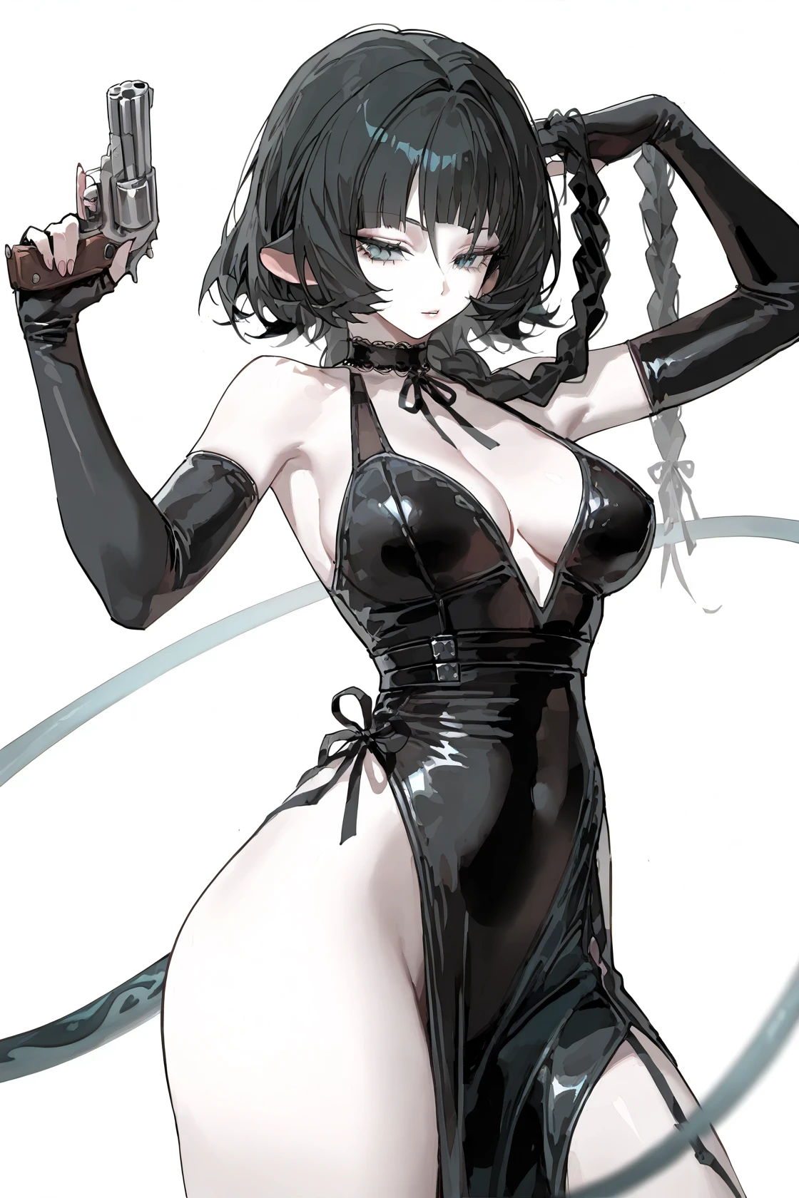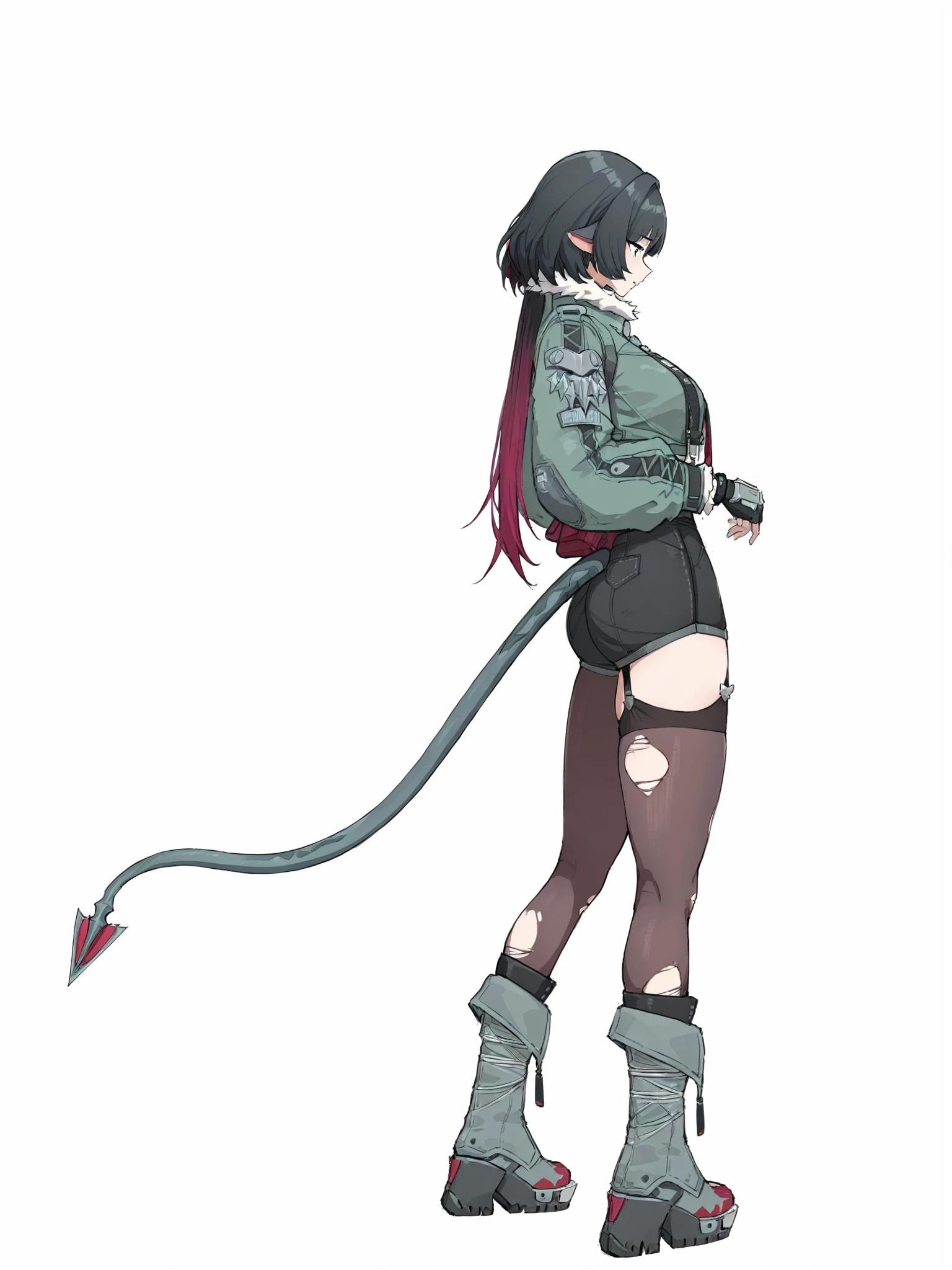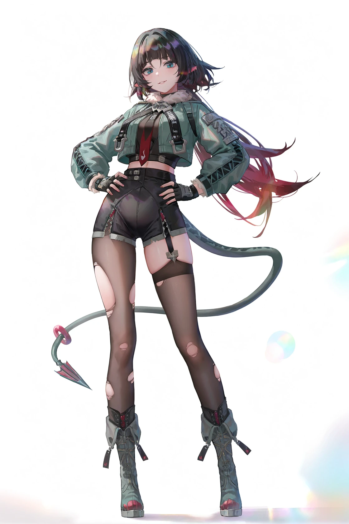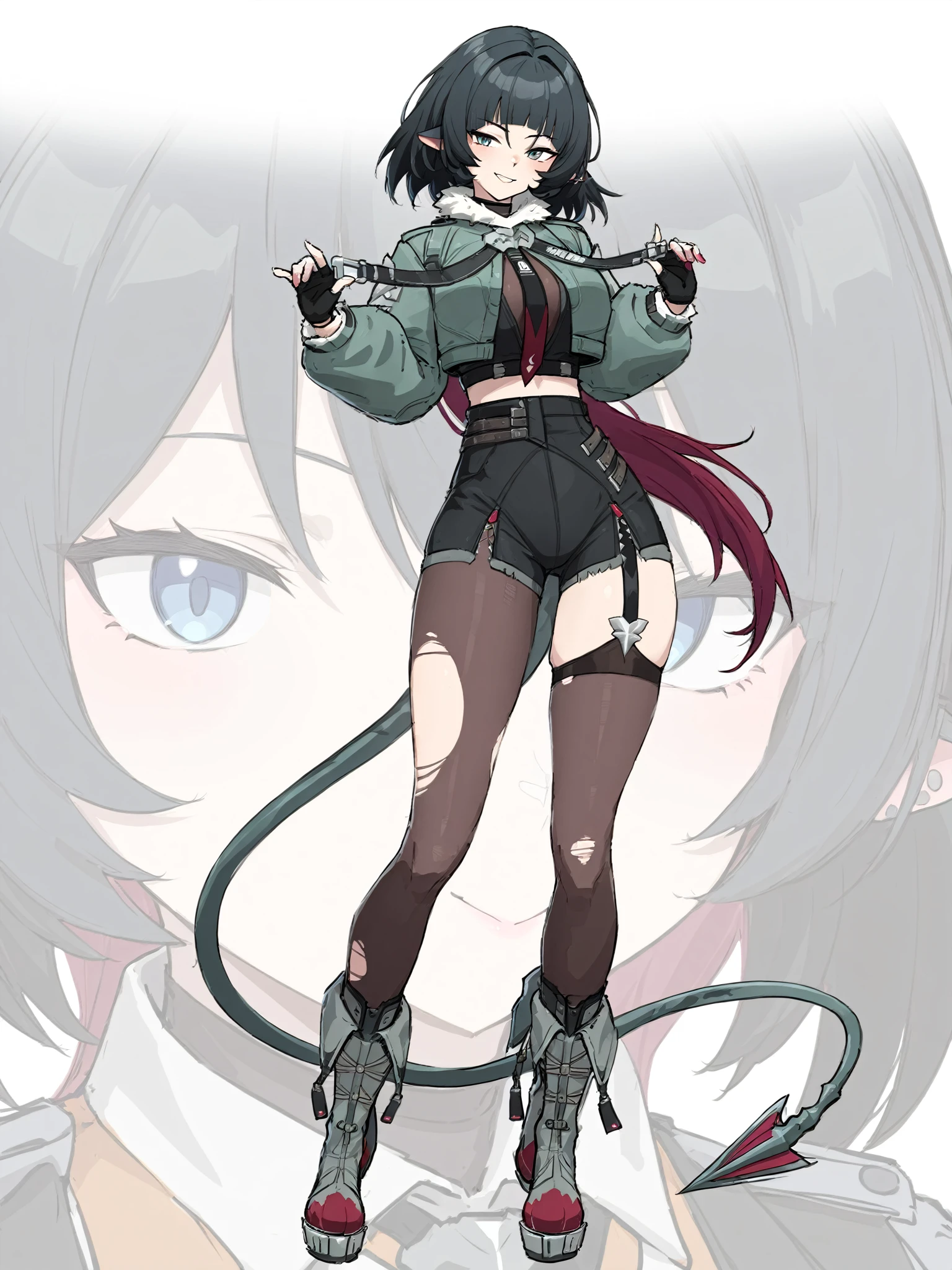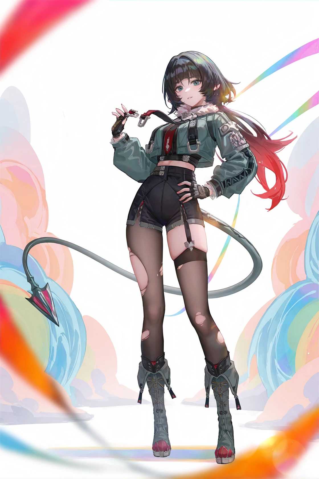 jiandoe, tail, pointy ears, default clothes, green jacket, 1girl, black hair, torn clothes, gloves, fingerless gloves, shorts, torn pantyhose, suspenders, necktie, sling,