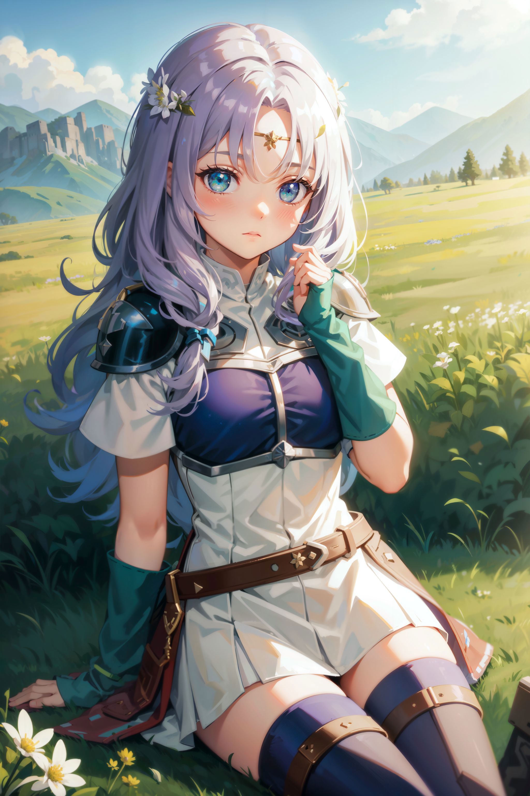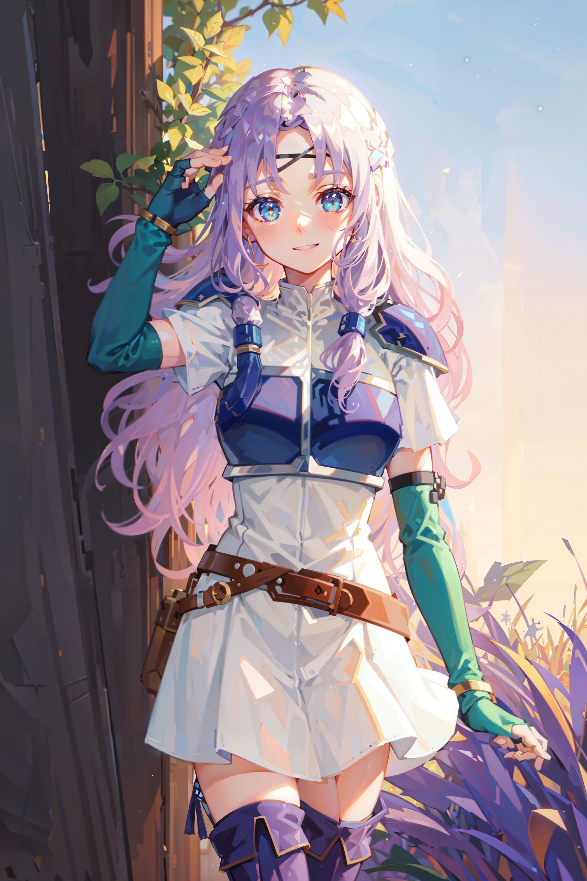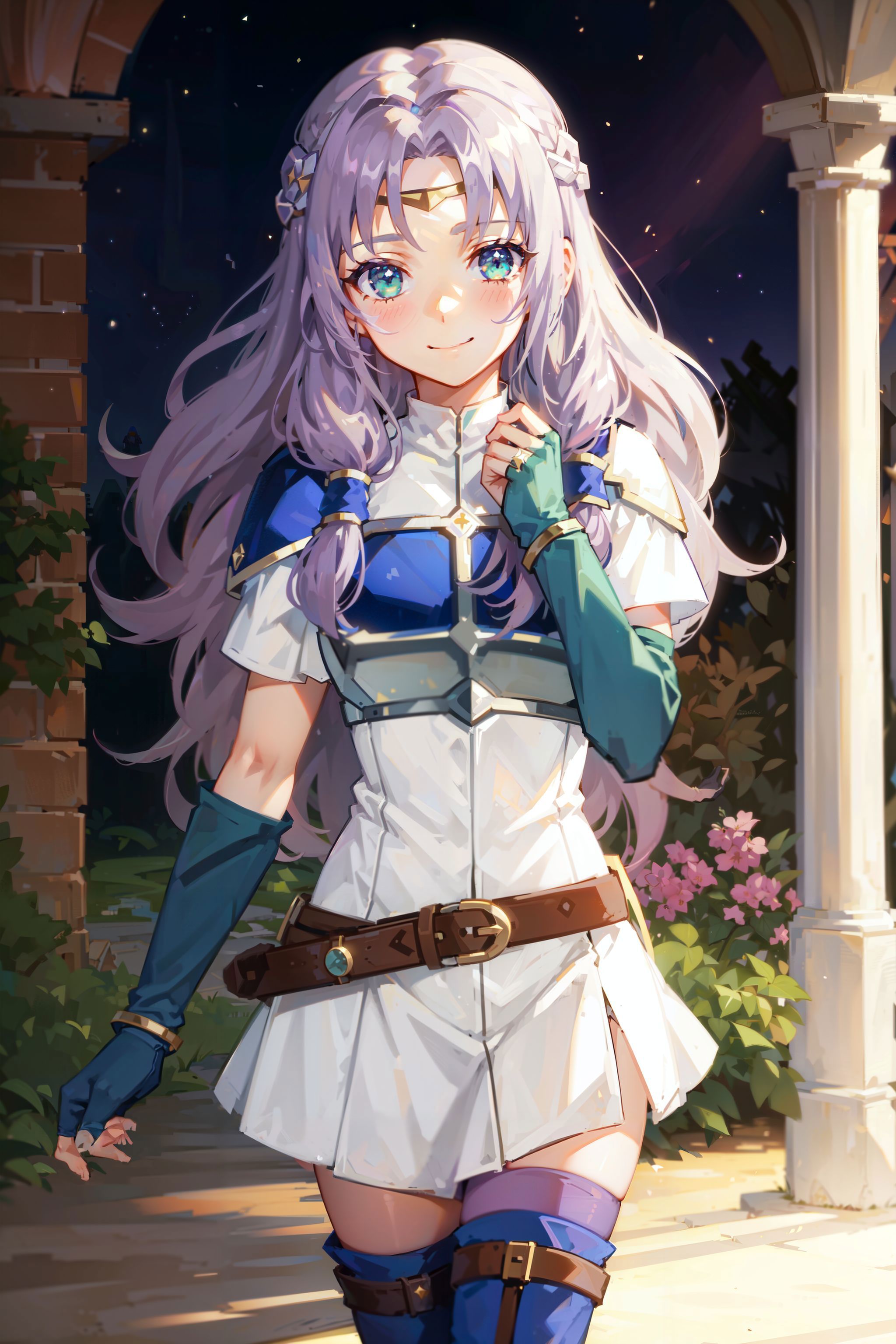 Add "circlet, armor, white dress, fingerless gloves, belt, thigh boots" for her typical look.