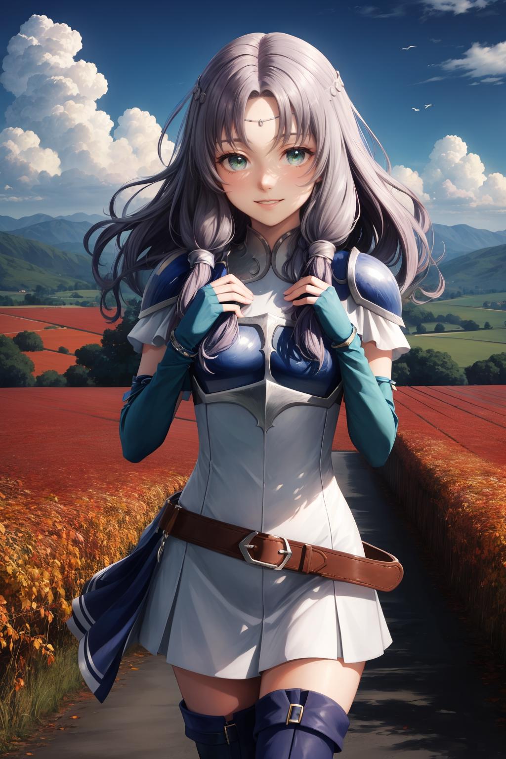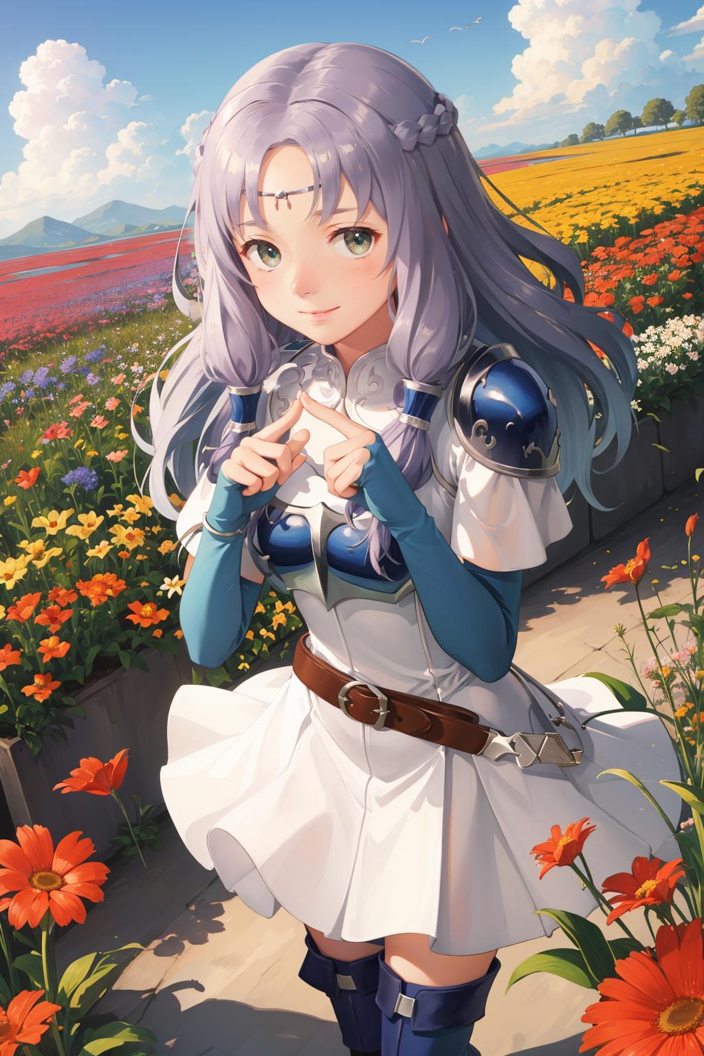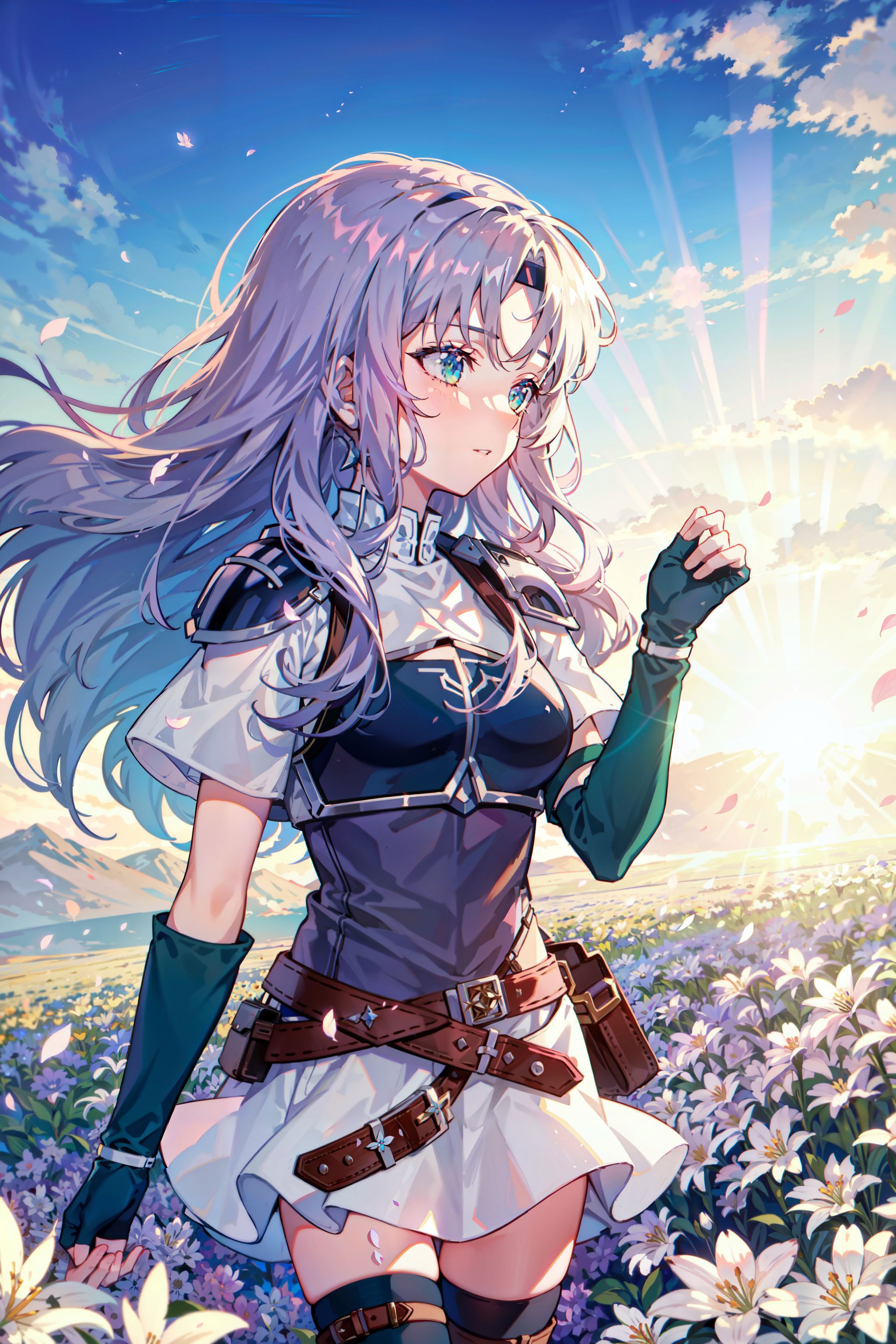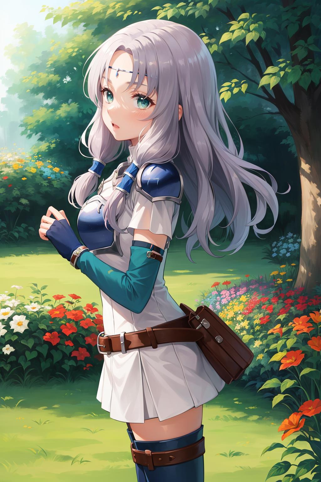 Add "circlet, armor, white dress, fingerless gloves, belt, thigh boots" for her typical look.