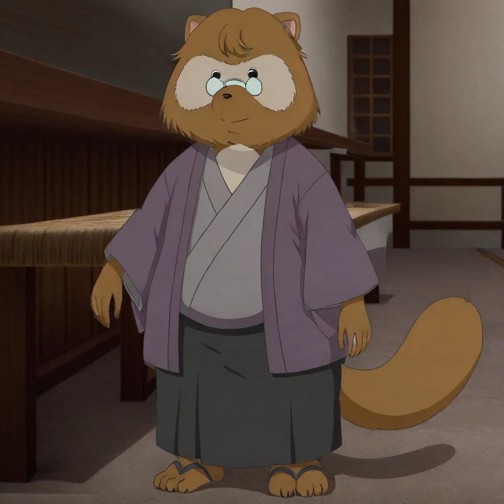 Hakkabou, furry, tanuki, brown fur, two-tone fur, black eyes, glasses, purple kimono, tail