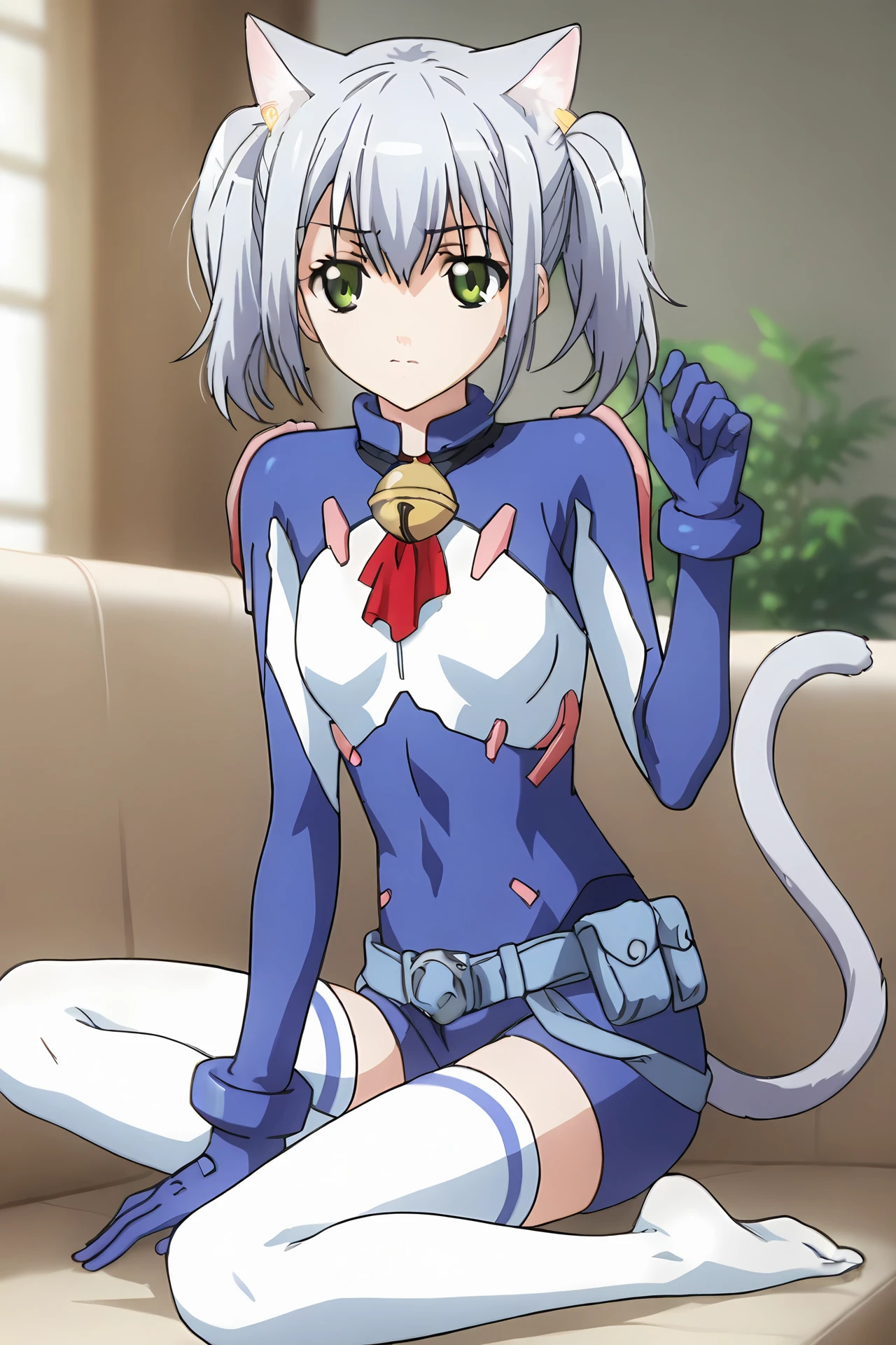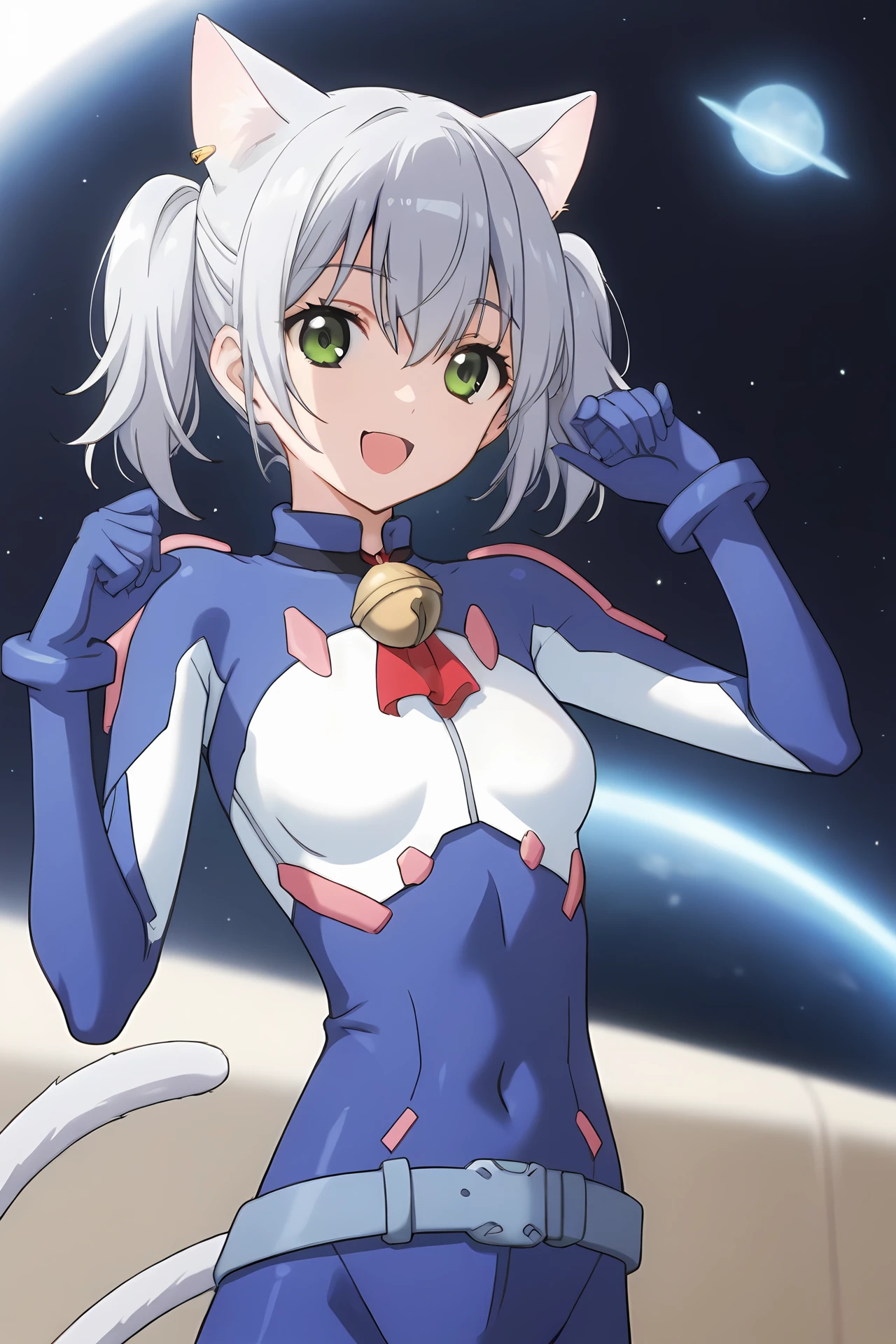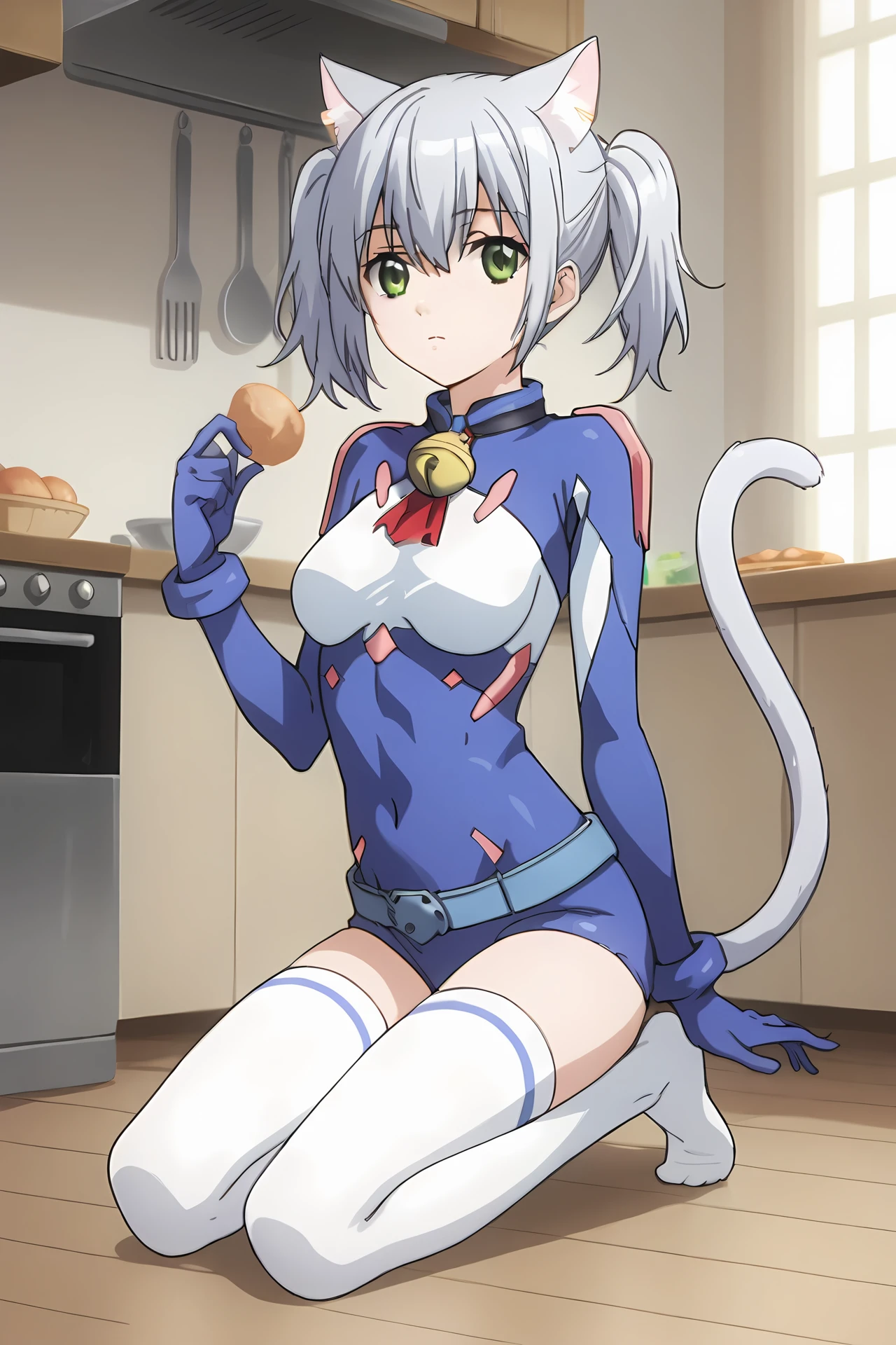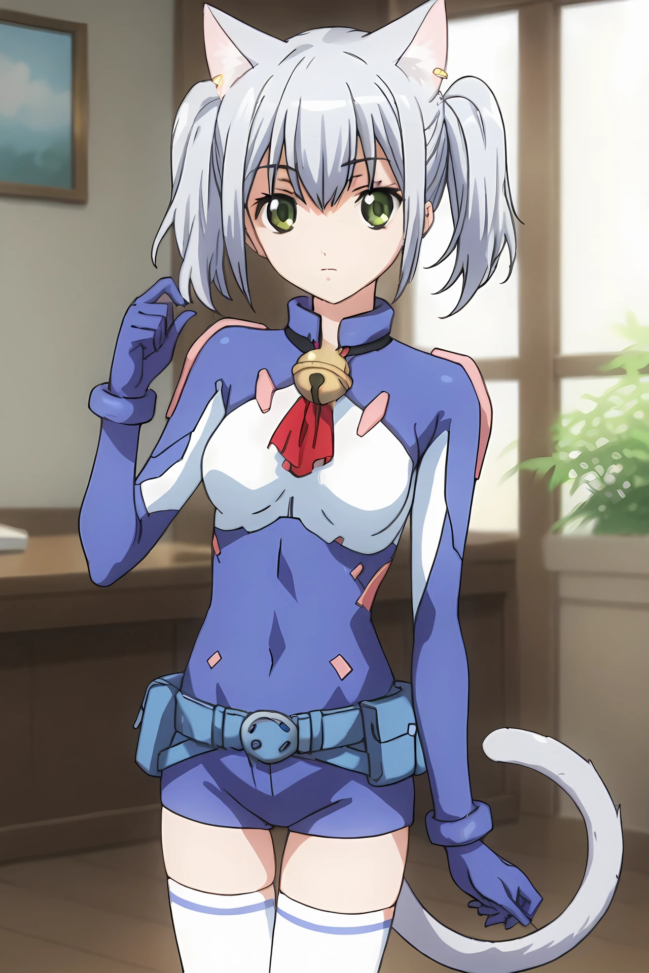 short hair, short twintails, bangs, sidelocks, grey hair, hair between eyes, green eyes, cat ears, cat tail, neck bell