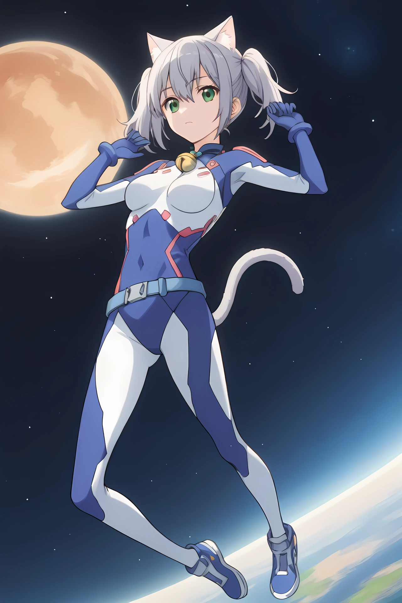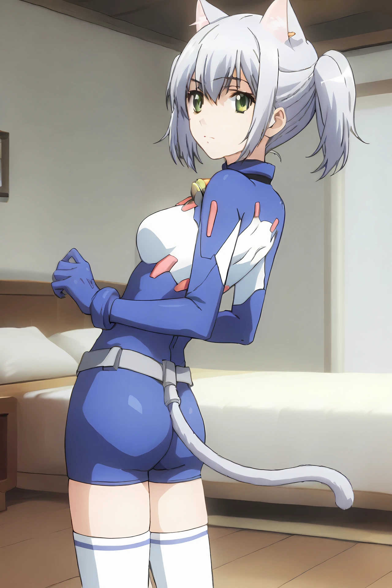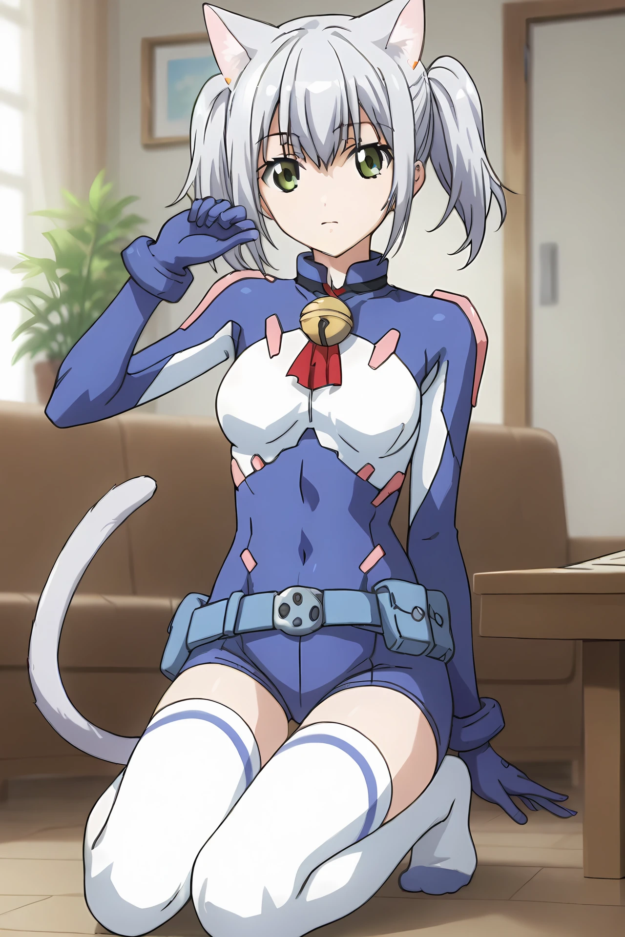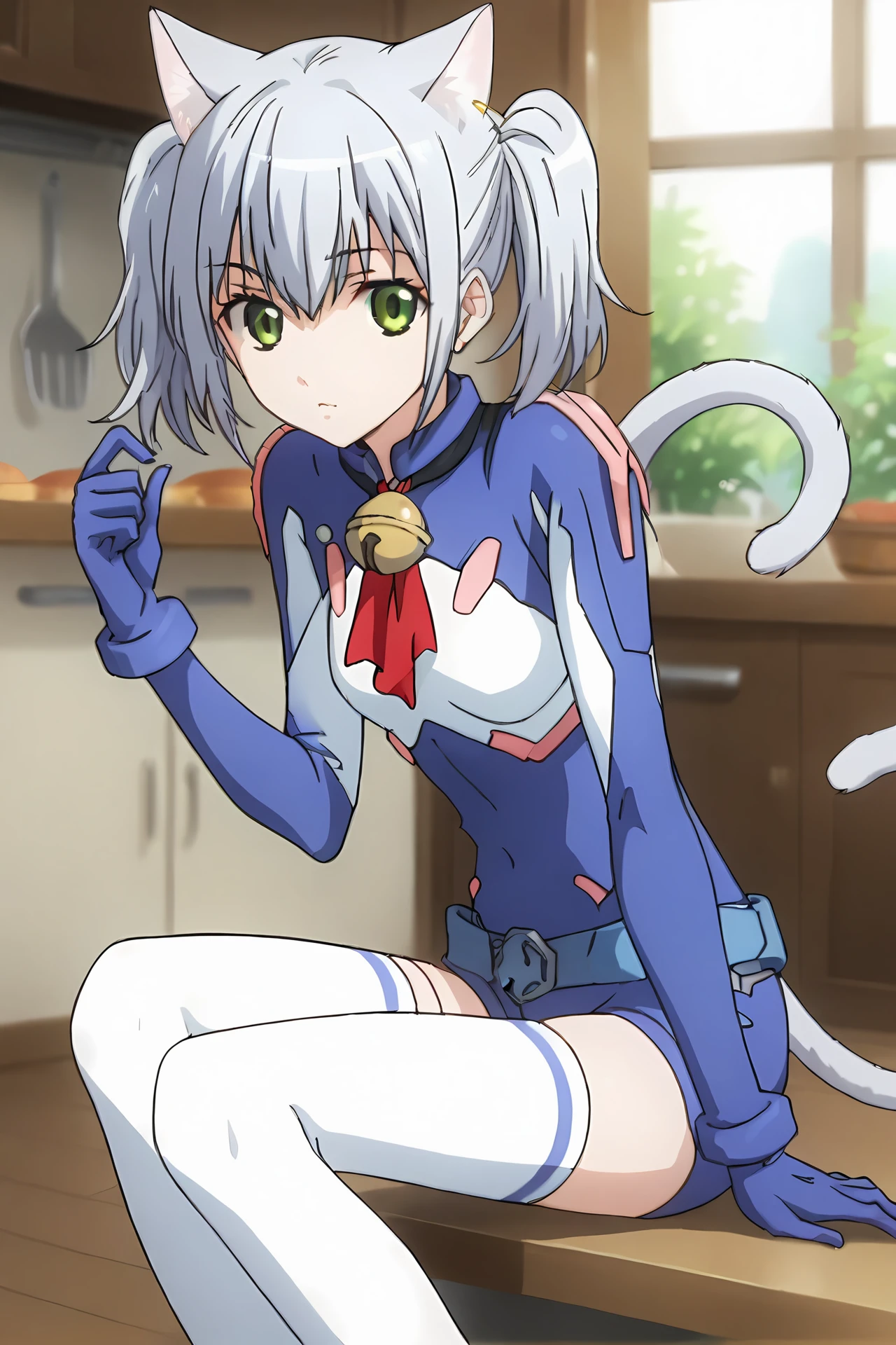 short hair, short twintails, bangs, sidelocks, grey hair, hair between eyes, green eyes, cat ears, cat tail, neck bell