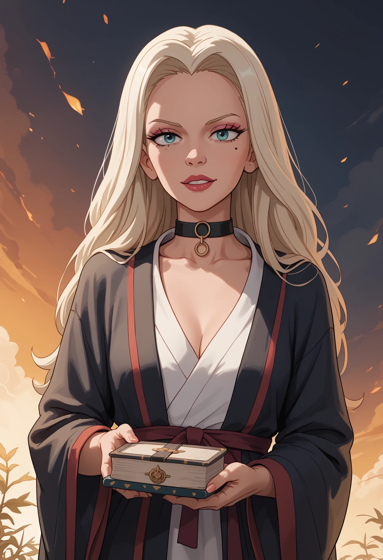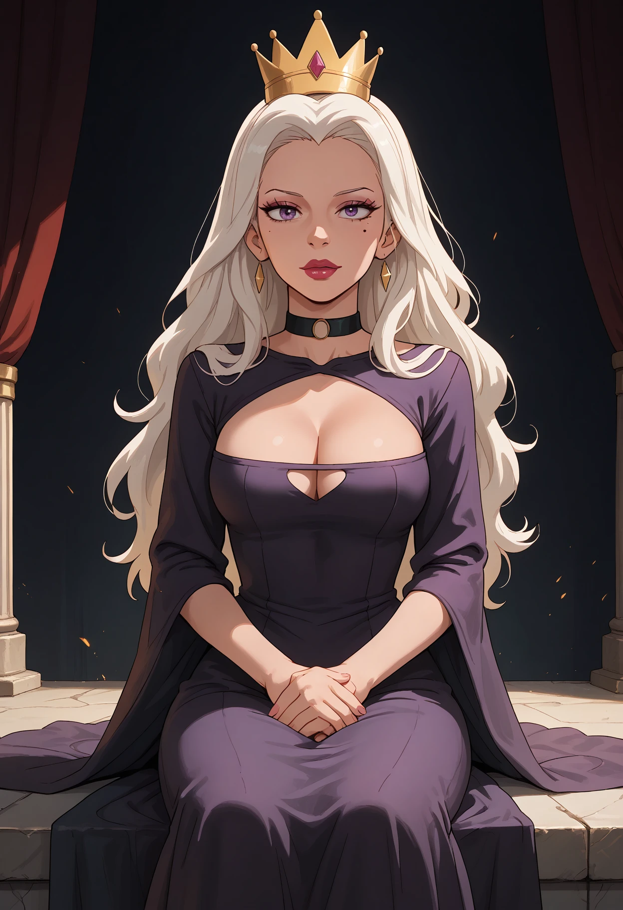 main tags: 1girl, solo, long hair, white hair, mole, mole under eye, breasts, medium breasts, makeup, lipstick,