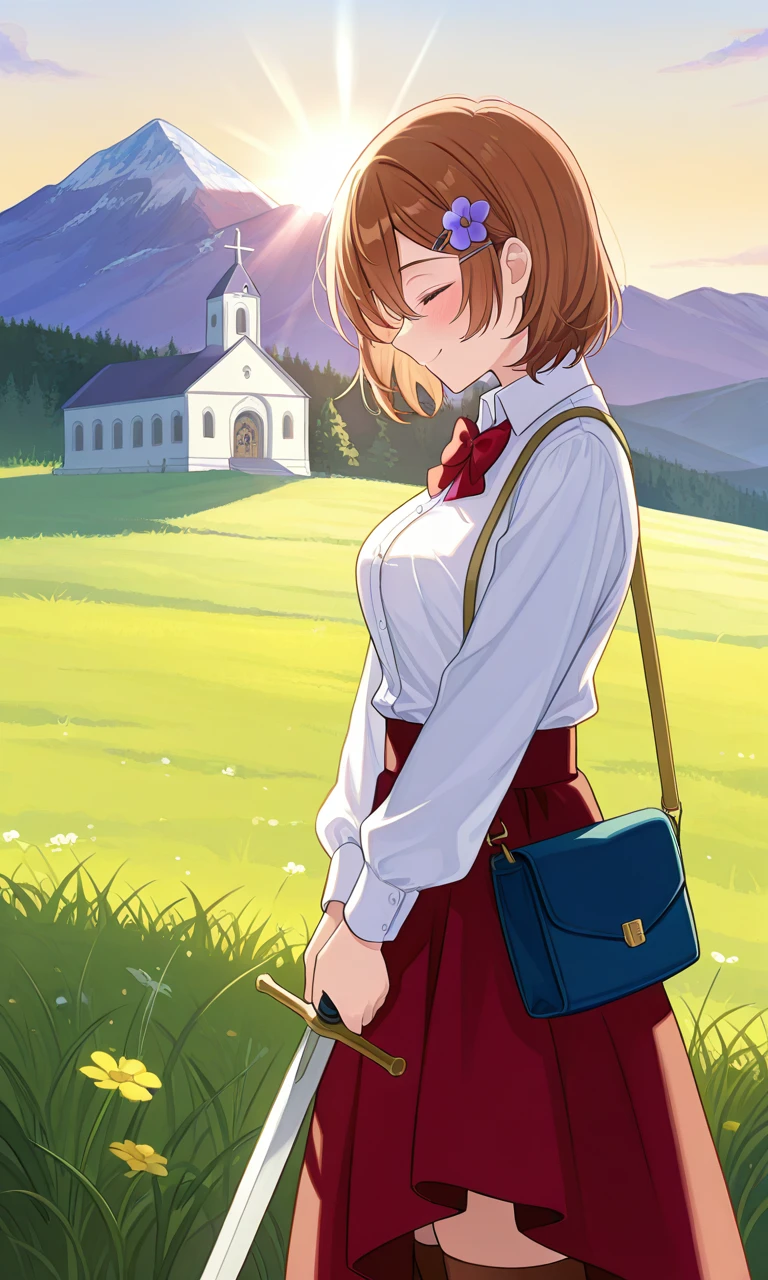 white shirt, long sleeves, neckbow, red skirt, long sleeves, brown bag, brown thighhighs, brown footwear, boots,