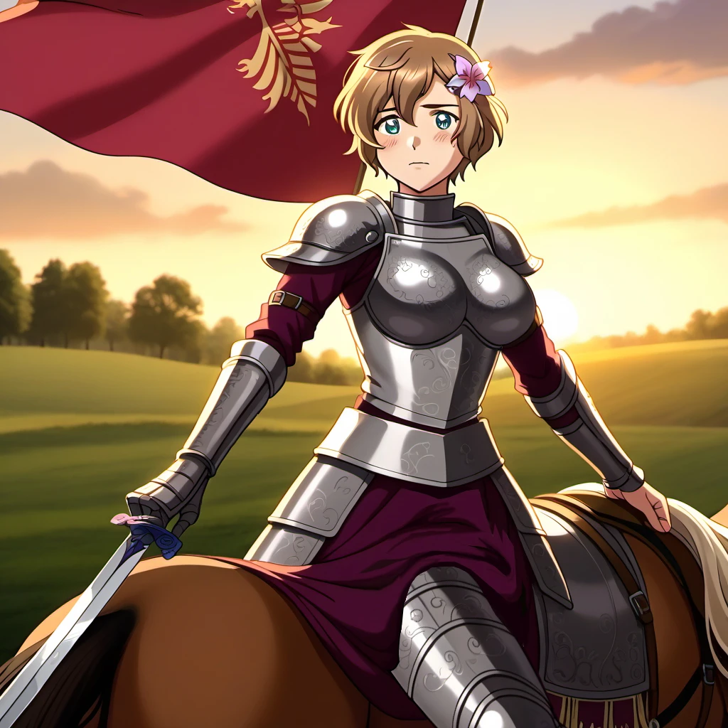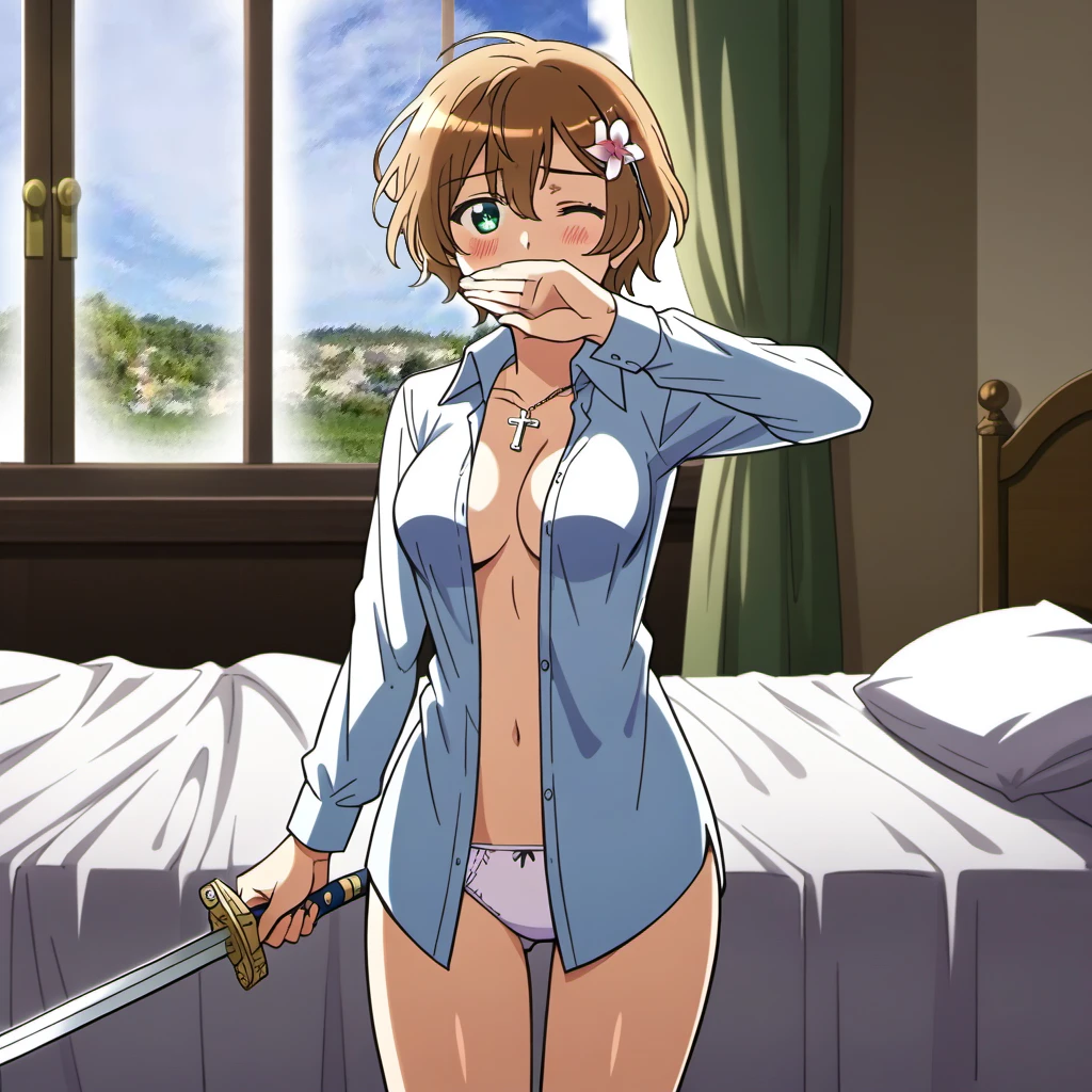 1girl, lisahetalia, brown hair, short hair, green eyes, hair flower, hair ornament, breasts,