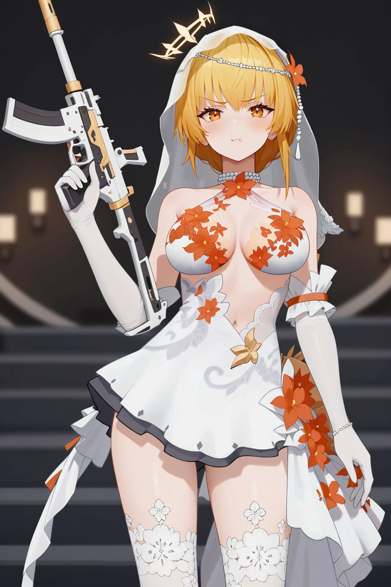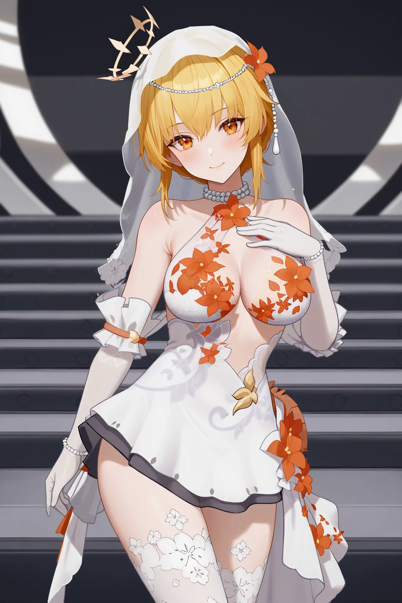 dress, veil, jewelry, gloves, thighhighs, floral_print, large_breasts, white_footwear