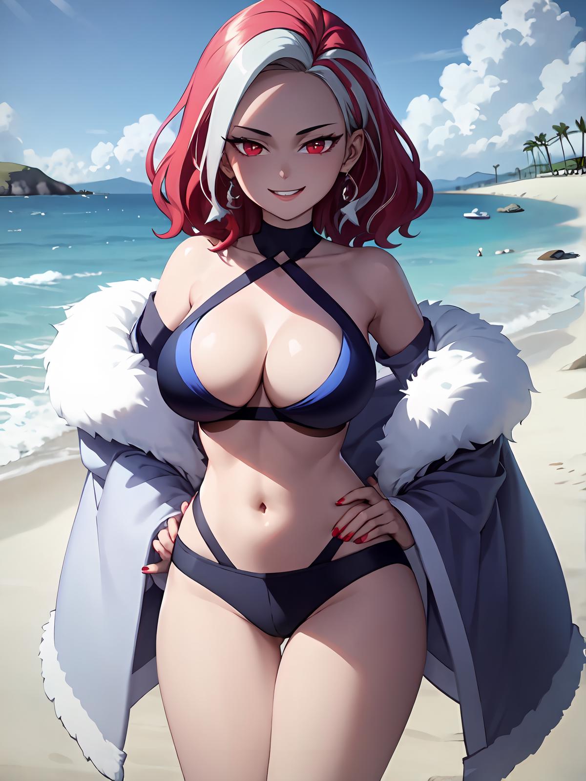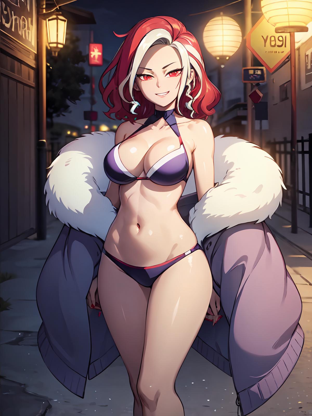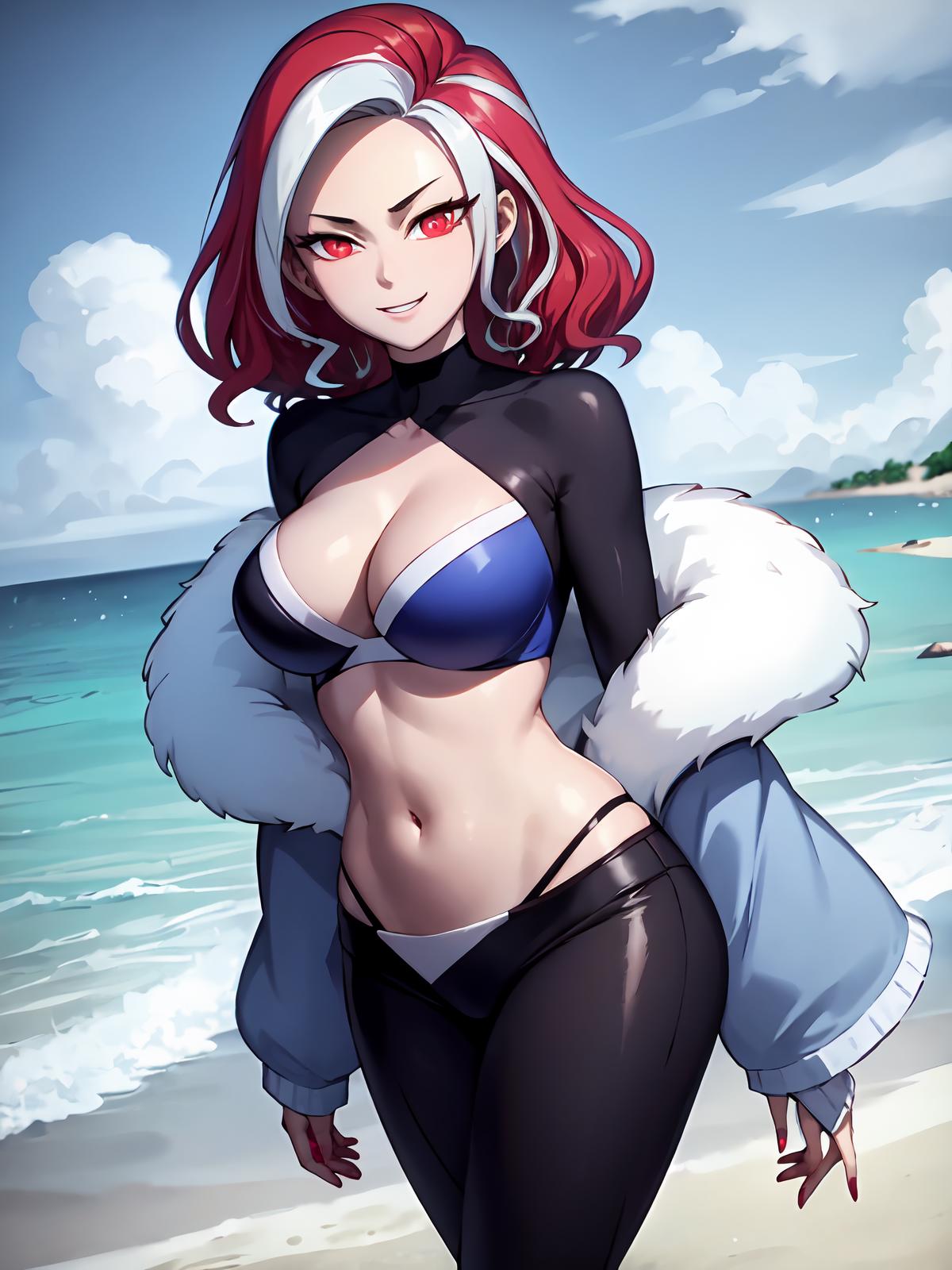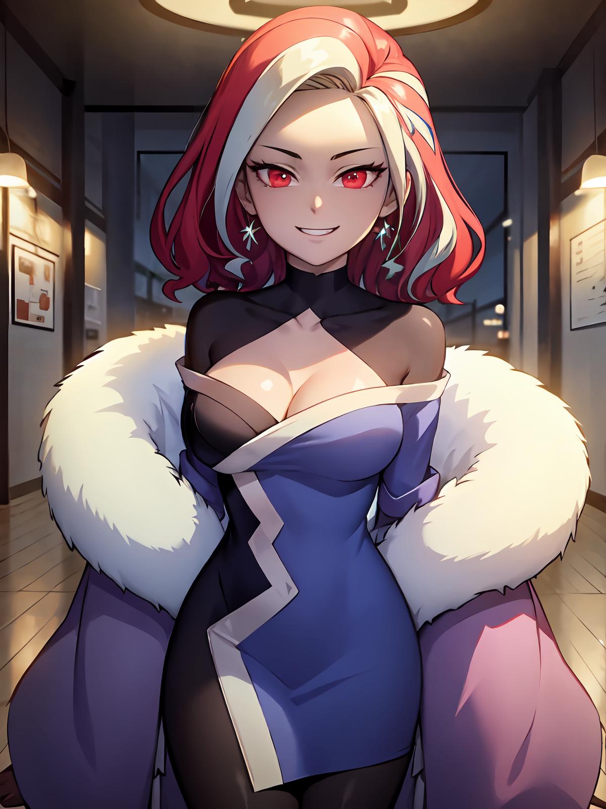 wide sleeves, pantyhose, clothing cutout,choker,coat,multicolored hair ,white hair ,red eyes ,red hair ,two-tone hair ,breasts ,cleavage ,fur trim ,smile ,streaked hair ,red nails ,large breasts,dress