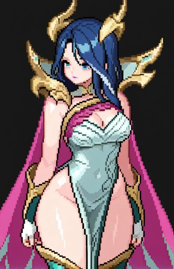fae_dradon_ashe, blue eyes, pink lips,long dark blue hair, dragon-like golden horns, mint green scaly dress,green thigh-high boots, golden armor details, leaf-like shoulder armor,pink-purple flowing cape, gold trim,