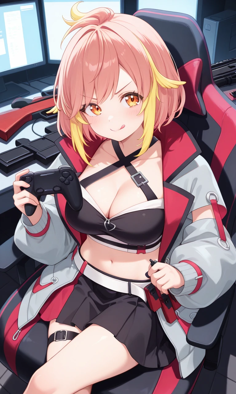 hikari gamer, short hair, grey jacket, two-sided jacket, red inner fabric, black crop top, cleavage, cross-criss halter, navel, white belt, alt black skirt, thigh strap🎤Idol outfit: