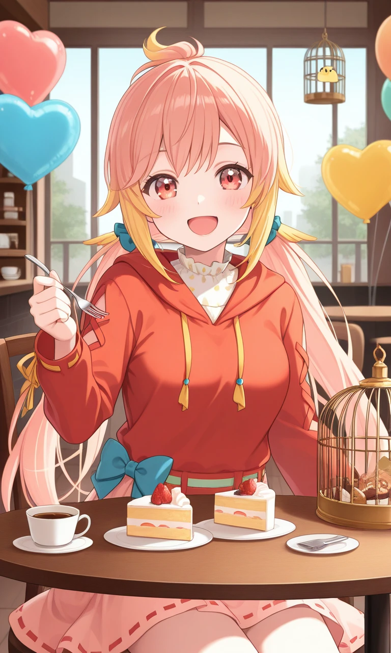 hikari legacy, very long hair, low twintails, red hoodie, ribbon trim, long sleeves, pink skirt, blue bow👕Old 2nd outfit: