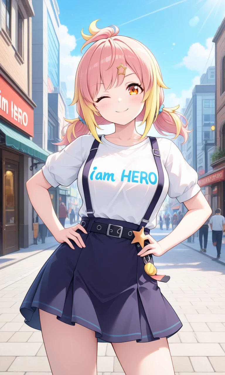 hikari iamhero, medium hair, low twintails, star hair ornament, white shirt, t-shirt, clothes writing, short sleeves, dark blue skirt, suspender skirt, black belt🕹️Old 3rd outfit: