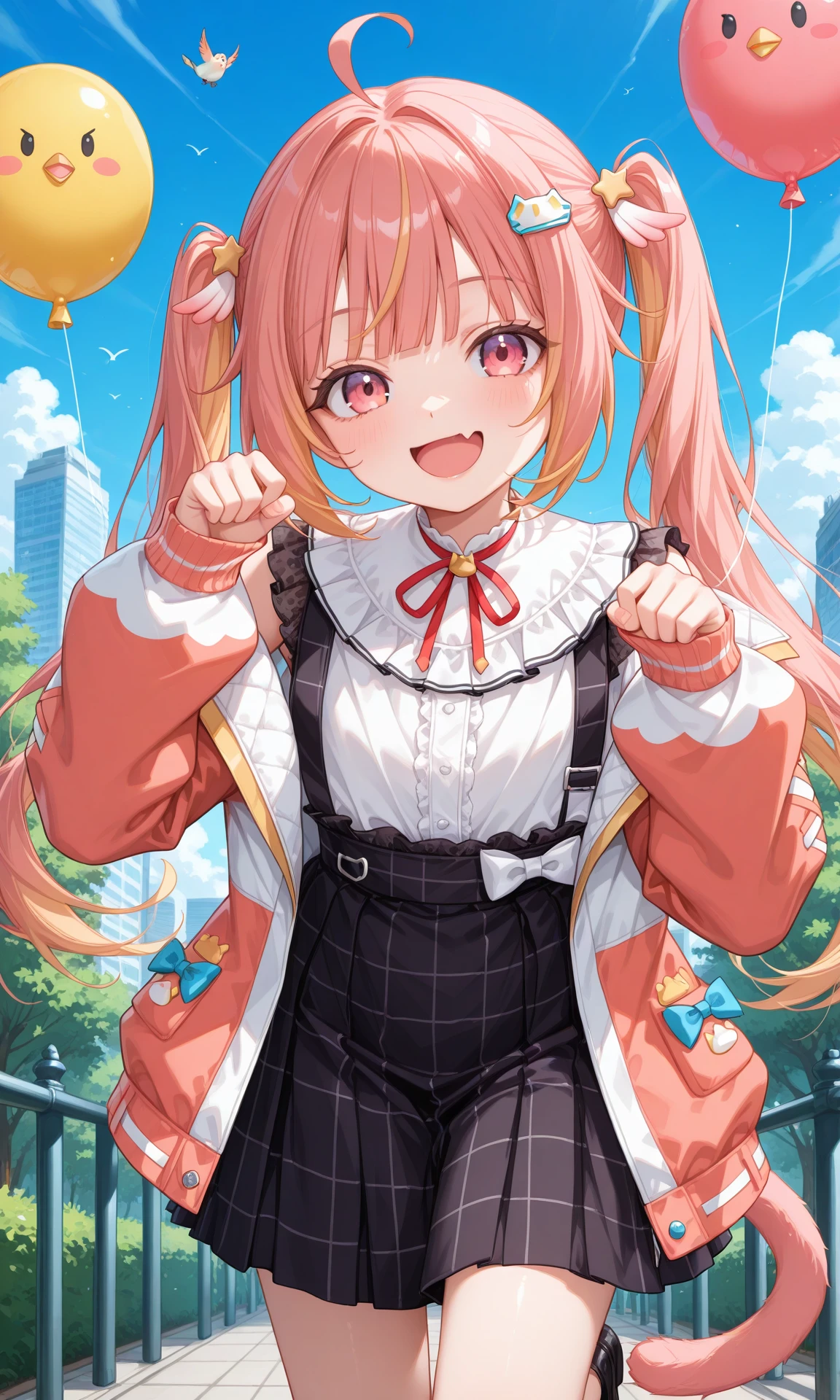 hira hikari, twintails, long hair, hair ornament, pink jacket, two-tone jacket, white shirt, frilled shirt, shoulder cutout, red ribbon, neck ribbon, black skirt, high-waist skirt, suspender skirt, plaid skirt, cat tailYou can remove