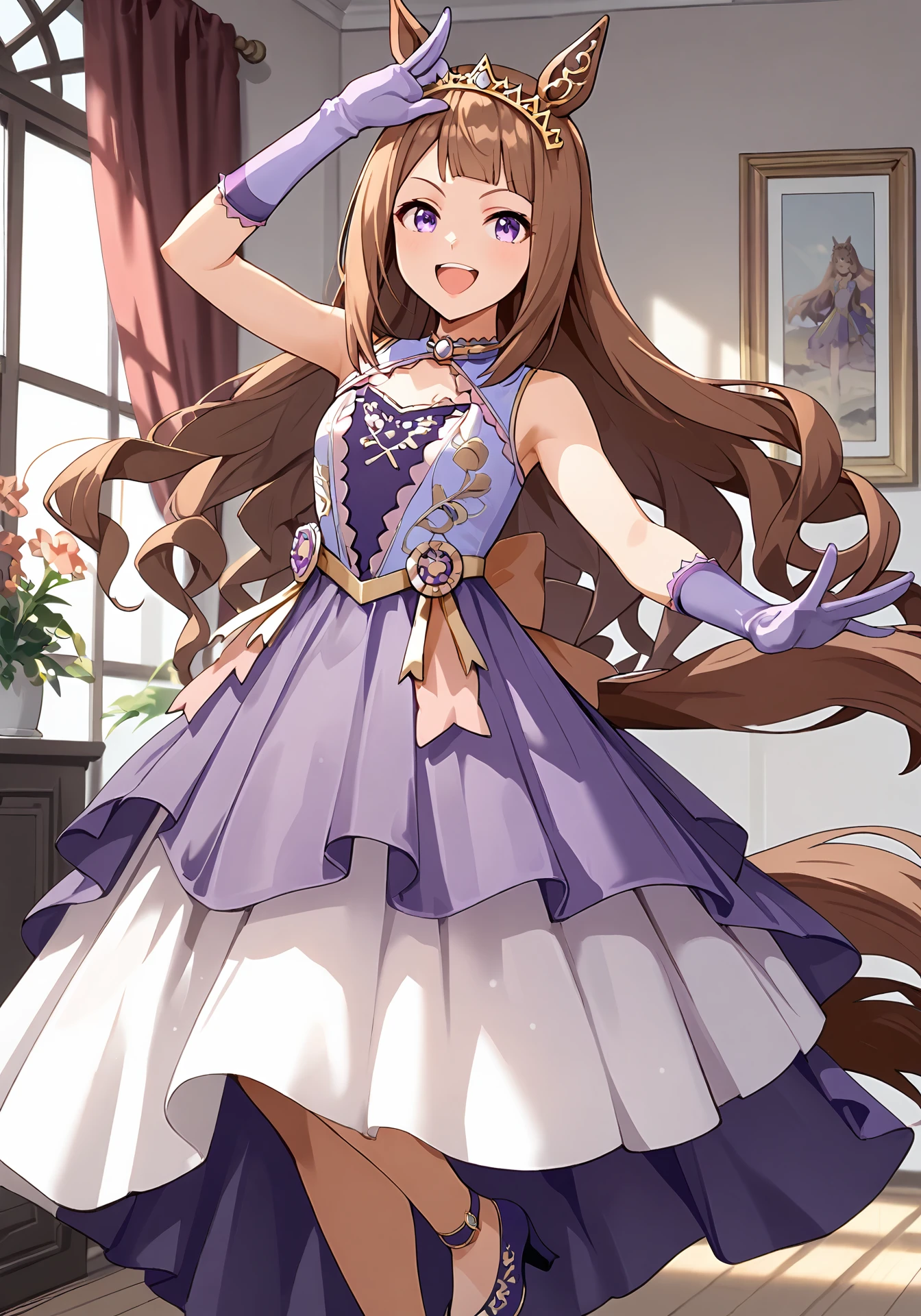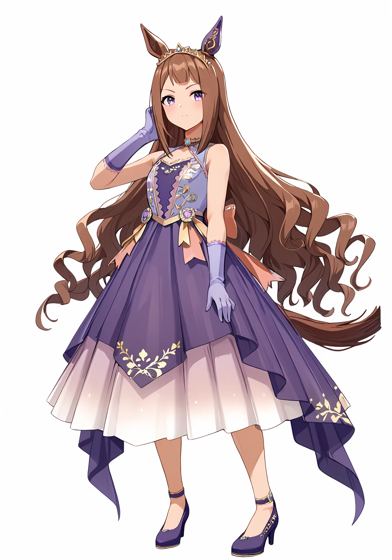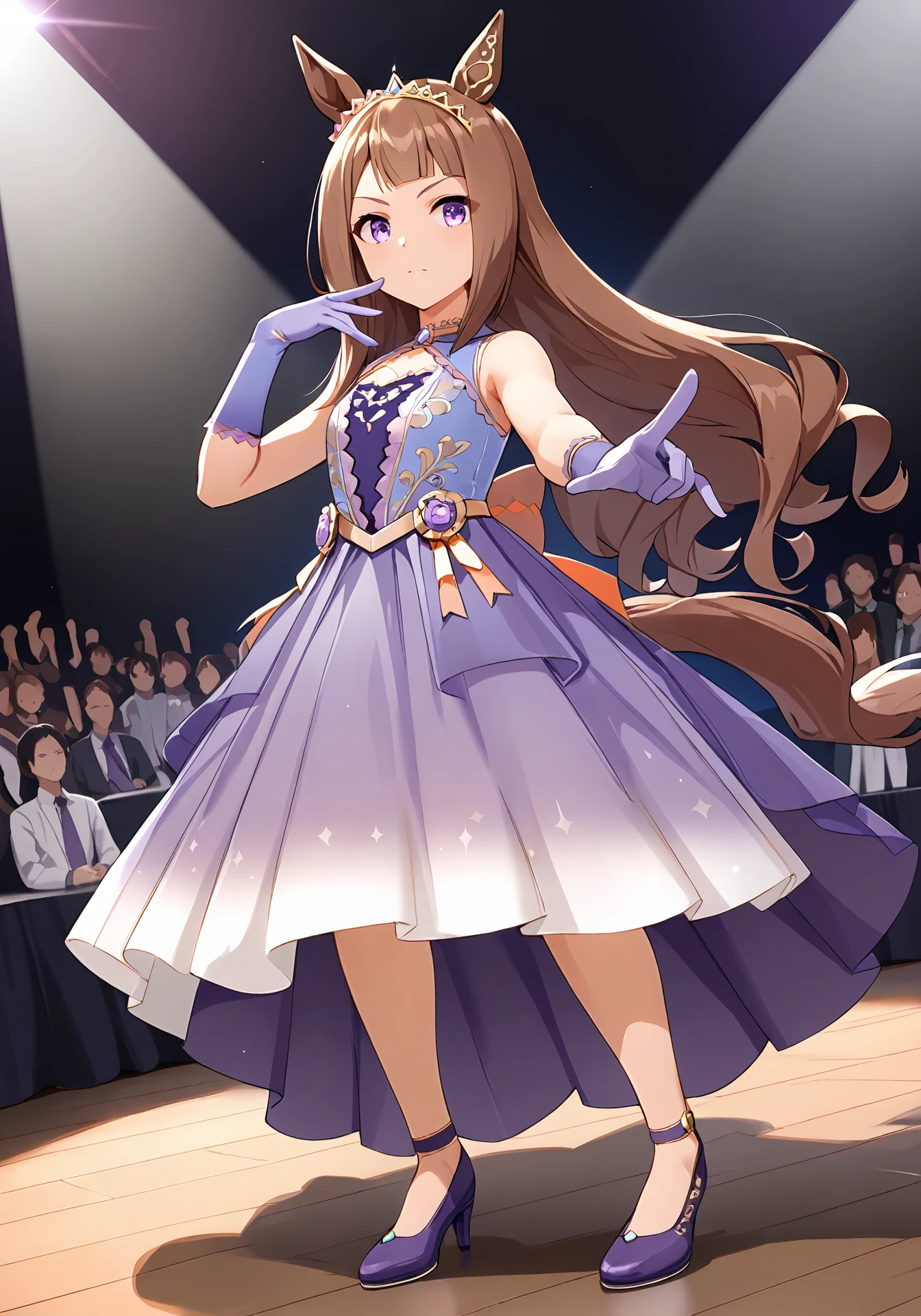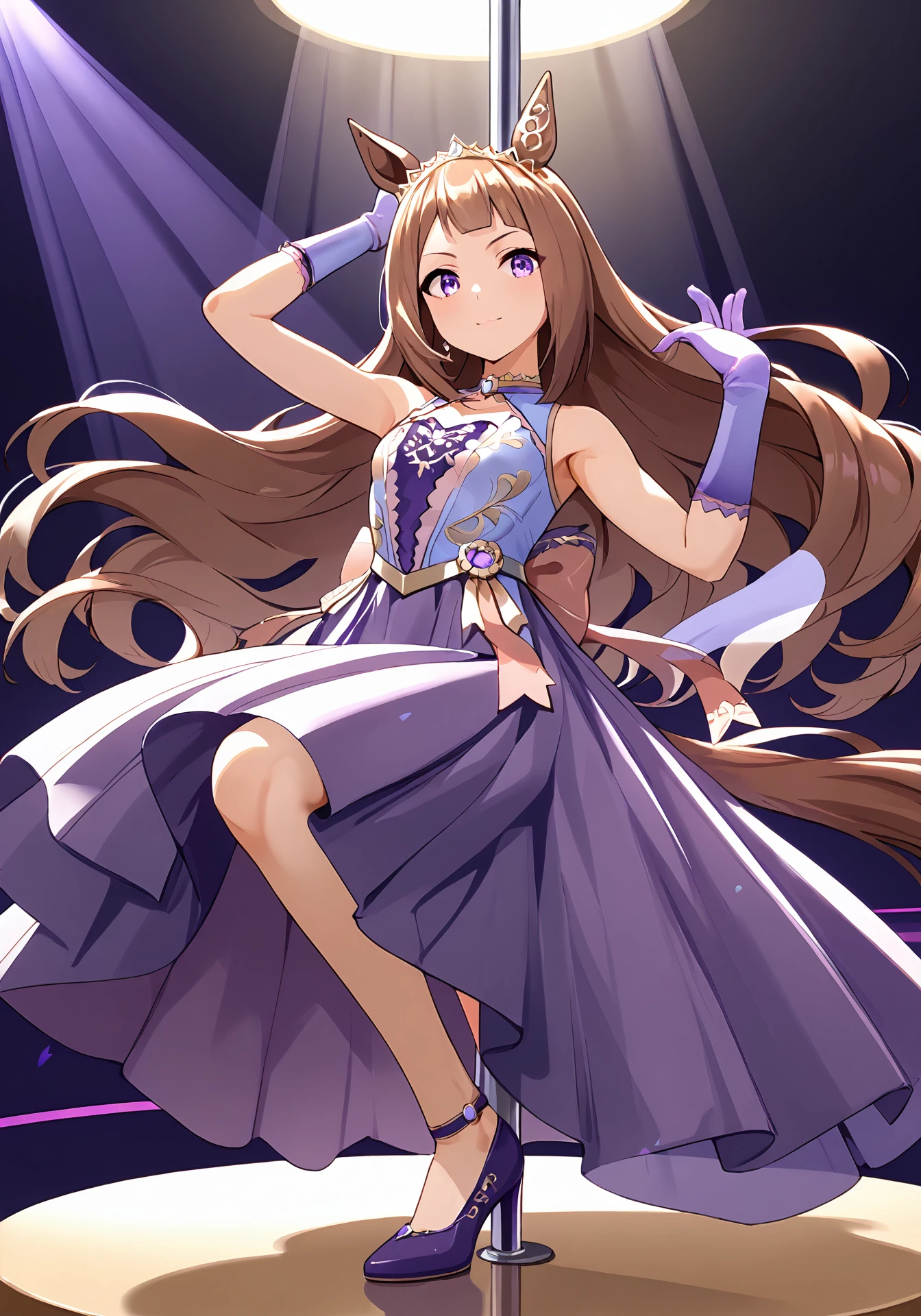 STreal,purple sleeveless dress,purple gloves,purple high heels,tiara,single ear cover
