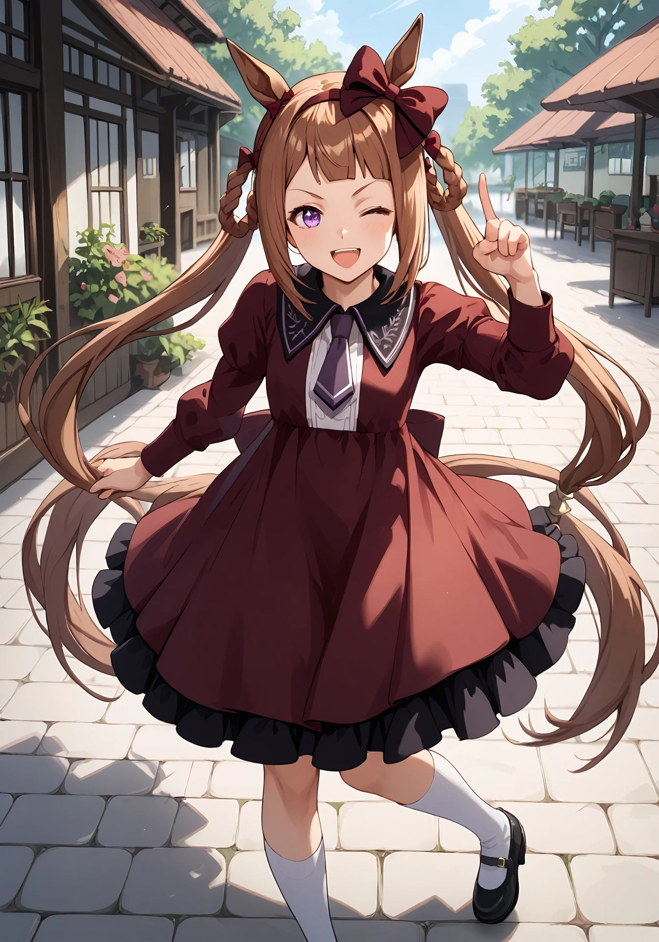 STschoolLong,tracen school uniform,white bow,white back bow,purple sailor shirt,long sleeves,purple pleated skirt,purple thighhighs,brown loafers,hair rings,twintails