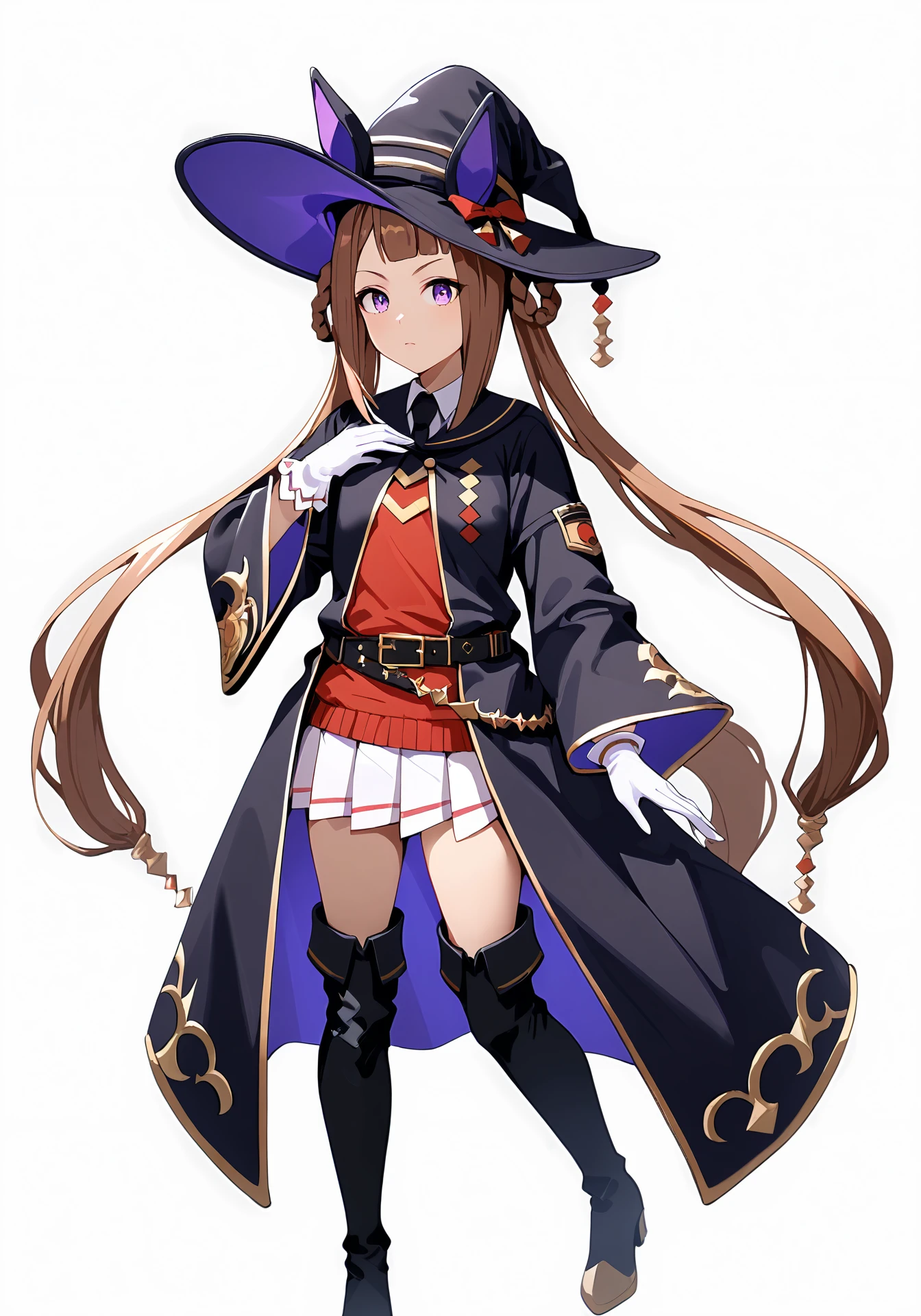 STwitch,black robe,white pleated skirt,red shirt,black belt,white gloves,black thigh boots,black necktie,hair rings,twintails