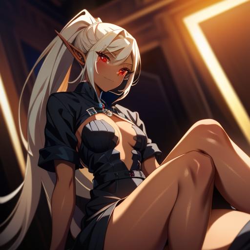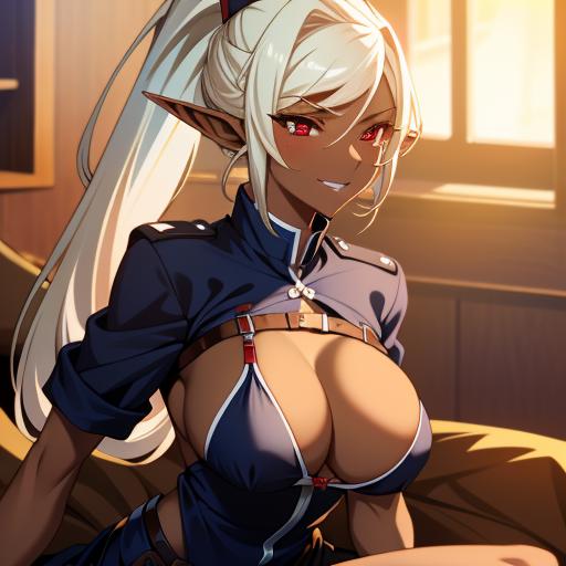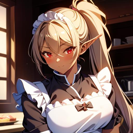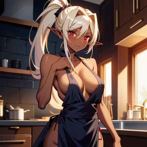 Trigger prompts: pony tails, medium breasts, red eyes, pointy ears, dark skin, blonde hair