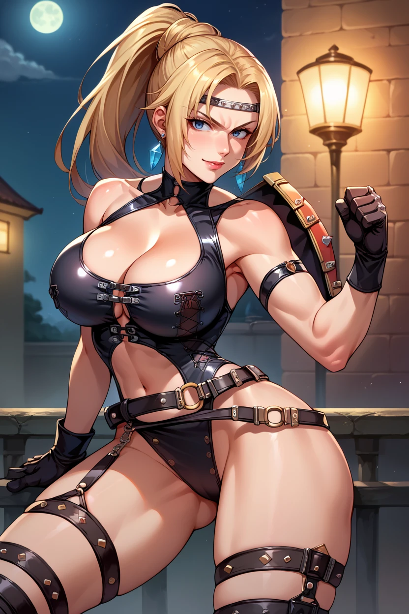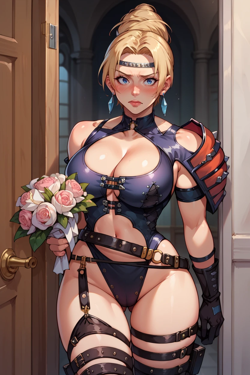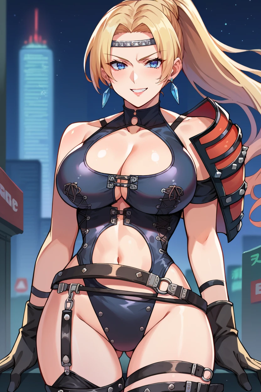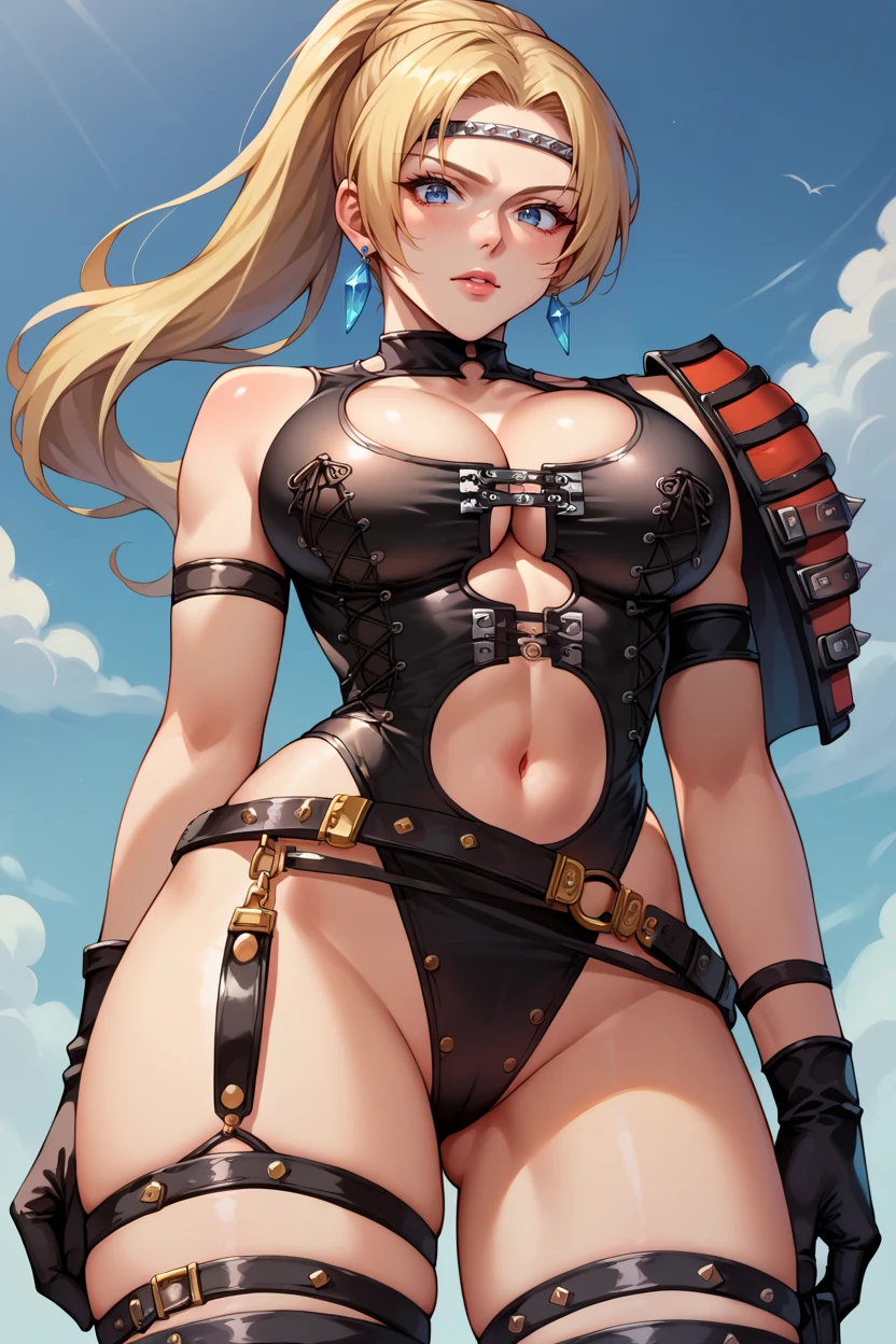 circlet, earrings, black leotard, cleavage cutout, navel, belt, shoulder armor, gloves, thigh strap, garter straps, thigh boots