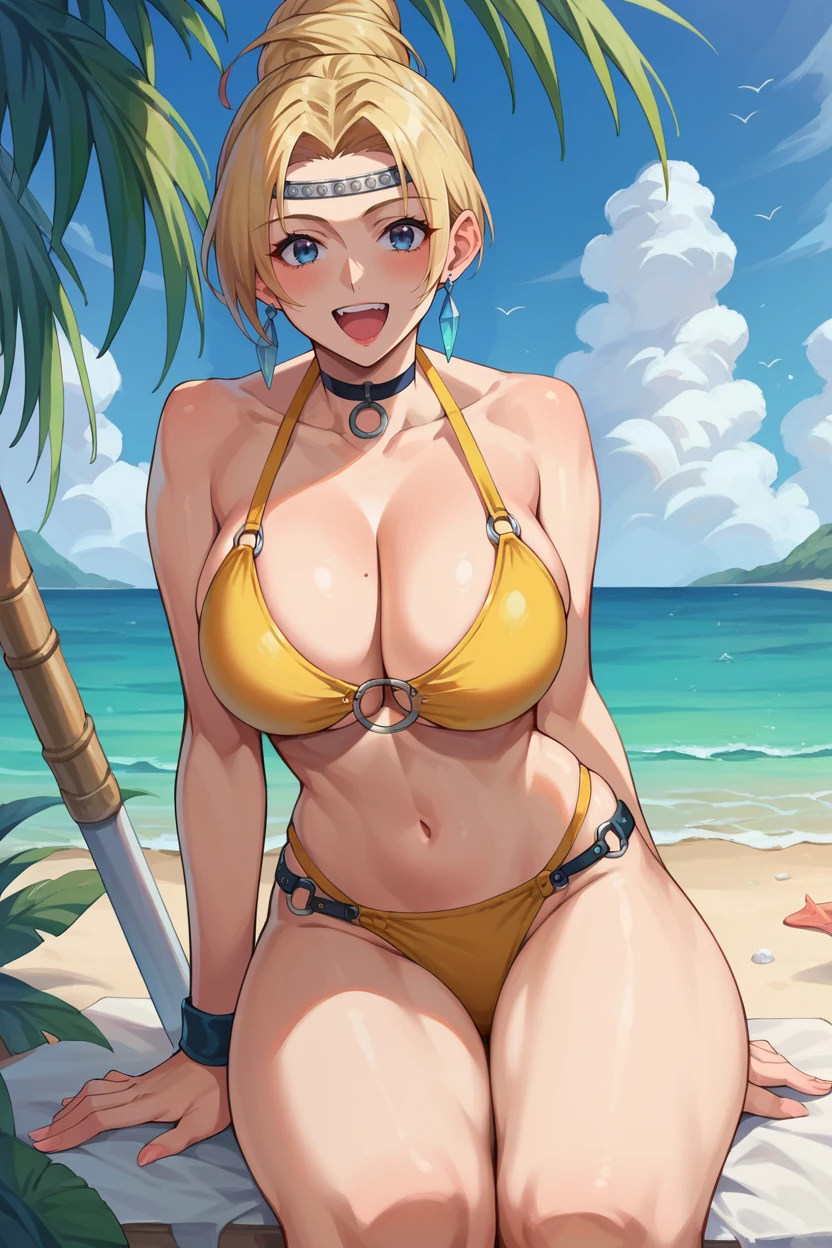 Add "circlet, earrings, black leotard, cleavage cutout, navel, belt, shoulder armor, gloves, thigh strap, garter straps, thigh boots" for her typical look.