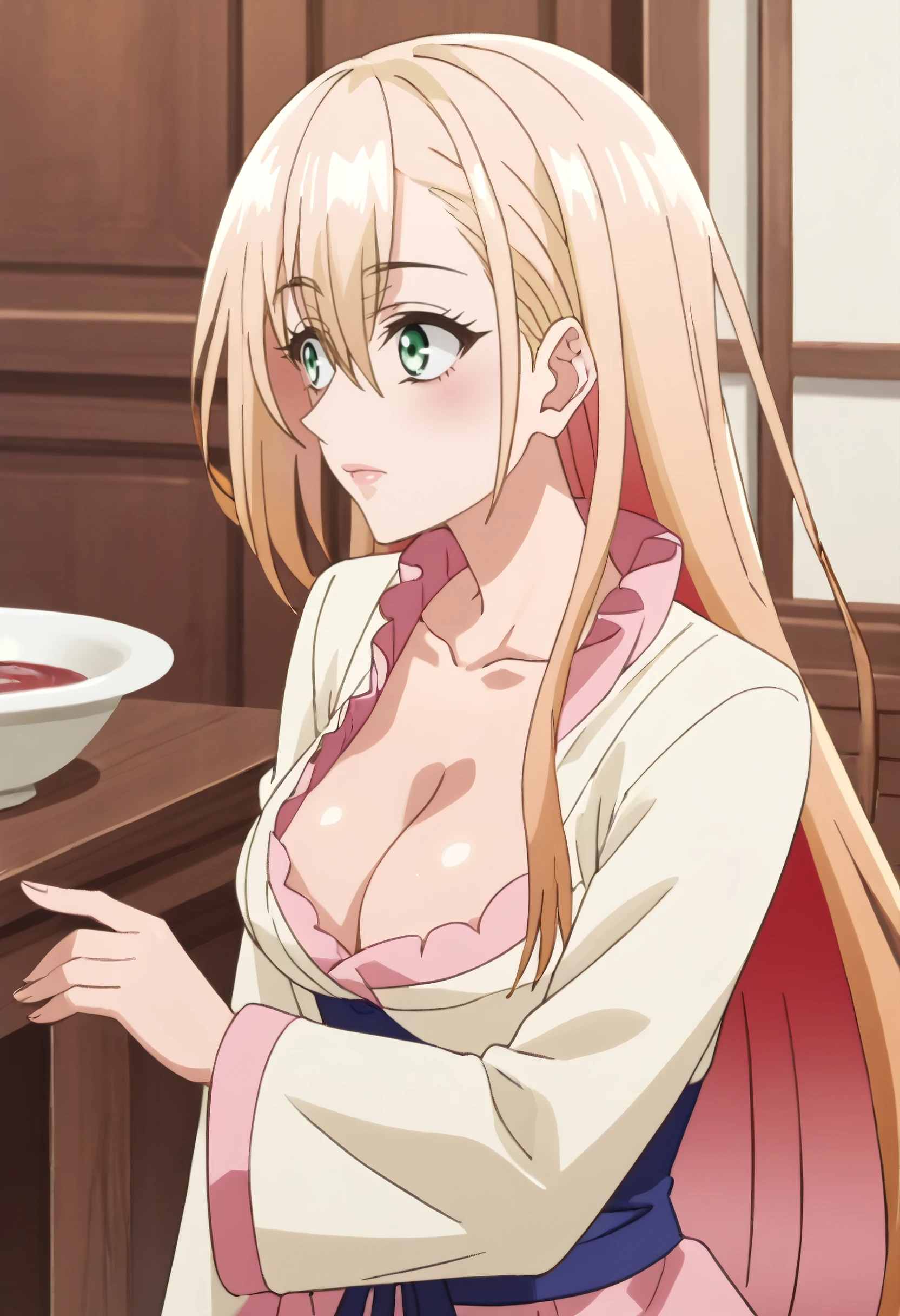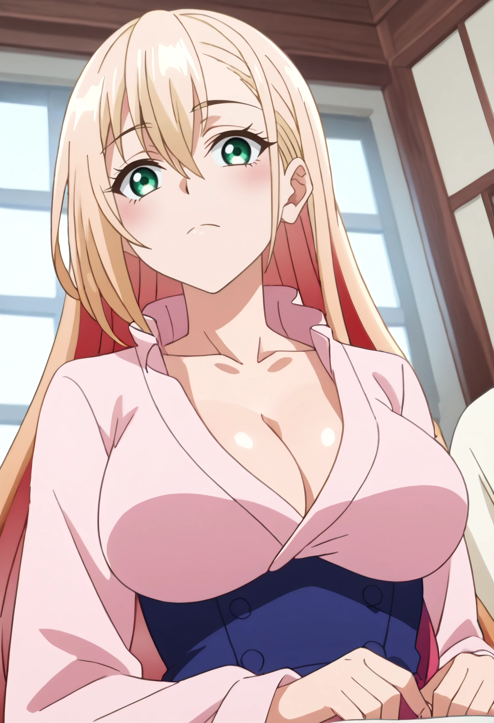 PrimulaBath, long sleeves, bathrobe, pink bathrobe, sleeves past wrists, wide sleeves, cleavage, collarbone,