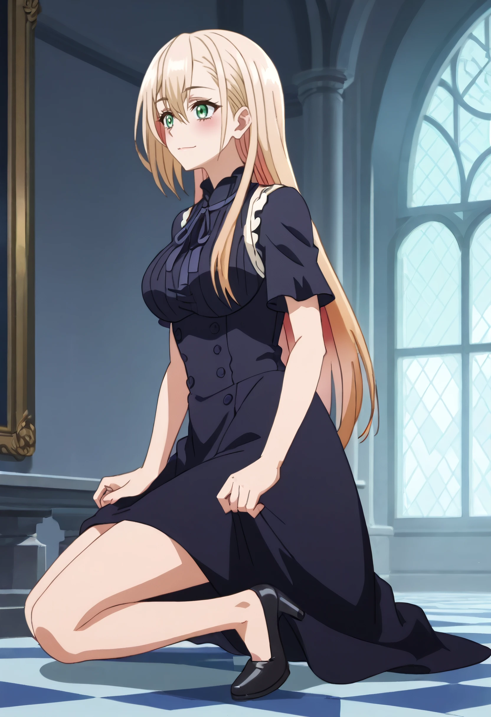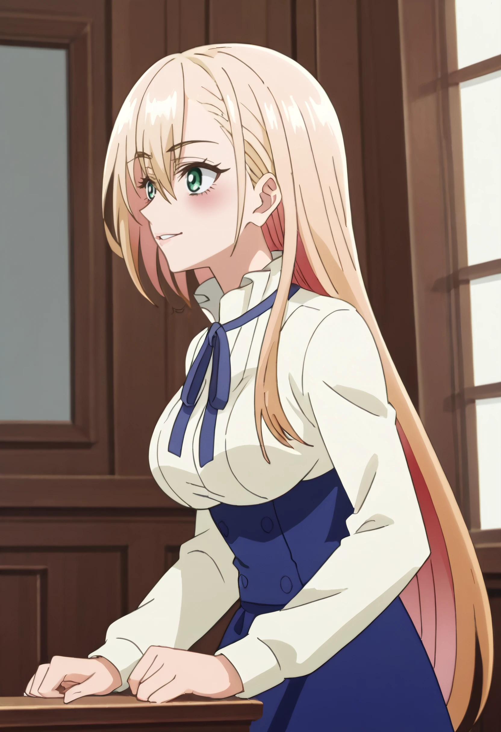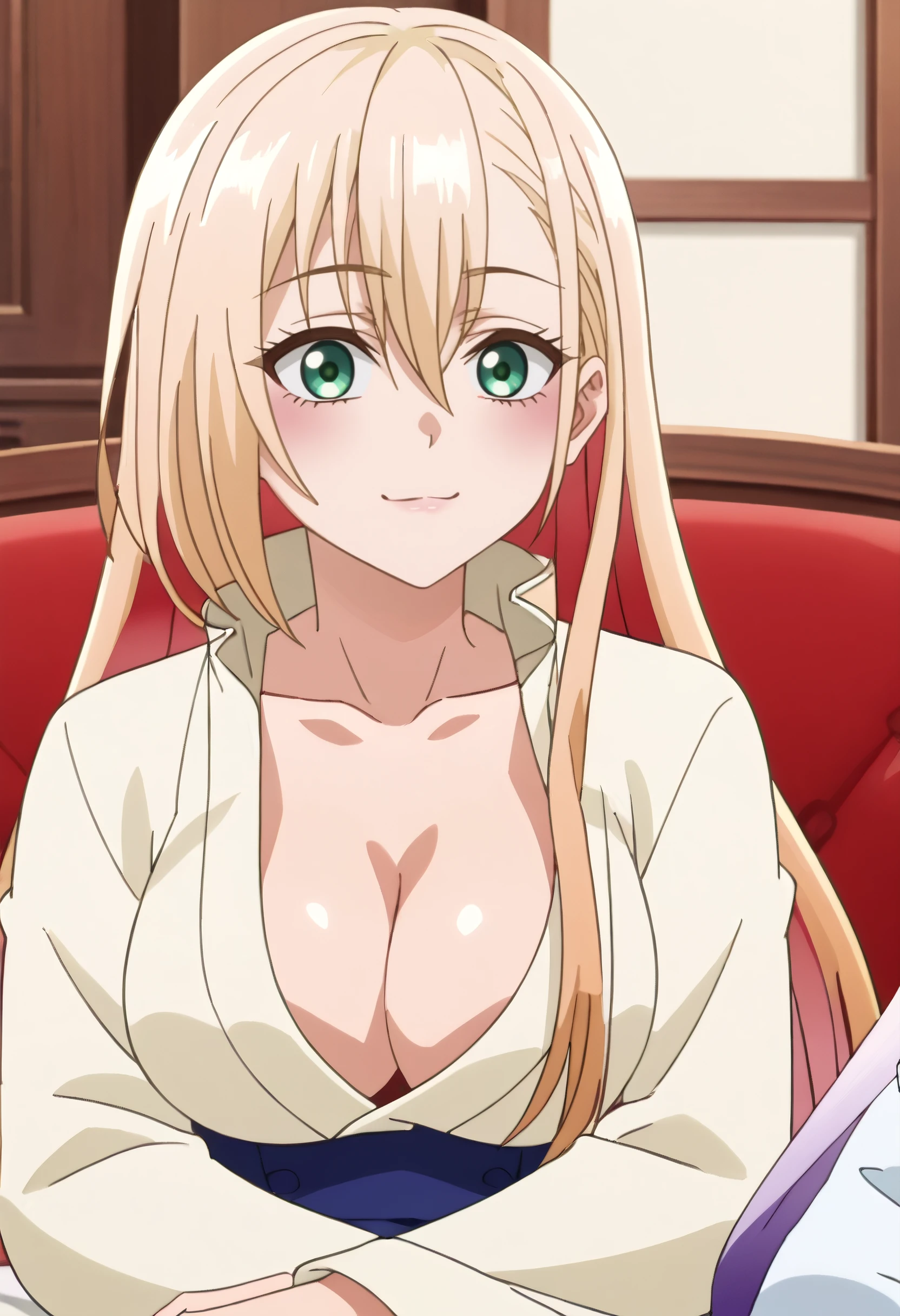 A4OPrimula, blonde hair, long hair, bangs, green eyes, hair between eyes, eyebrows visible through hair,