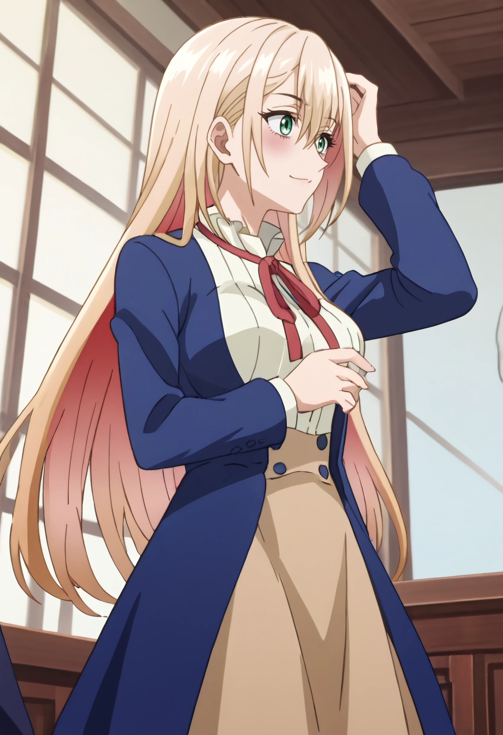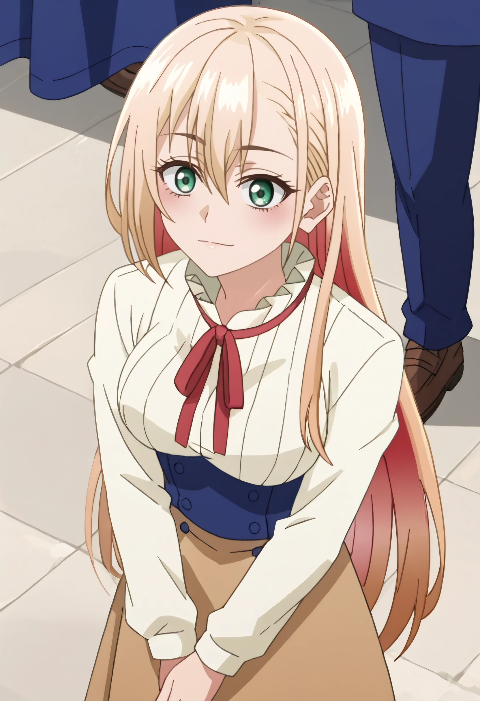 PrimulaBlueShirt, ribbon, school uniform, red ribbon, neck ribbon, long sleeves, collared shirt, shirt, jacket, blue jacket, blue shirt, skirt, long skirt, brown skirt,
