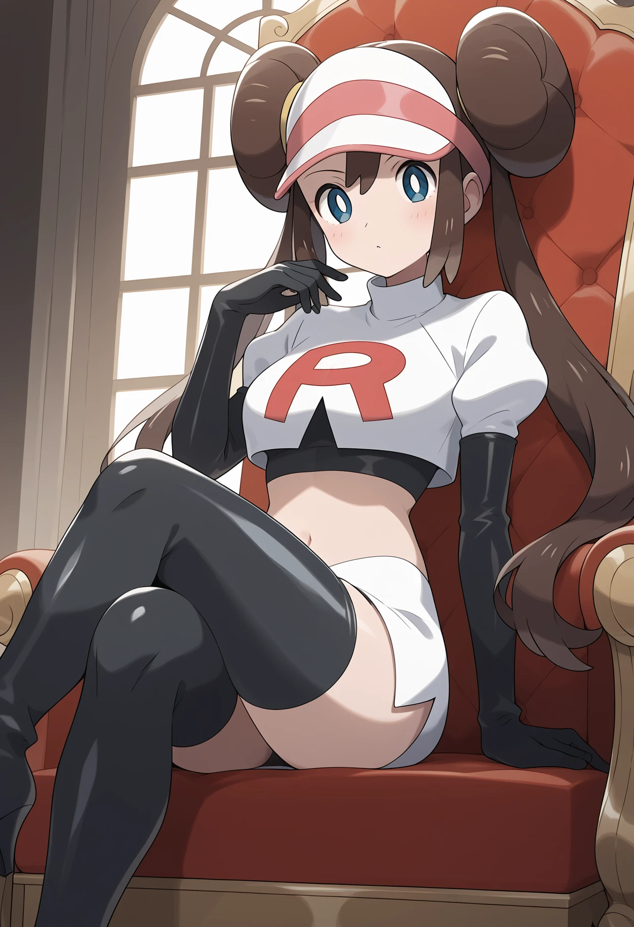 outfit3aarosa, long hair, brown hair, double bun, twintails, visor cap, blue eyes, medium breasts, cosplay, team rocket uniform, crop top, white jacket, puffy sleeves, elbow gloves, black gloves, midriff, pencil skirt, white skirt, black thighhighs