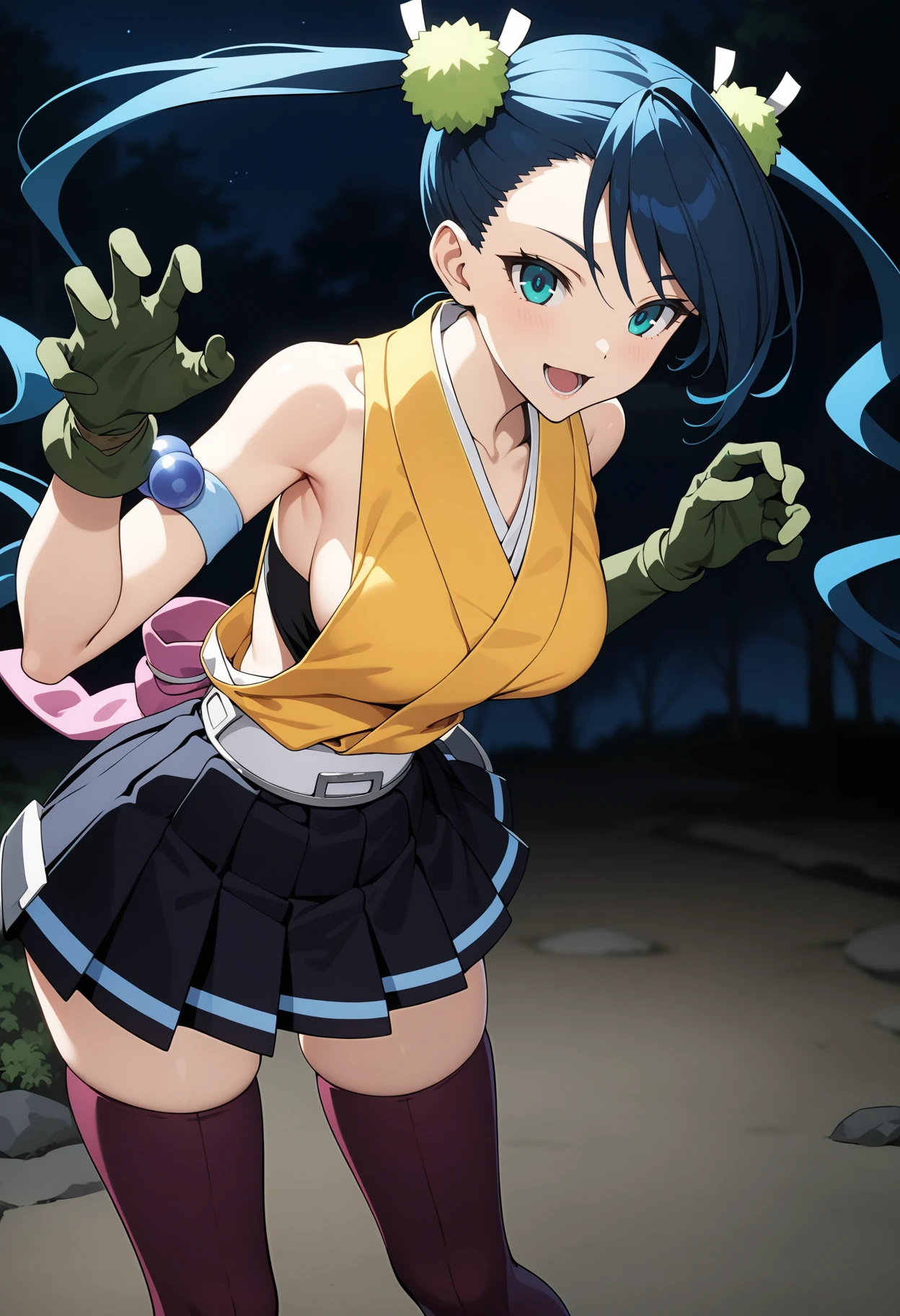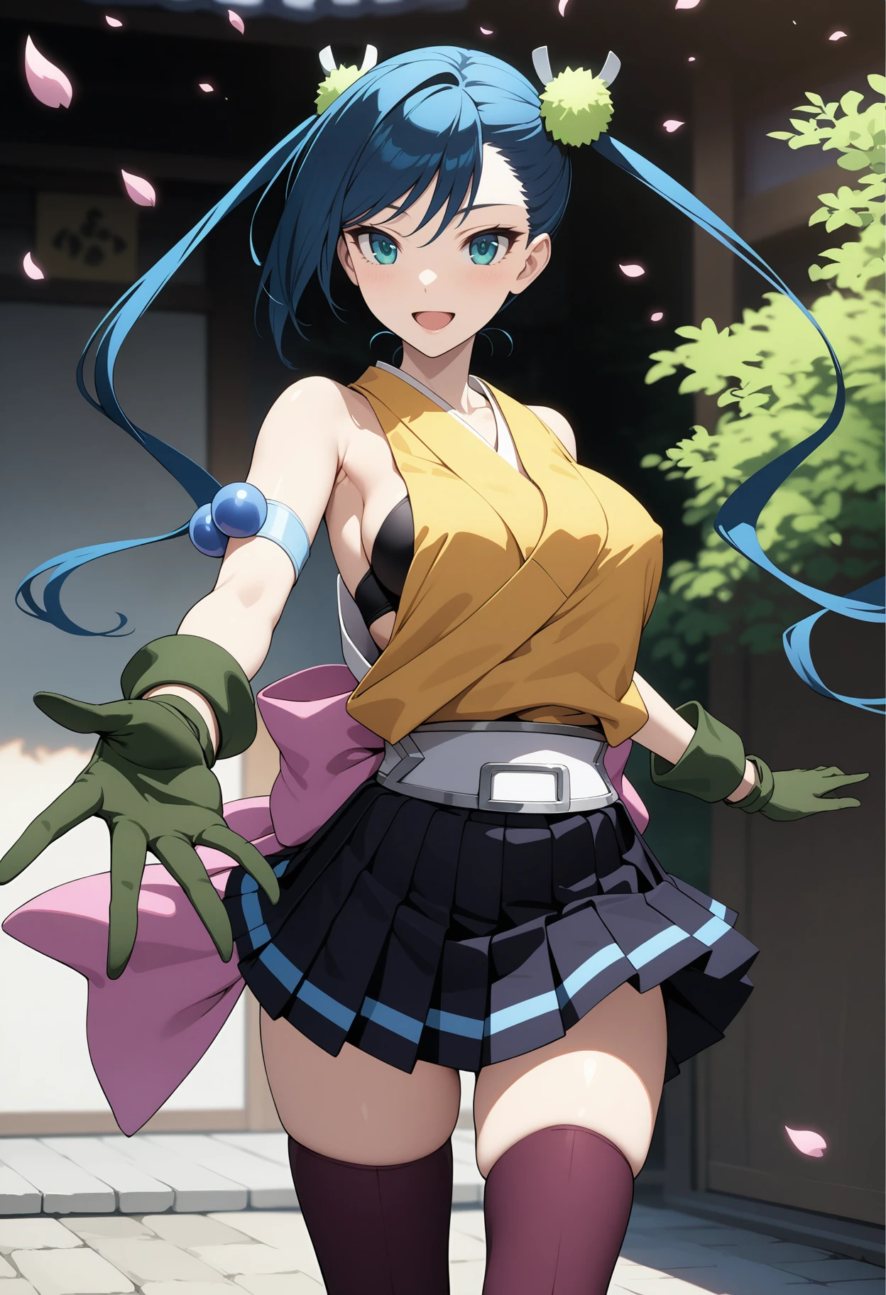 outfit1aahibachi, long hair, blue hair, twintails, hair ornament, aqua eyes, breasts, japanese clothes, yellow shirt, sleeveless, armband, green gloves, white belt, pink bow, pleated skirt, black skirt, purple thighhighs