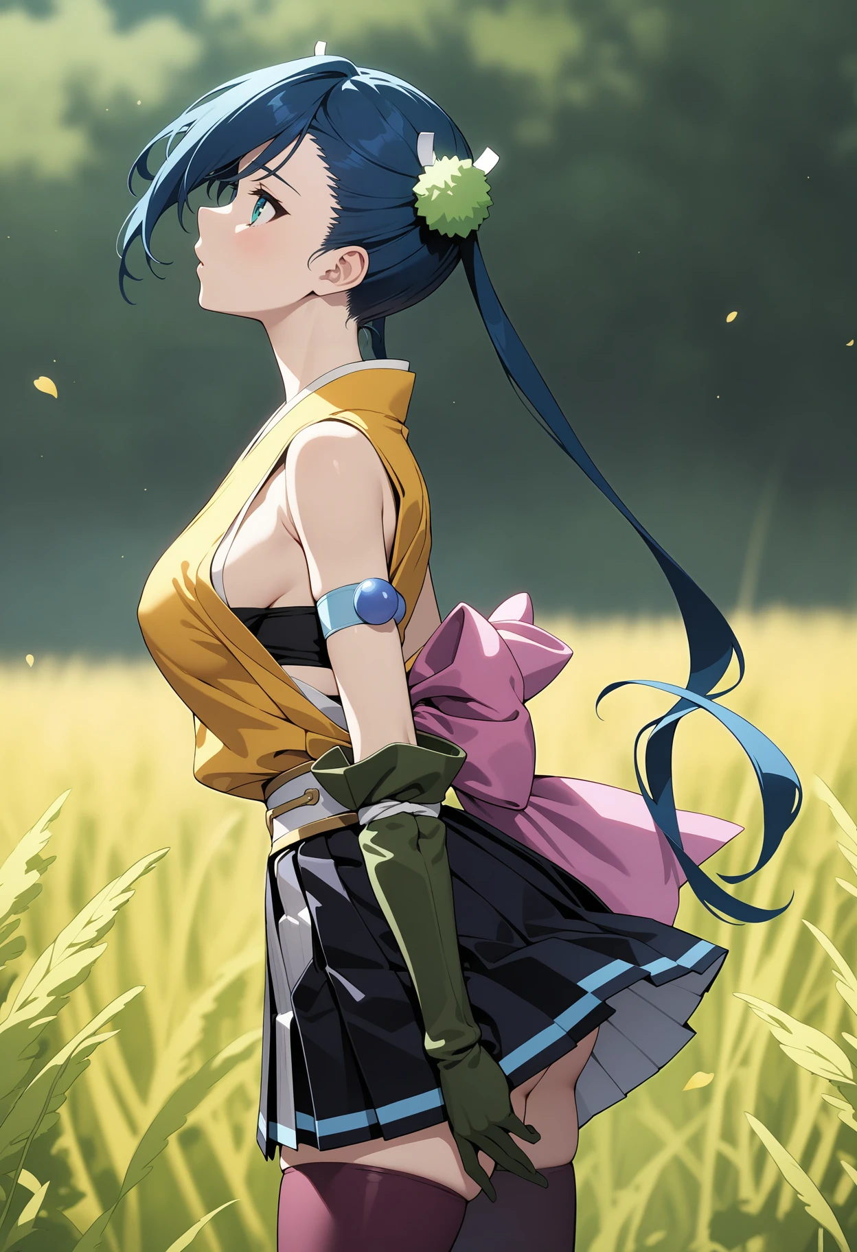 aahibachi, long hair, blue hair, twintails, hair ornament, aqua eyes, breasts, japanese clothes, yellow shirt, sleeveless, armband, green gloves, white belt, pink bow, pleated skirt, black skirt, purple thighhighs