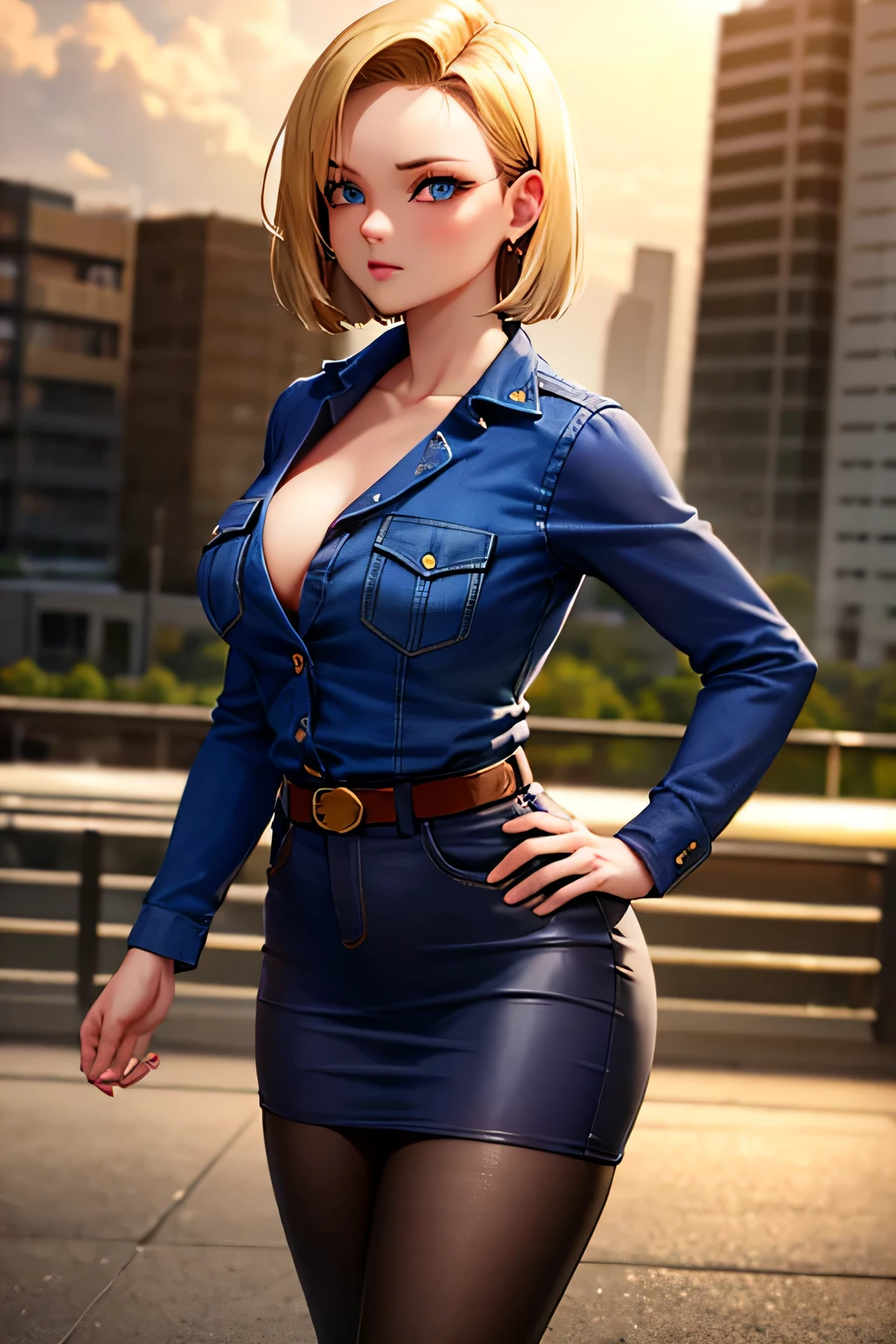 Appearance:android 18, blonde hair, blue eyes, eyelashes, hoop earrings, short hair, earringsOutfit:belt, black legwear, black shirt, breast pocket, cleavage, collarbone, denim, denim skirt, high-waist skirt, jewelry, long sleeves, pocket, shirt, shirt tucked in, skirt, striped, striped sleeves, waistcoat,